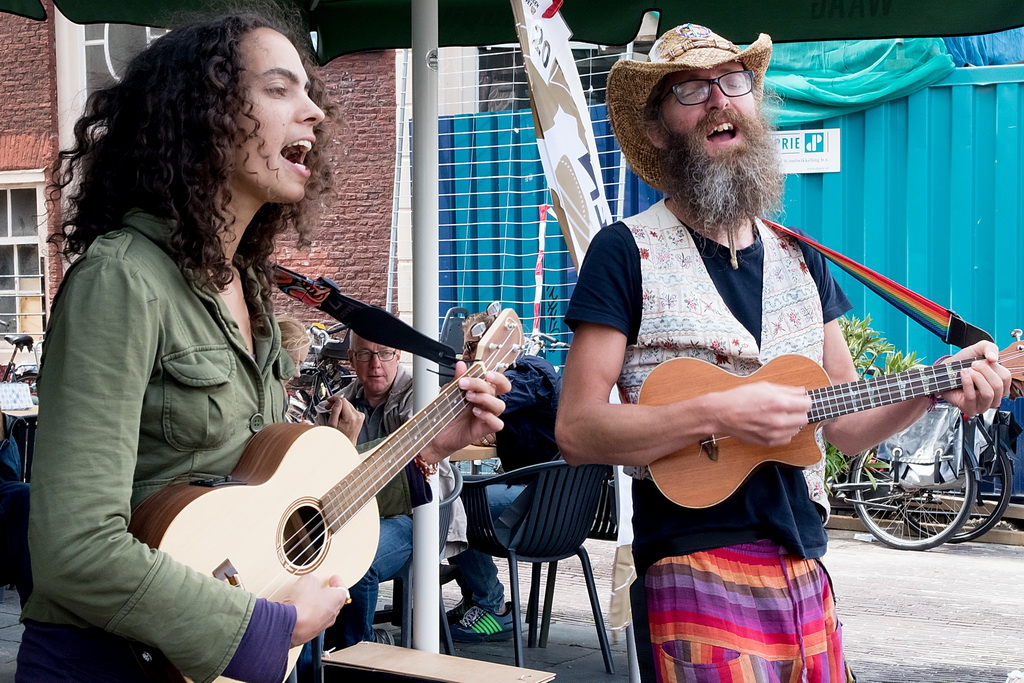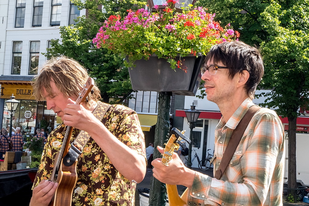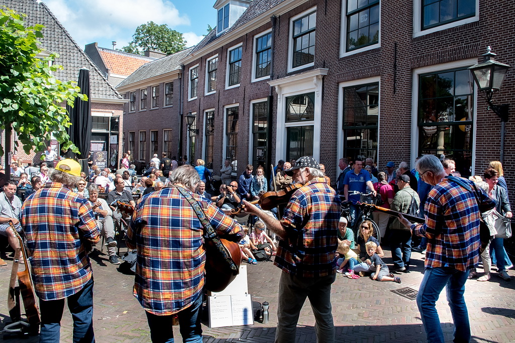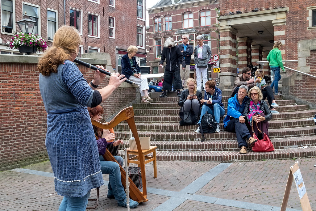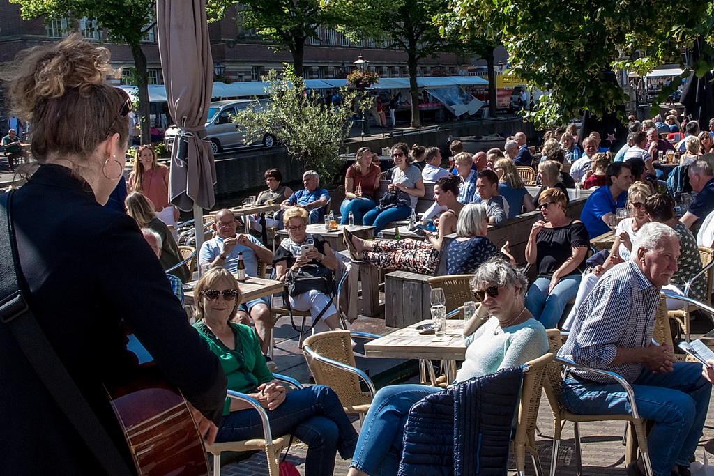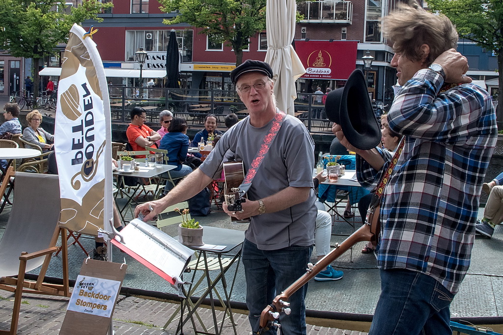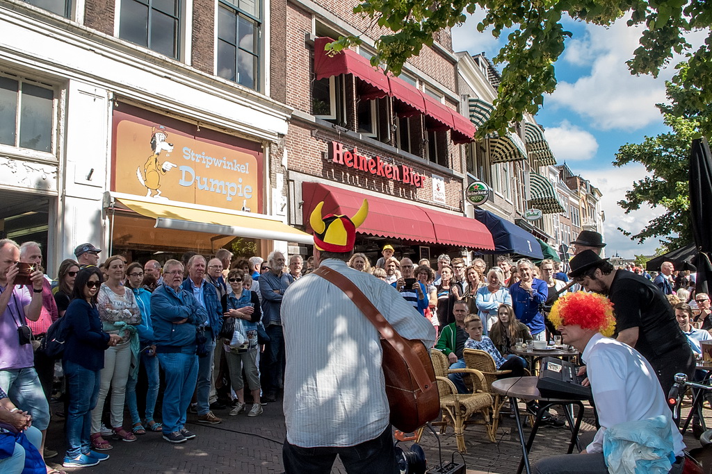 Wat weer opviel, is dat Leiden zich niet heel erg veel gelegen laat liggen aan festivals. Ook nu kruisen fietsen dwars door optredens heen, maar ook scooters (aan de hand met de motor aan). Bij Palaver, Lanyok en Eldorado stoorde dat. Het is al lastig om publiek te laten stoppen en vast te houden. De Kelvinators kunnen er best iets van, maar op de Nieuwe Rijn kostte het moeite mensen tot luisteren te bewegen. Waar ‘m dat in zit? Aan de overkant bleven mensen wel staan bij de Schwarzwalderkirschband. Maar die spelen met z’n drieën, gekleed in Lederhosen, dan ook meedeiners. Aan kwaliteit ligt het niet. Iets als HK30 dat prachtige klezmer speelt, had baat bij het steegeffect: minder geluid én lagere passeersnelheid waardoor hun vrolijk-melancholische muziek je in de kraag kon vatten.