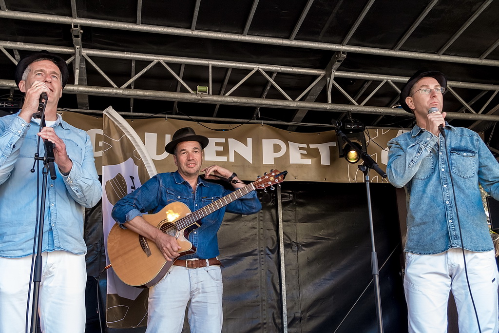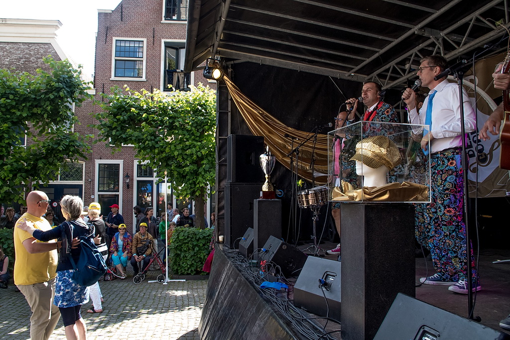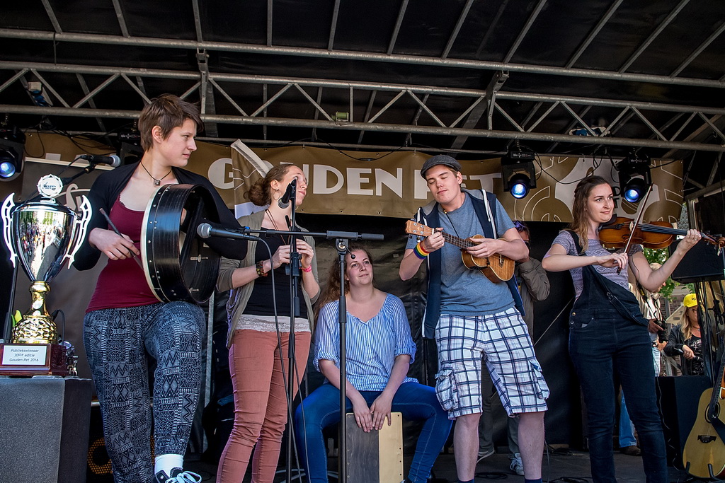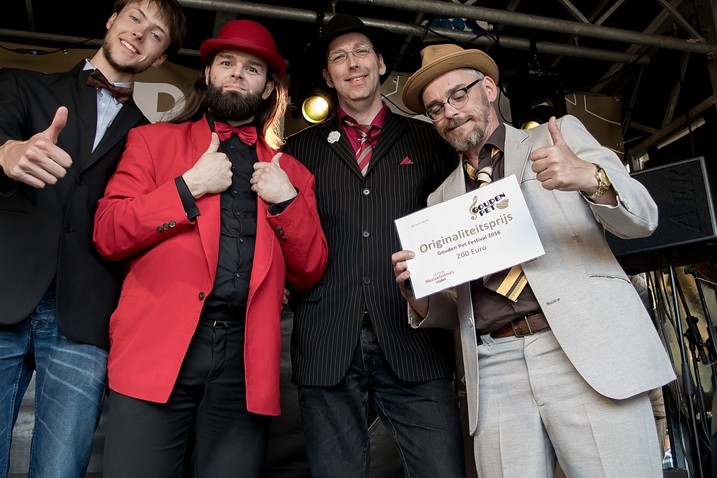 De Gouden Pet is een festival van ‘muziek op straat’, soms onvergelijkbaar: de solo-artiest tegenover de band, maar ook de sobere tegenover de showmens. De beste combinatie, in dat opzicht, was Originaliteitsprijswinnaar Charles Darwin Selection, die perfect aangekleed ook nog eens puike akoestische muziek maakten van ragtime tot jodel-country “en da’s een doodzonde volgens ons”. Als het aankomt op originaliteit is Haasnoot&Van Kempen vast en zeker ook een kandidaat (geweest) met niet alleen een zangeres die qua kleding zó uit de jaren zestig leek te zijn gestapt, maar vooral ook vanwege hun uitermate originele teksten en muziek: “kip met appelmoes” (is blues) of de vraag “wat de wind doet als het niet waait”. Of Kommer&Kwel die ook nog eens uitstralen wat ze zingen: melancholie. Je moet er van houden, maar dan ís het ook keigoed (voor miezerig regenweer, minder voor stralende zon).