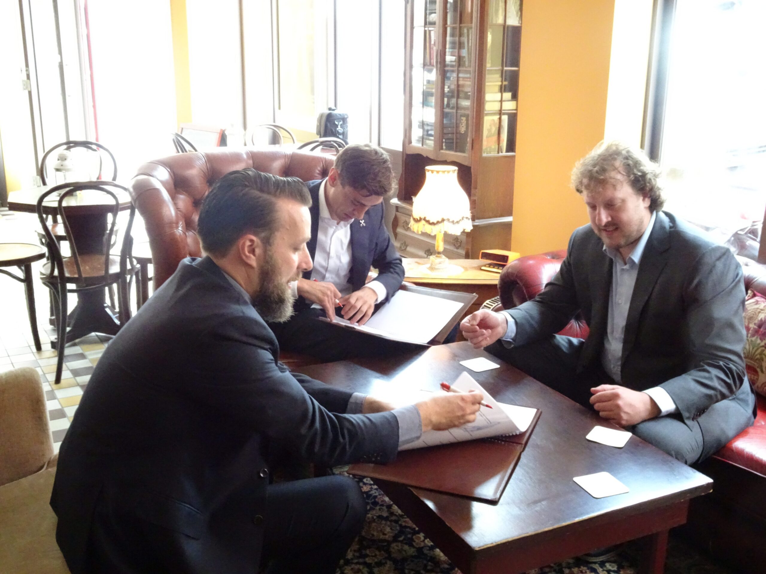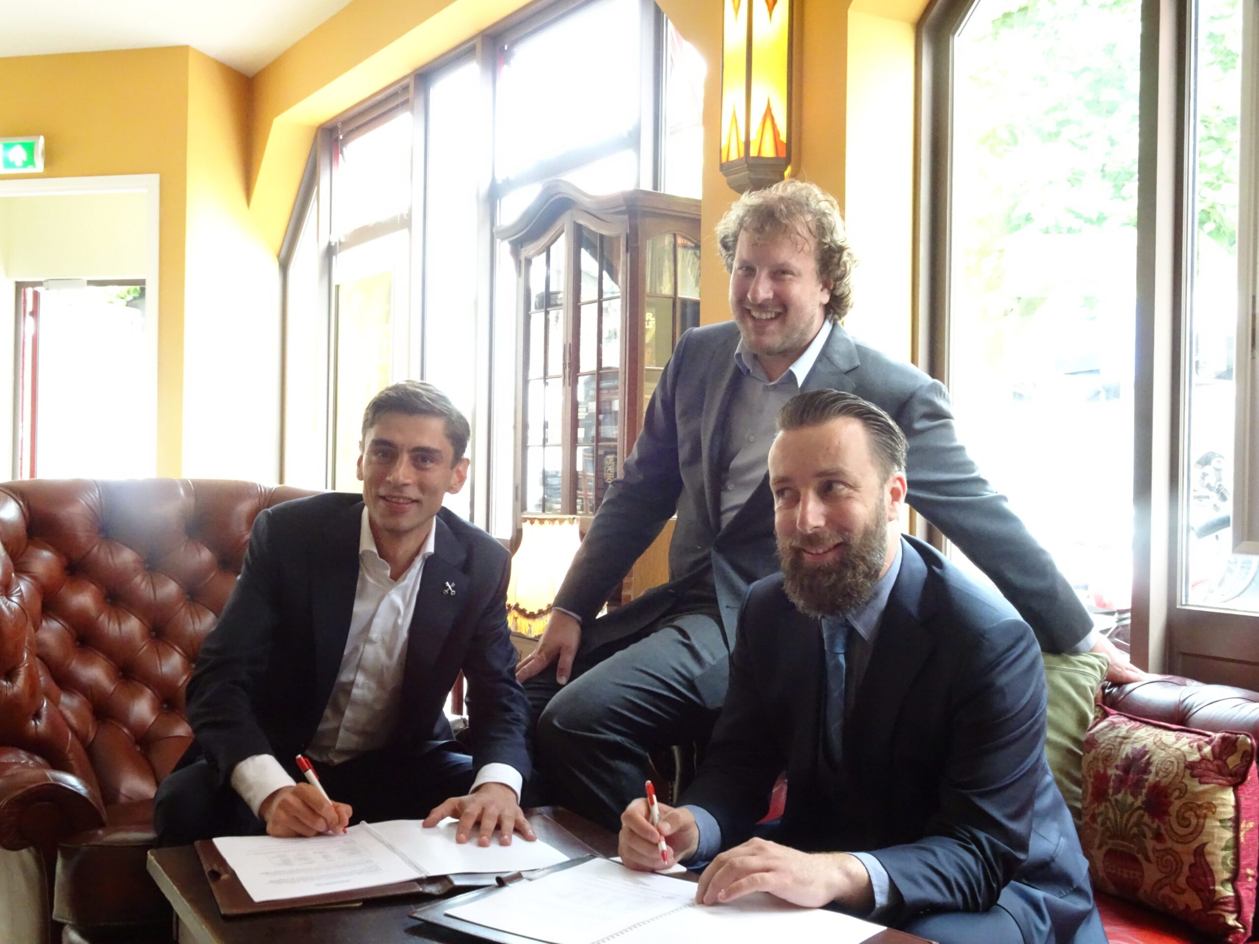 De eigenaren van de Leidse bioscopen Govert de Kok en Gideon Boer tekenden samen met bouwwethouder Paul Laudy het koopcontract voor de grond en panden waar het nieuwe Kijkhuis gebouwd gaat worden. In zijn toespraak feliciteerde de wethouder hen met het mooie project en bedankte ze voor de goede samenwerking.