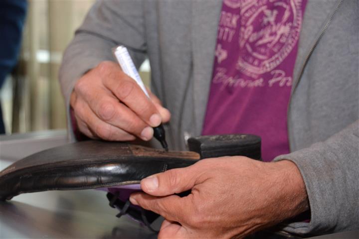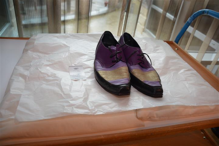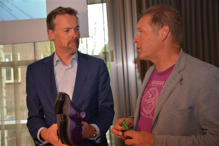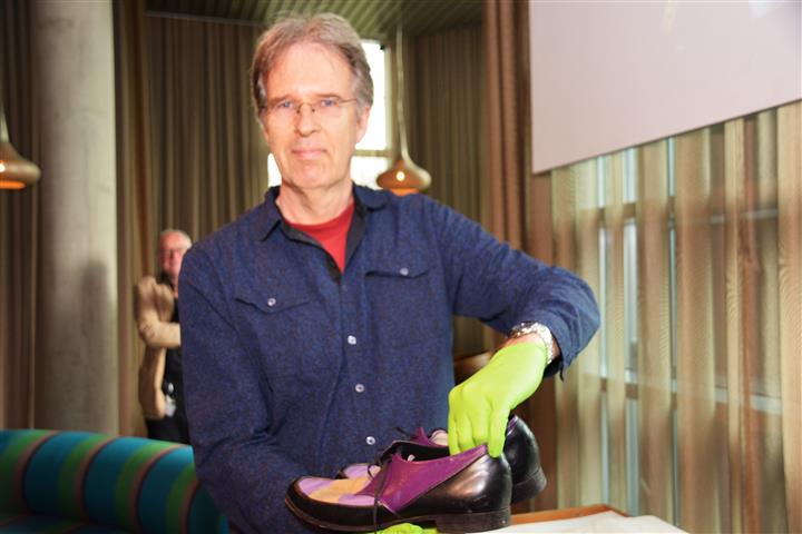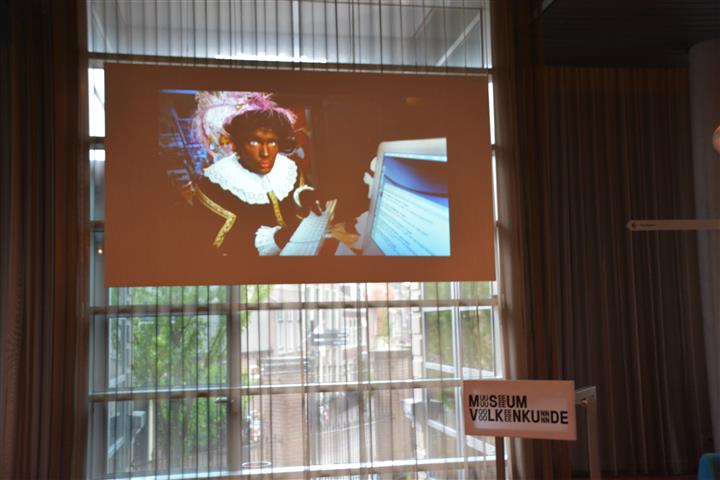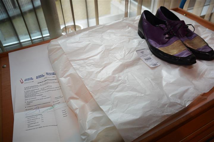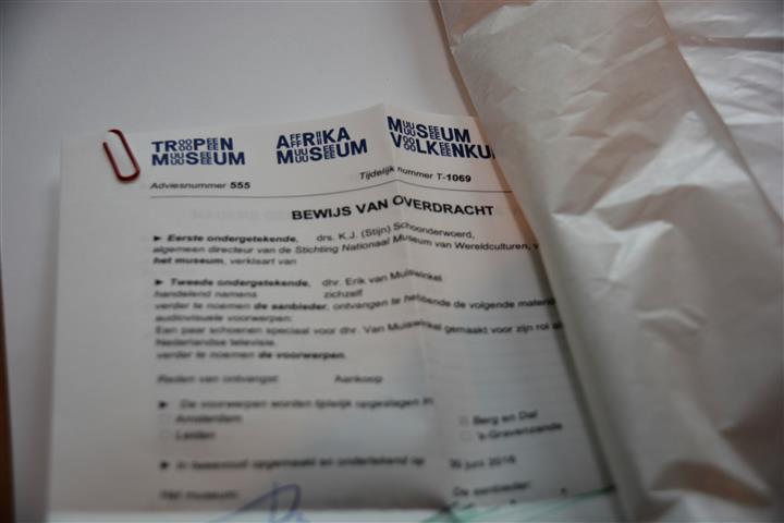 De directeur van het Nationaal Museum van Wereldculturen ontving vandaag in Museum Volkenkunde de schoenen van voormalig Hoofdpiet Erik van Muiswinkel. Op deze schoenen nam de cabaretier in zijn rol als Hoofdpiet de afgelopen jaren deel aan vele nationale Sinterklaasintochten.