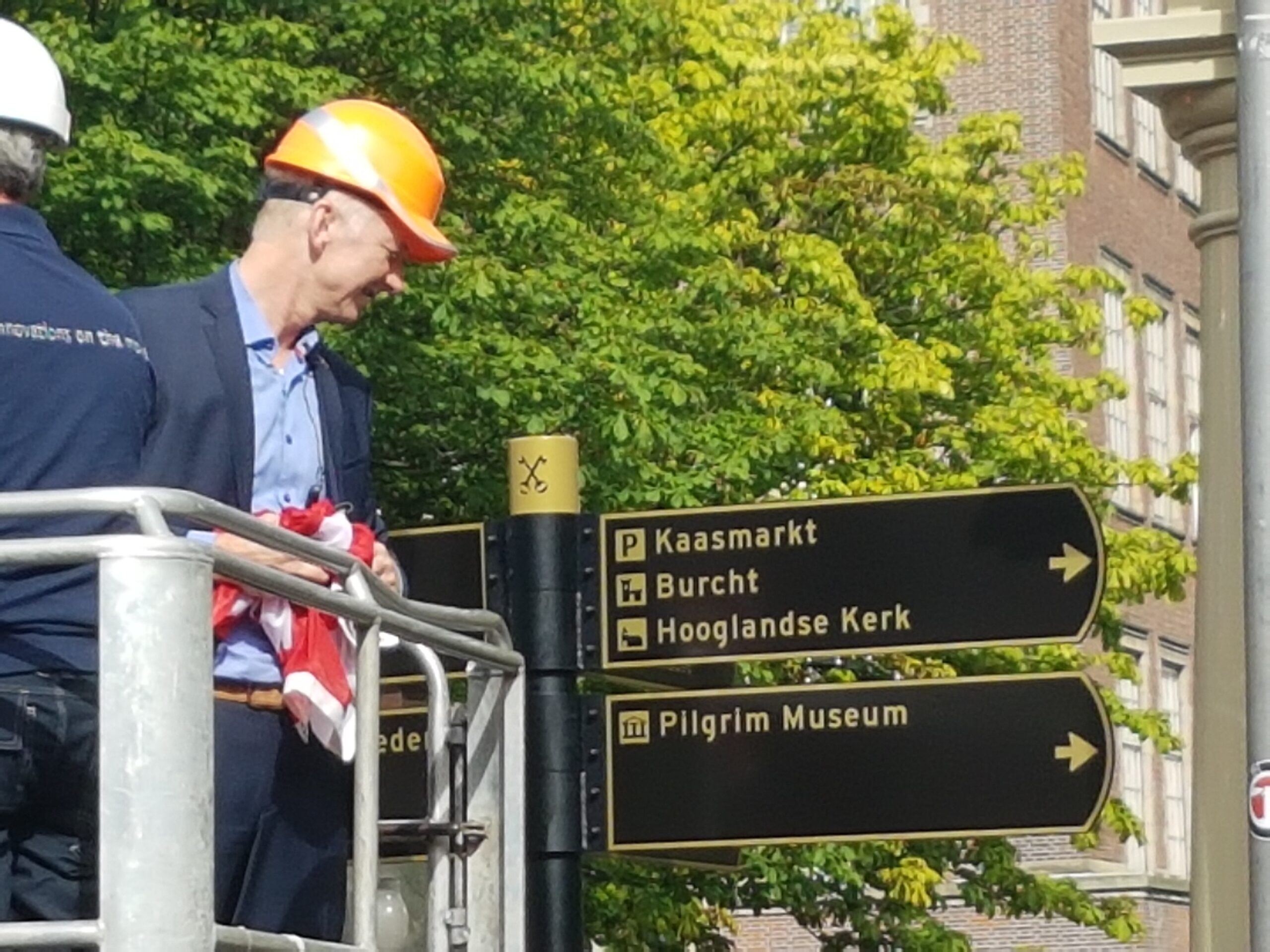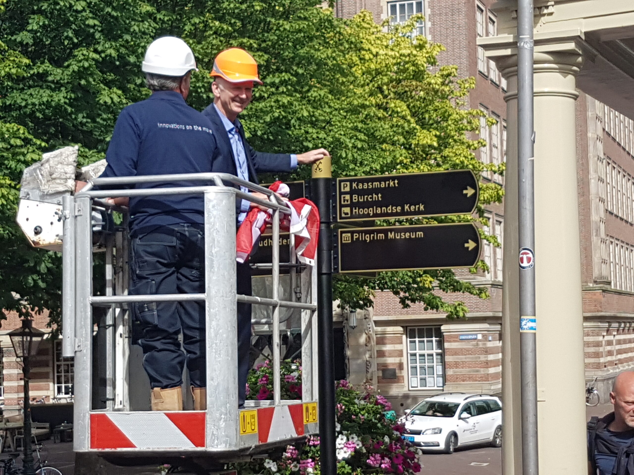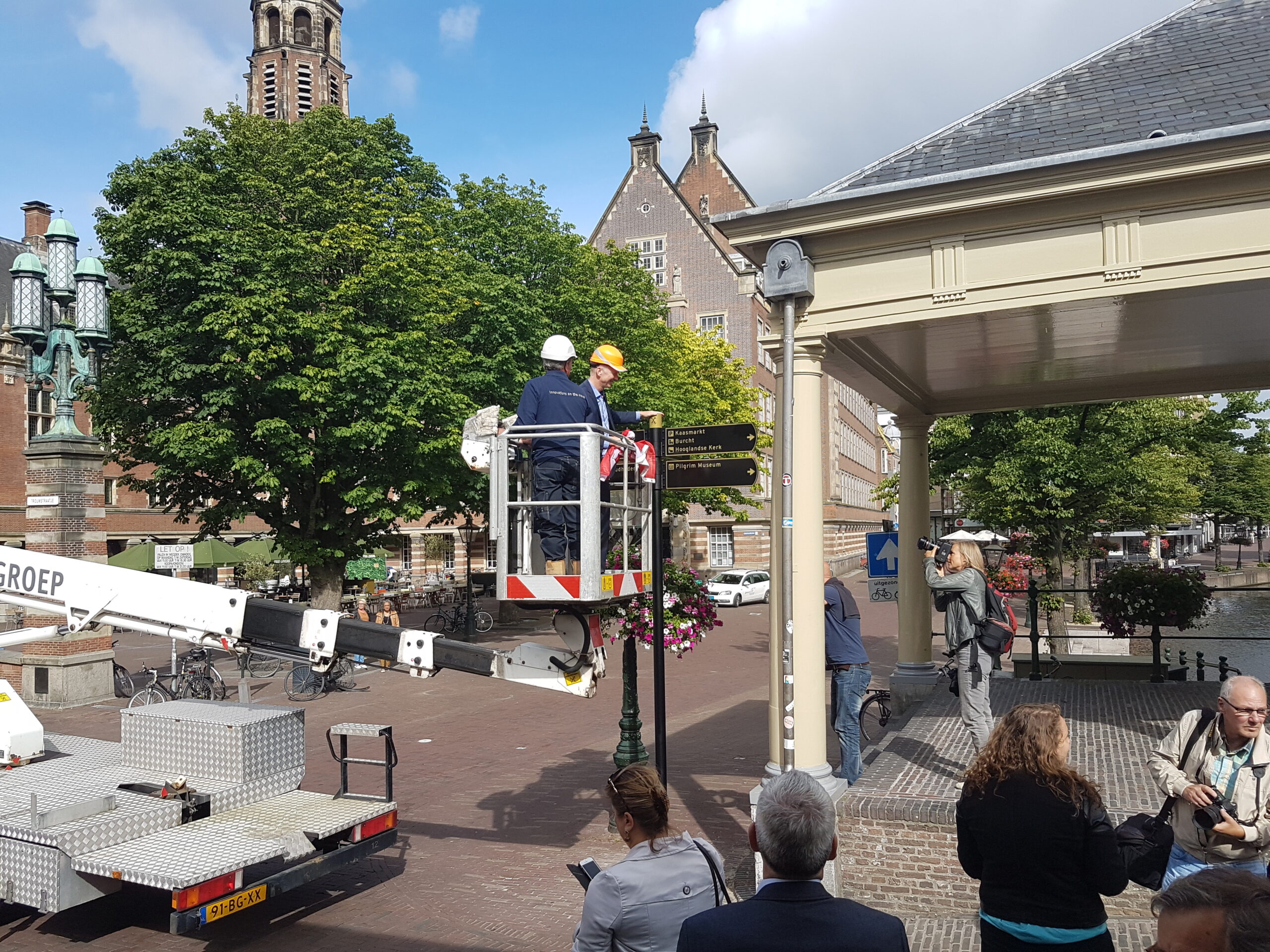 Wethouder Strijk heeft vanmorgen bij de Koornbeursbrug de eerste nieuwe Leidse wegwijzer officieel onthuld. Vanuit een hoogwerker trok hij eerst de Leidse vlag van de nieuwe paal en plaatste vervolgens de kop op de paal. Een goudkleurige dop met de Leidse sleutels.