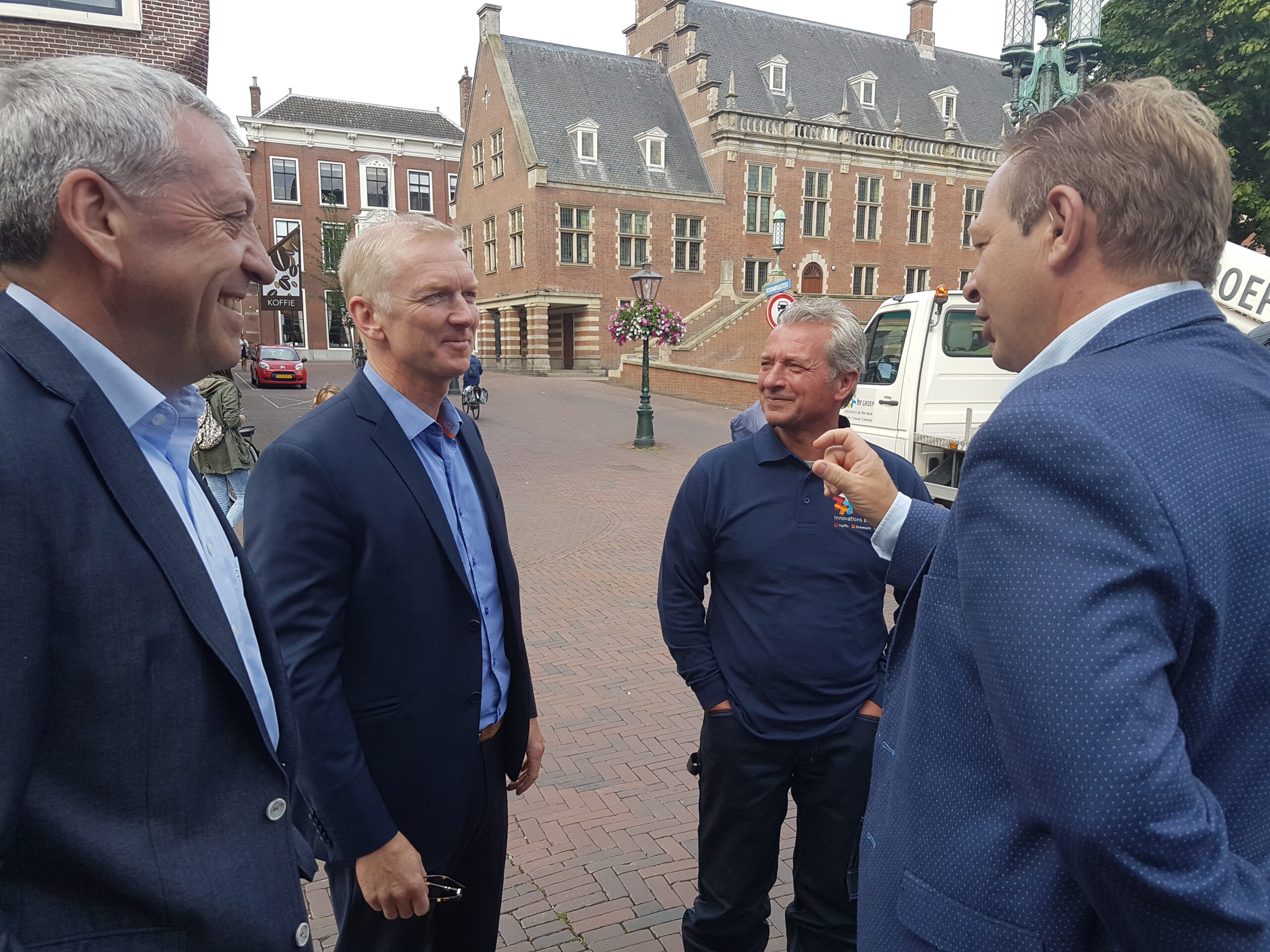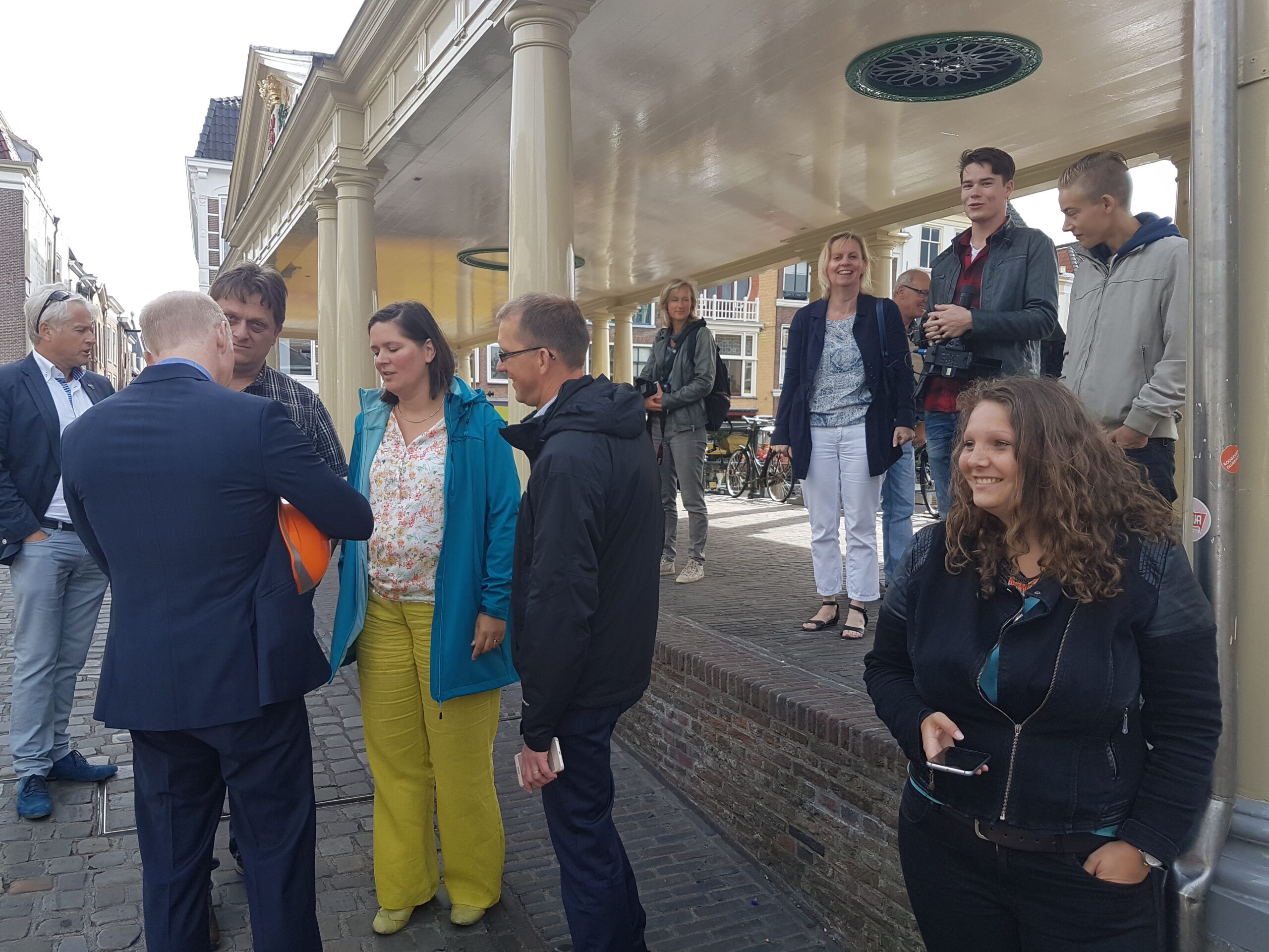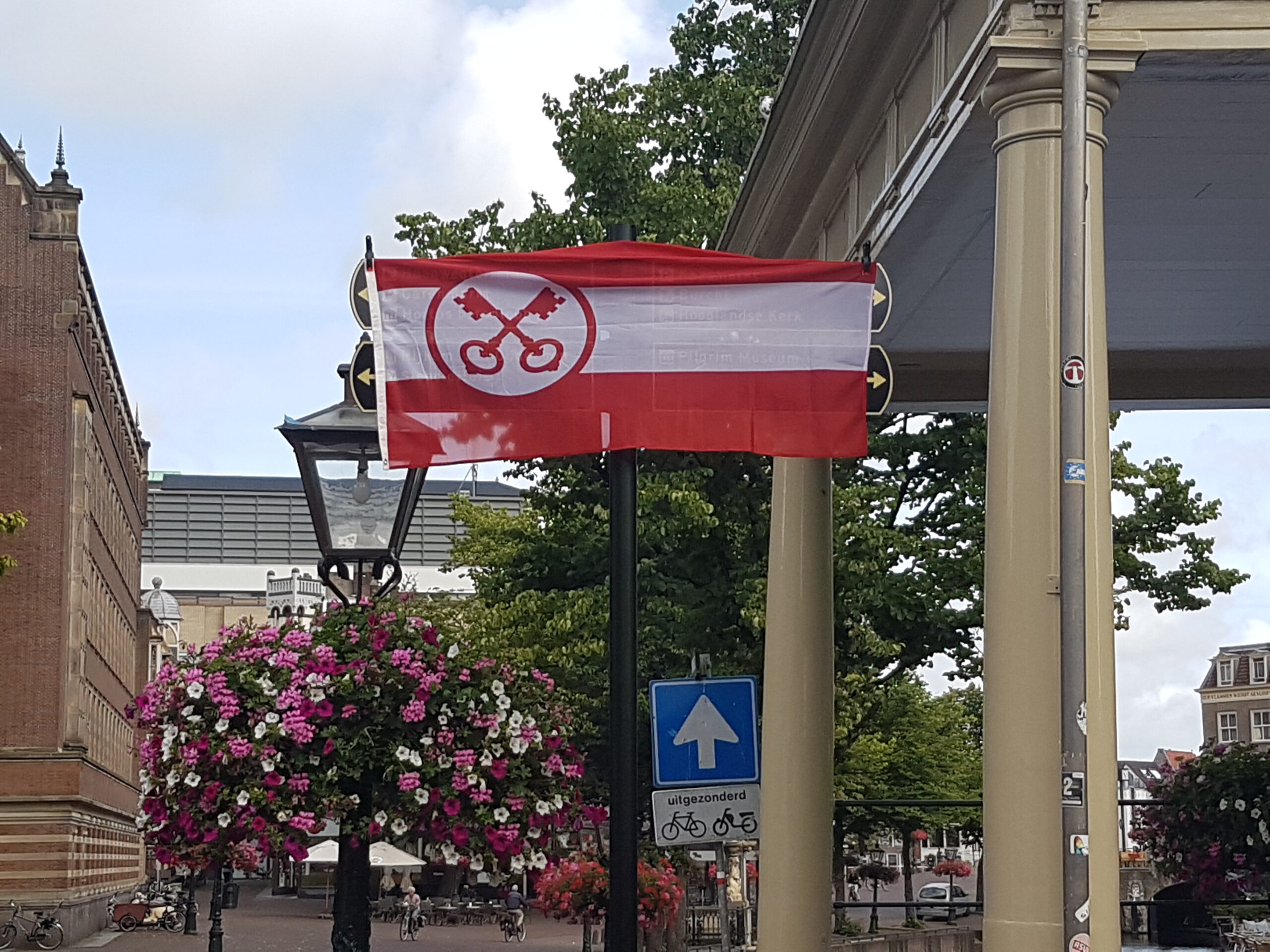 Wethouder Strijk heeft vanmorgen bij de Koornbeursbrug de eerste nieuwe Leidse wegwijzer officieel onthuld. Vanuit een hoogwerker trok hij eerst de Leidse vlag van de nieuwe paal en plaatste vervolgens de kop op de paal. Een goudkleurige dop met de Leidse sleutels.
