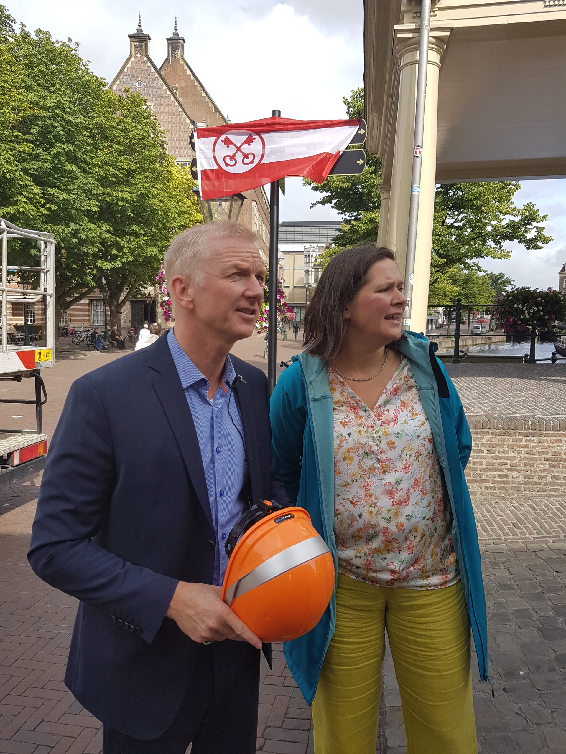 Wethouder Robert Strijk en VVD-raadslid Juliette Gilissen bij de eerste nieuwe paal.