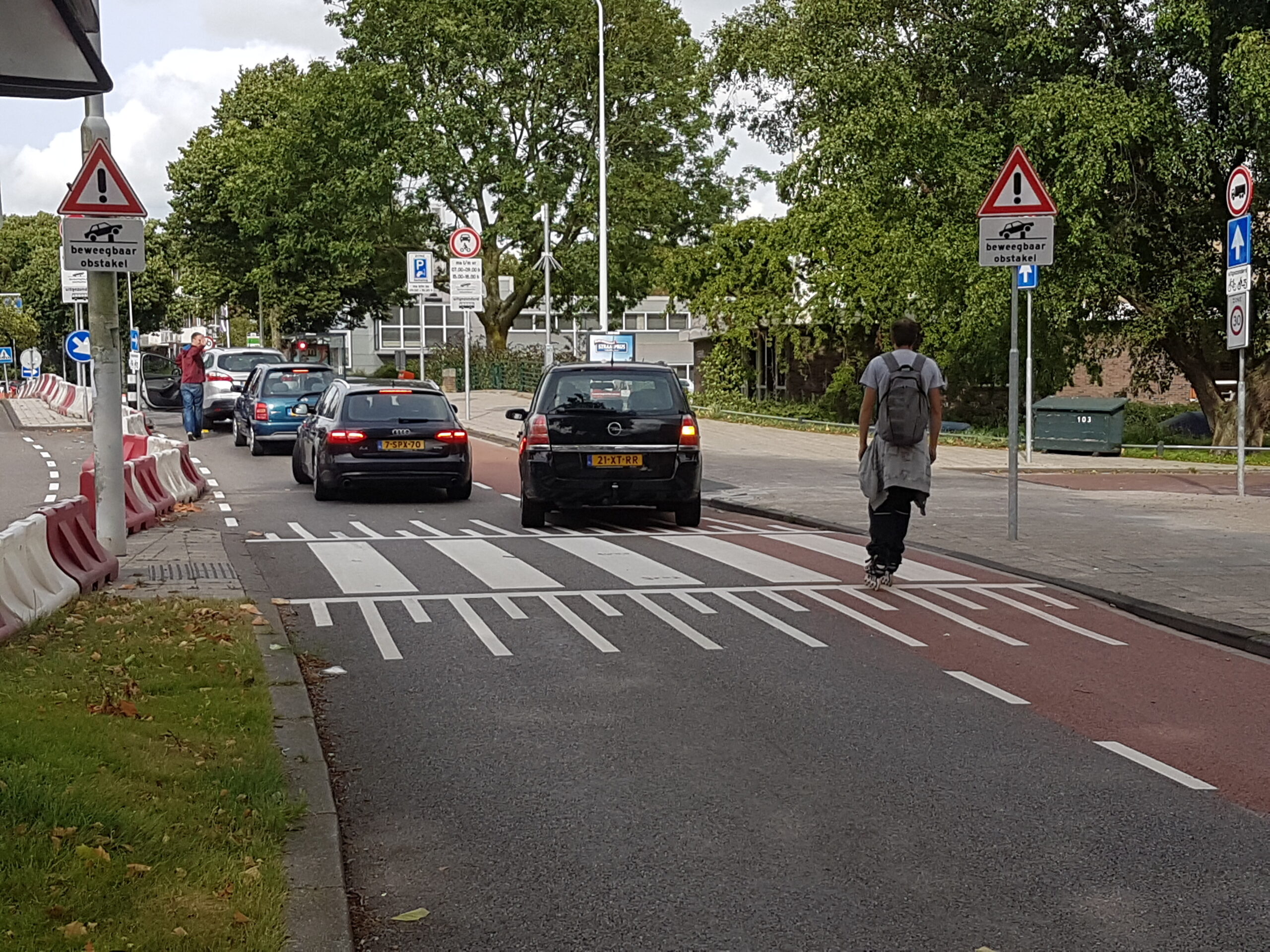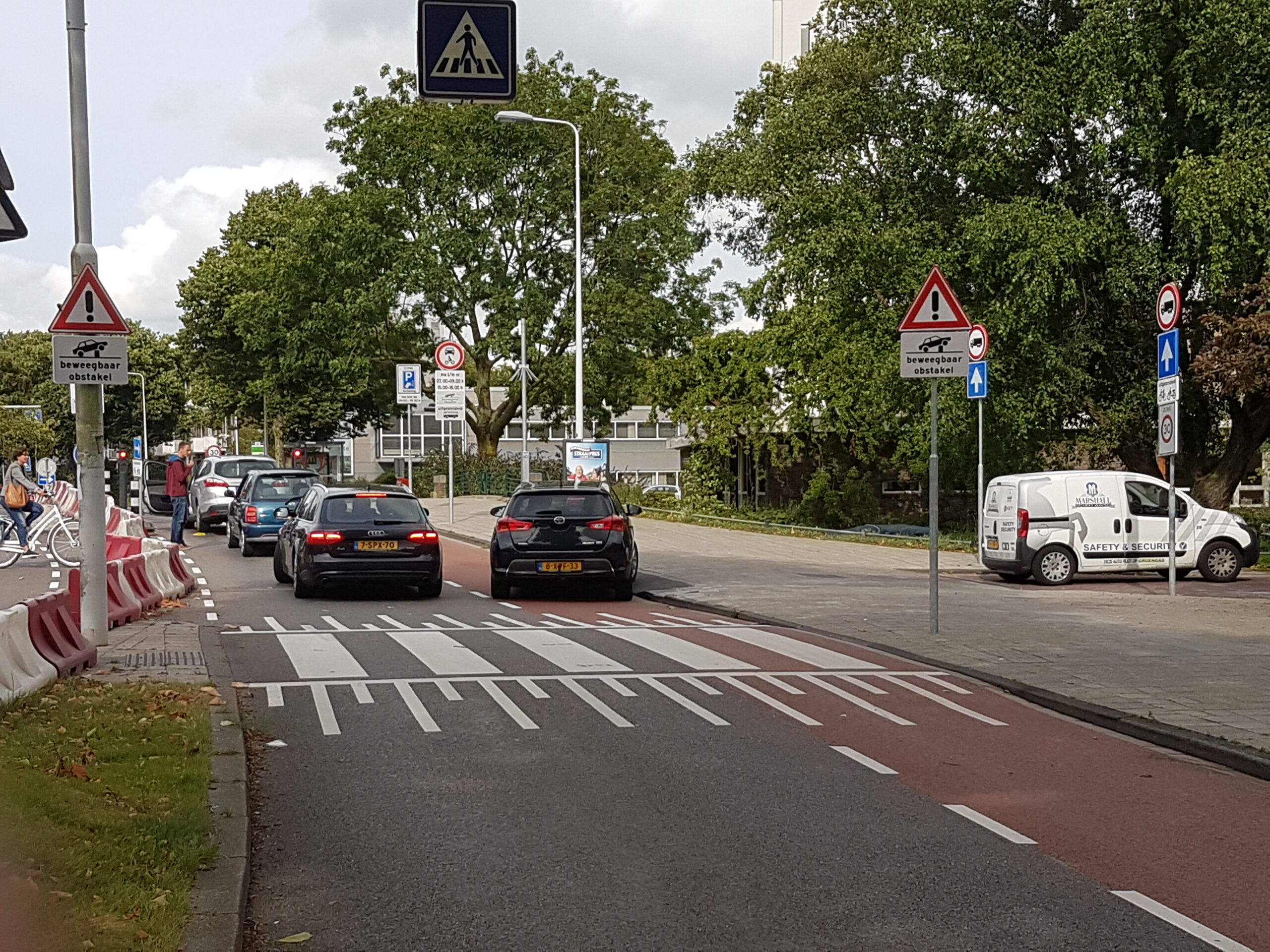 De VVD vindt die opstelling onbegrijpelijk. “Het komt er op neer dat het college zegt dat de automobilist zelf de oorzaak is van de files, maar als VVD denken we dat falend gemeentelijk verkeersbeleid daar de schuld van is,” laat Verbree vanaf haar vakantieadres weten. De partij ziet het beleid falen en daarmee de verkeersveiligheid juist afnemen. Automobilisten weten ook na maanden nog steeds niet dat de paal er staat en dat leidt tot files, omkerende en achteruitrijdende auto’s en boze bestuurders. Dat de VVD een punt lijkt te hebben, bleek toen we gisteren binnen enkele minuten onderstaande situatie vast konden leggen.
