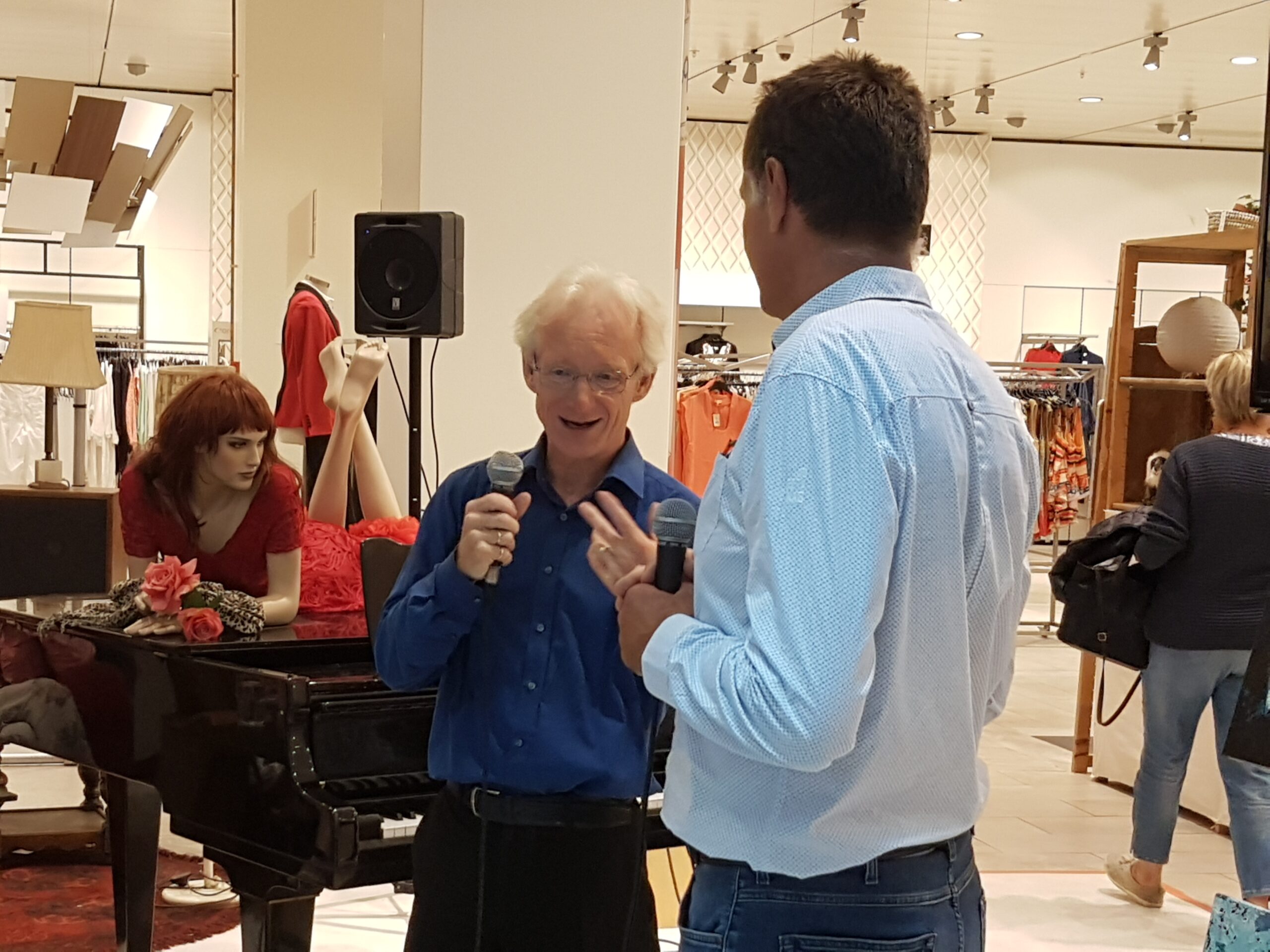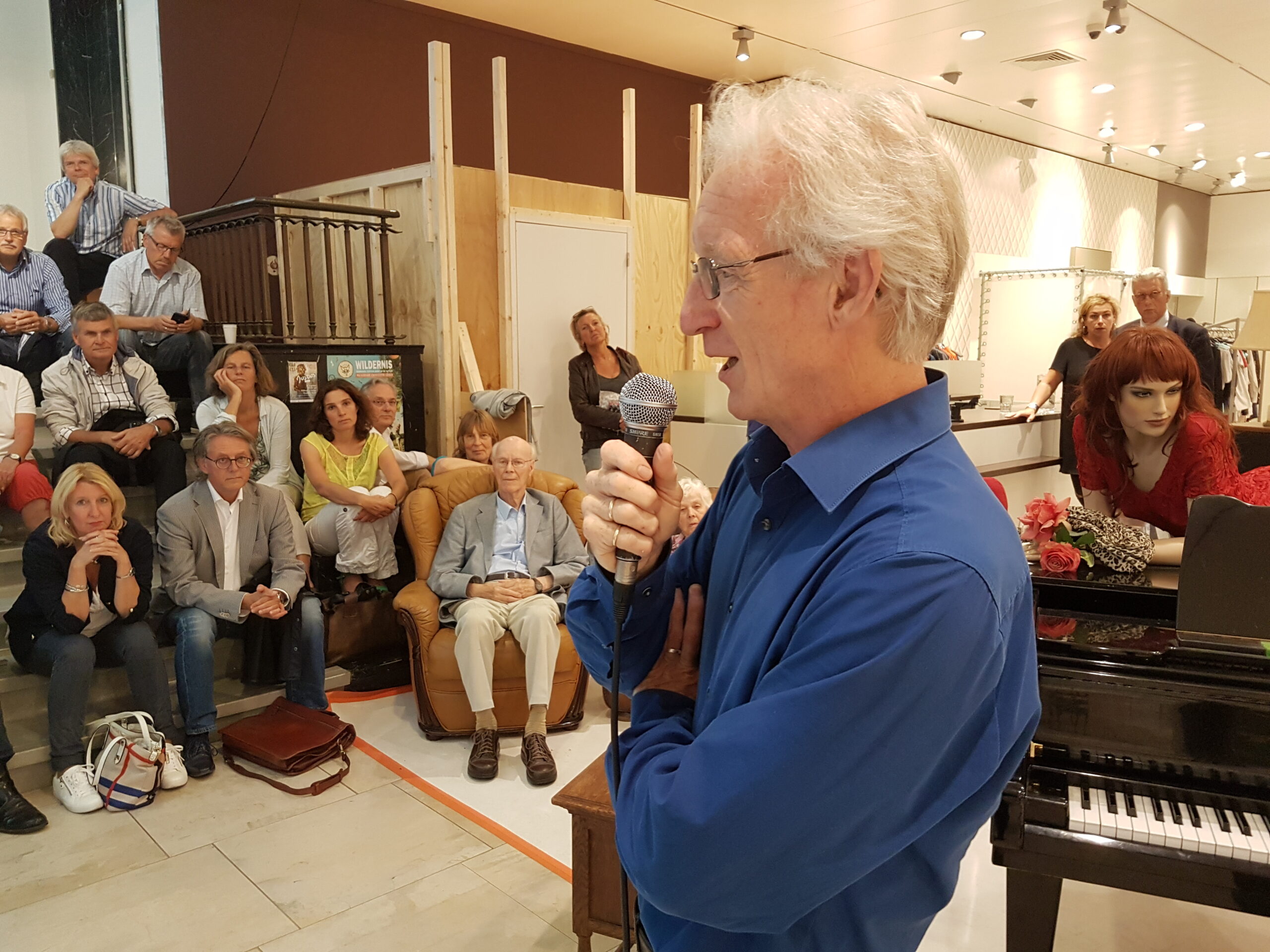 Chris de Waard in gesprek met Gijsbert van Es over zijn zomerserie gesprekken waarvan de laatste afleveringen worden gehouden in het Pop-Up Warenhuis Leiden.