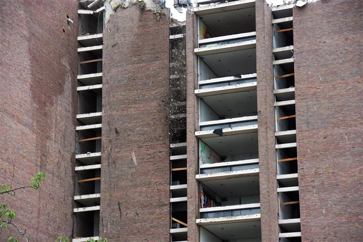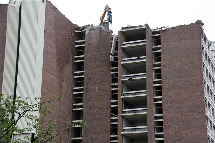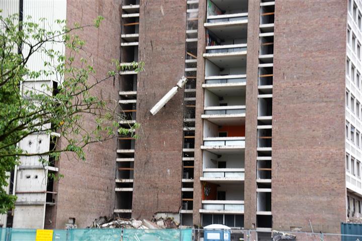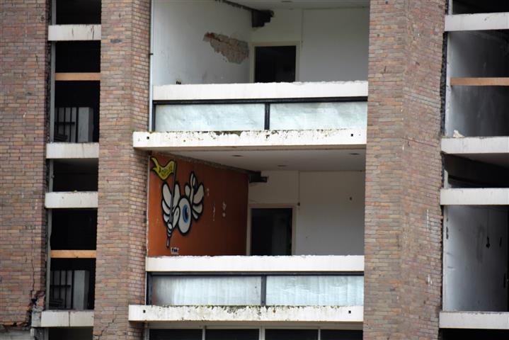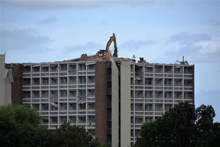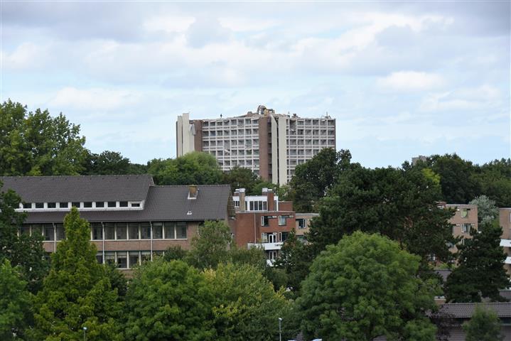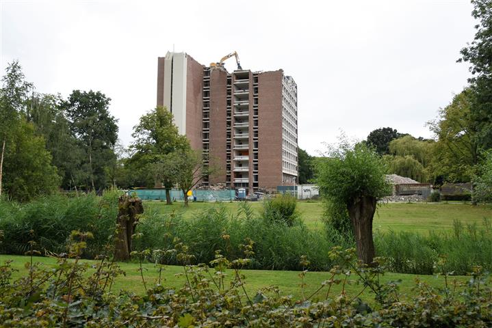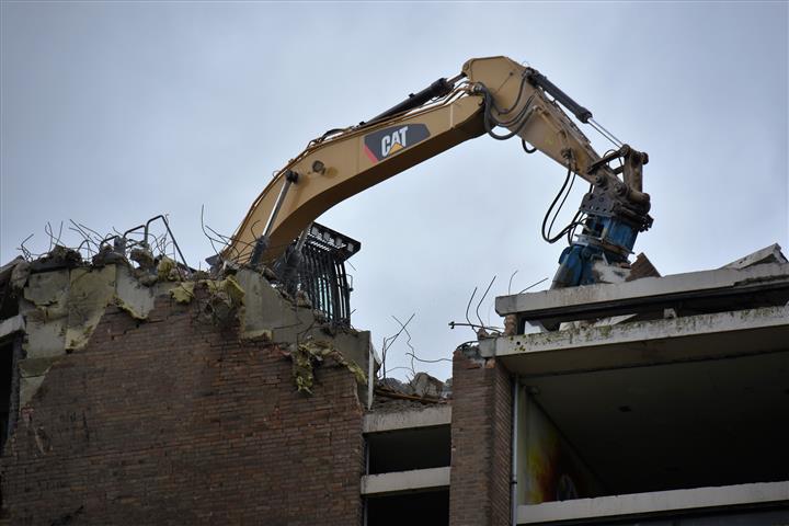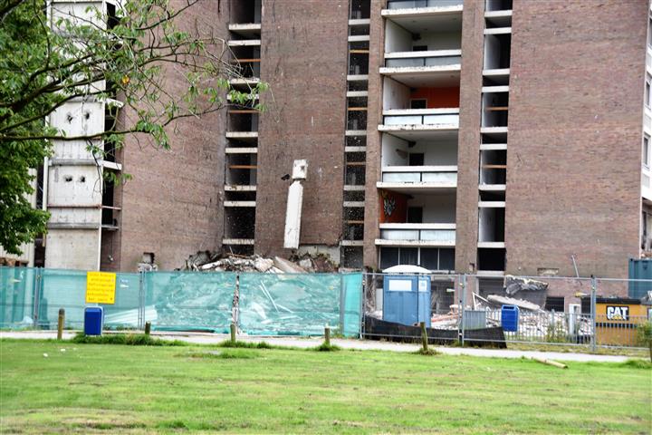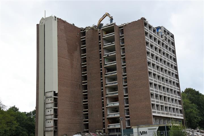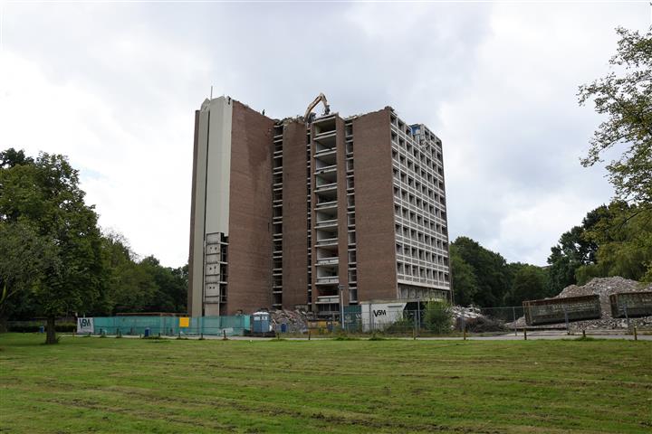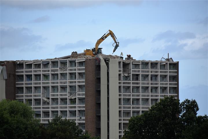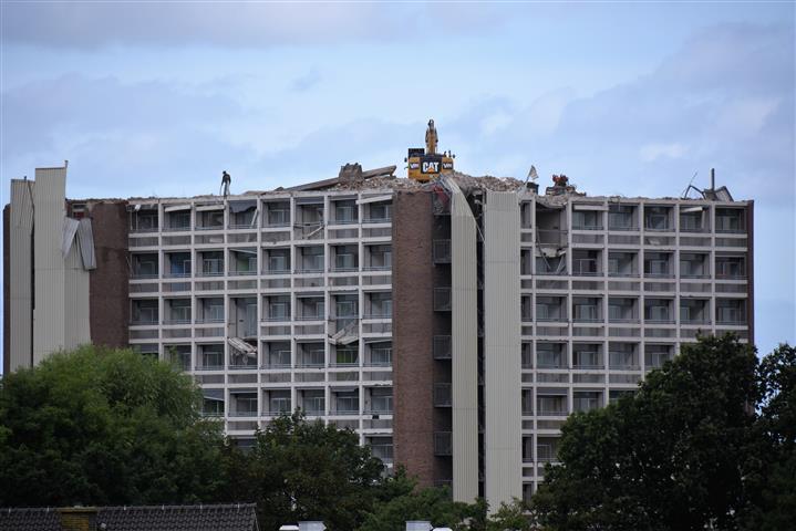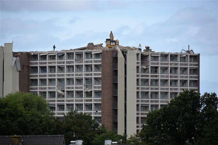 De voormalige zusterflat annex opleidingscentrum van het Academisch Ziekenhuis Leiden (AZL) wordt stukje bij beetje afgebroken, nadat de afgelopen periode de bijbehorende laagbouw al werd gesloopt. (Video: Emile van Aelst).