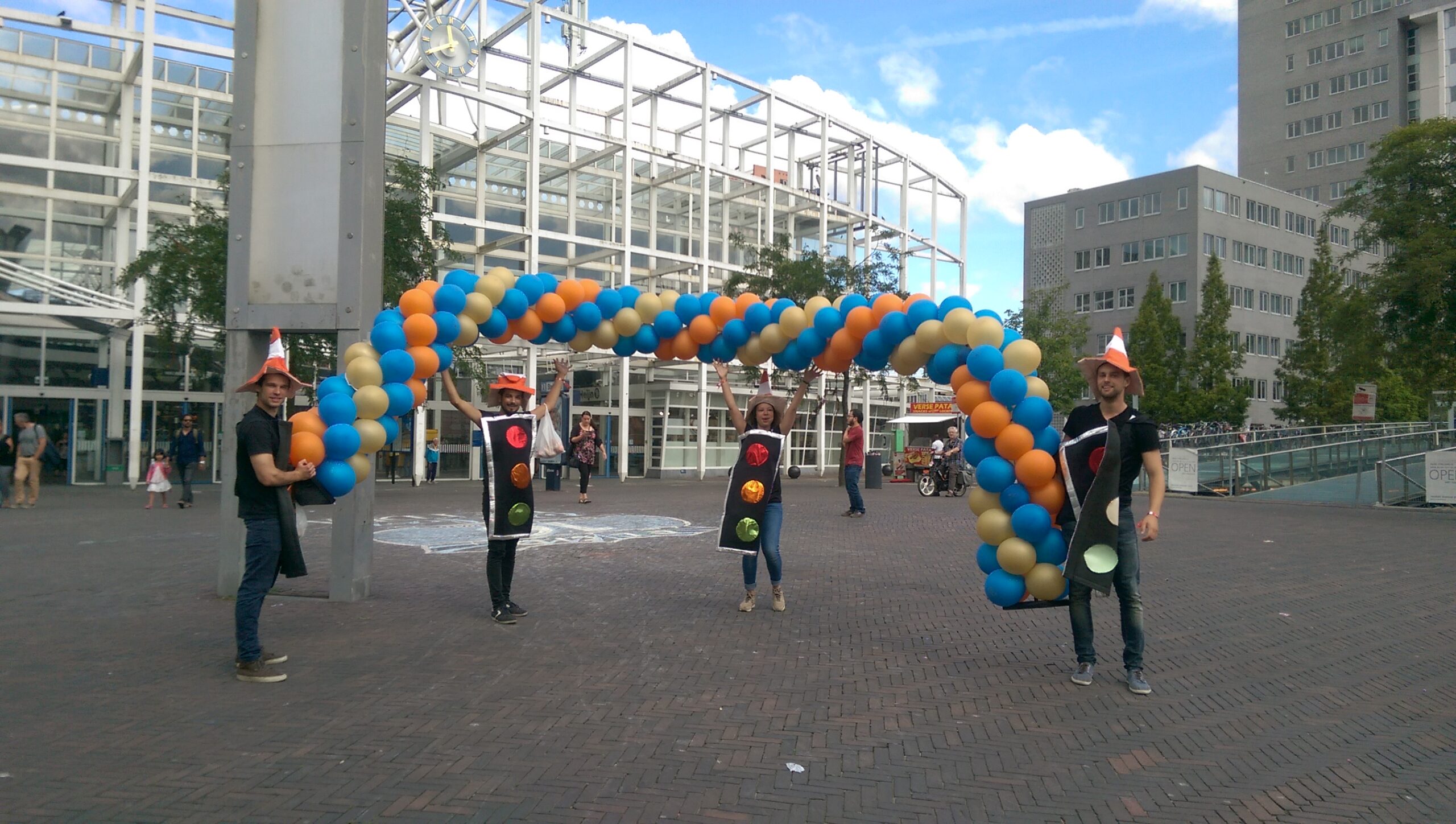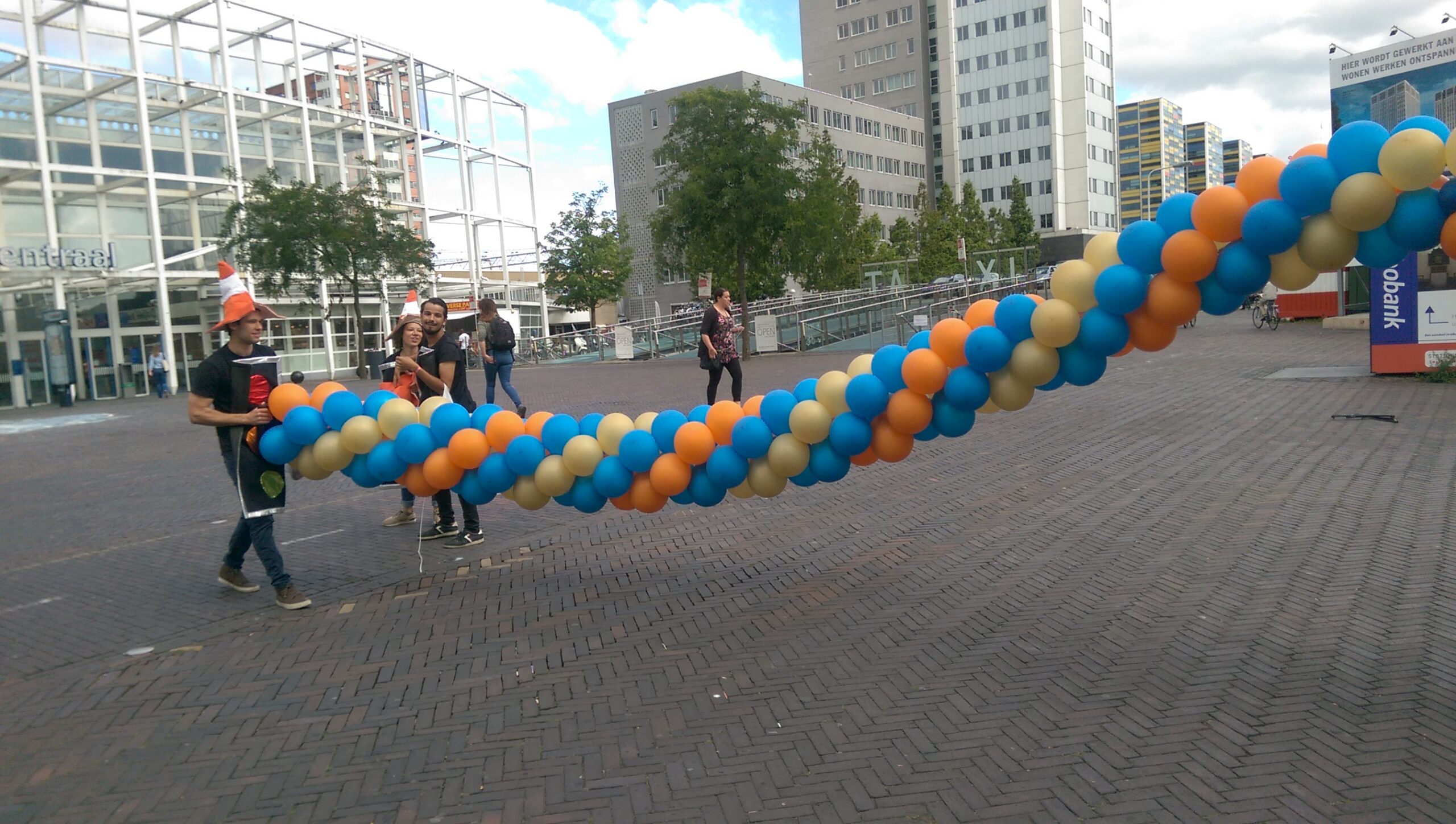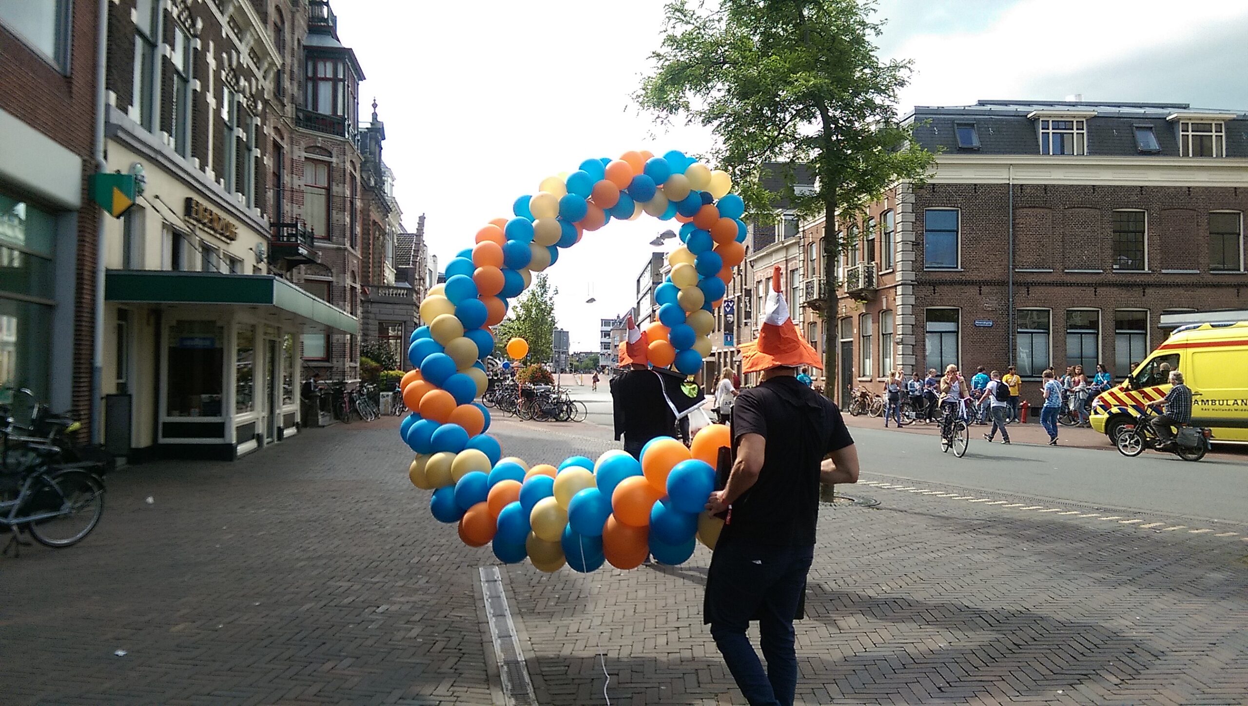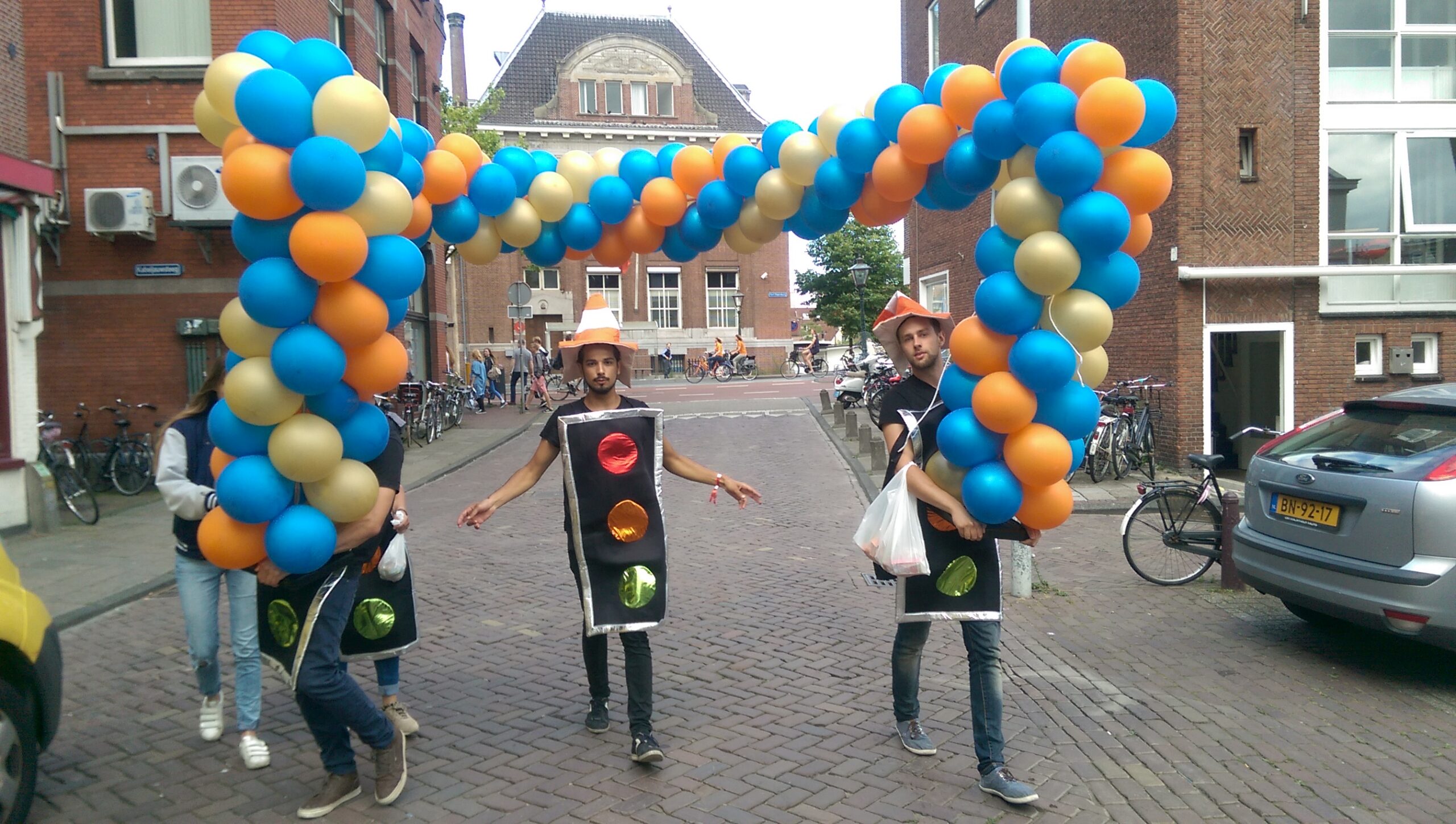 De commissie die volgend jaar de introductieweek organiseert staat al klaar in de startblokken. Deze week lopen ze mee om ervaring op te doen. Eén van hun belangrijke taken: de ballonnenboog van Leiden Centraal naar de Informatiemarkt brengen.