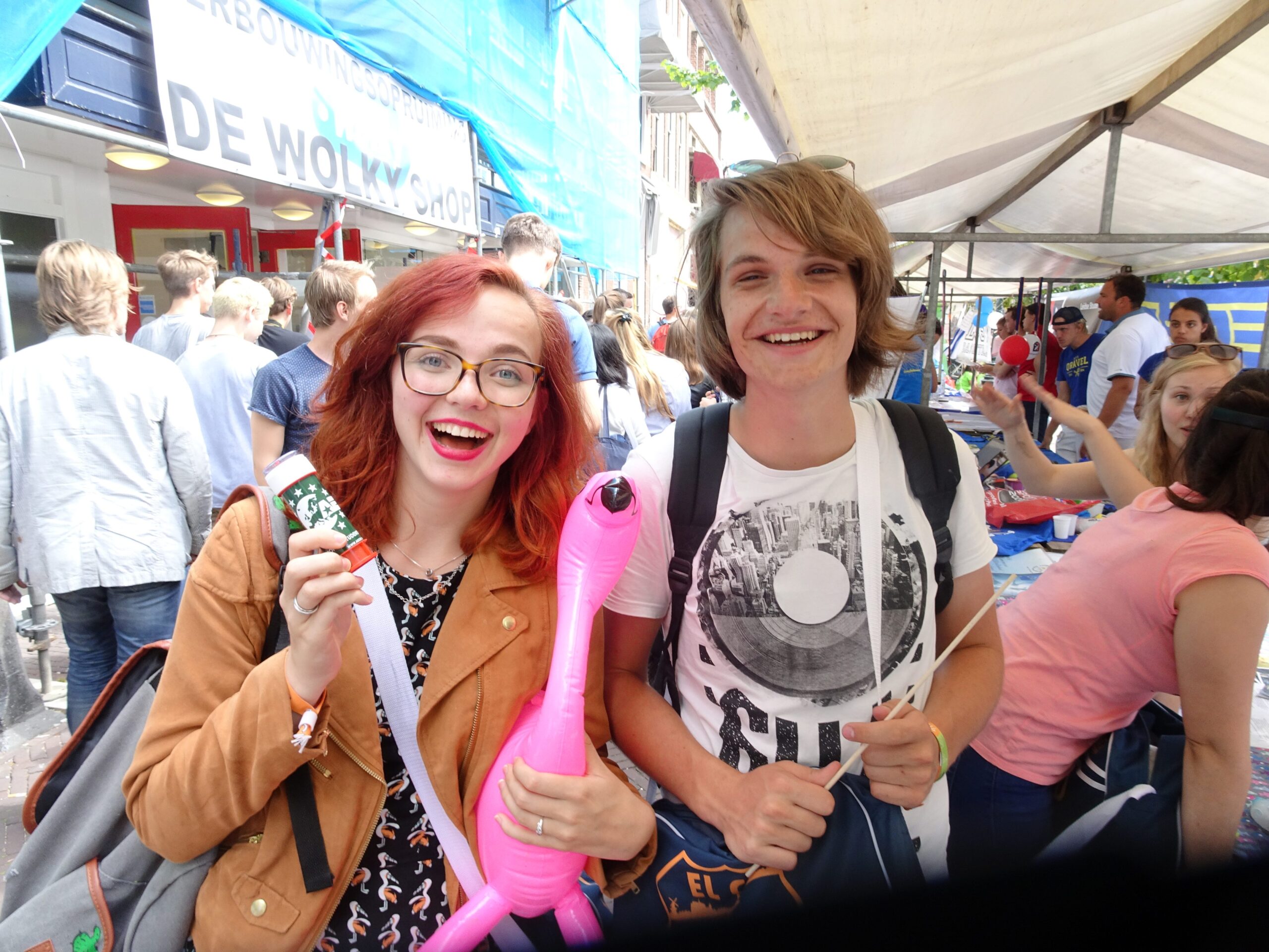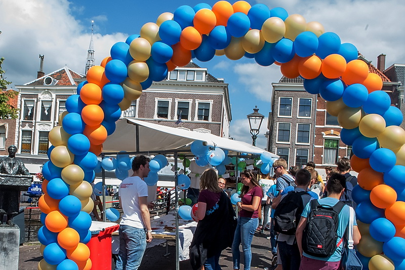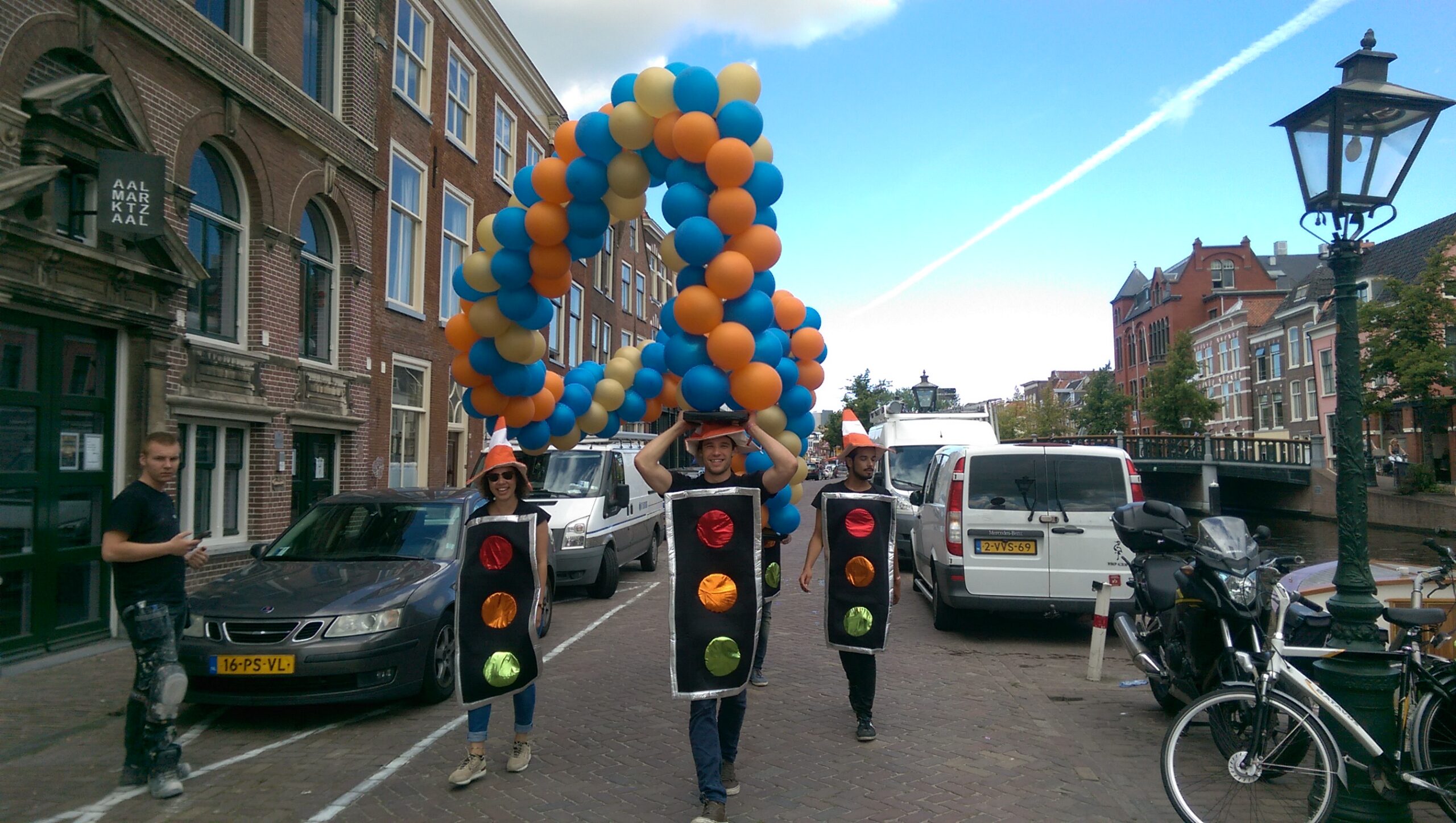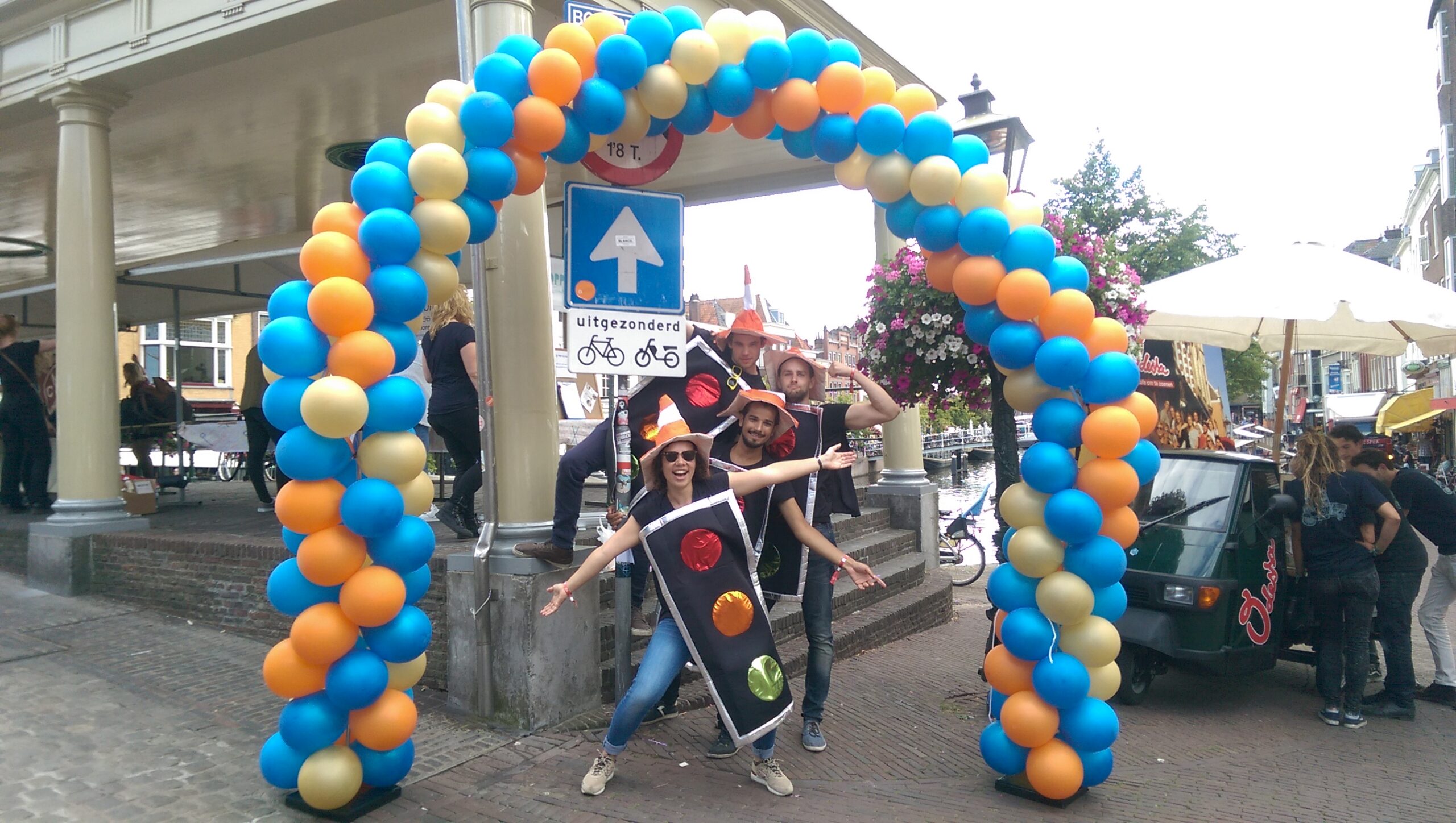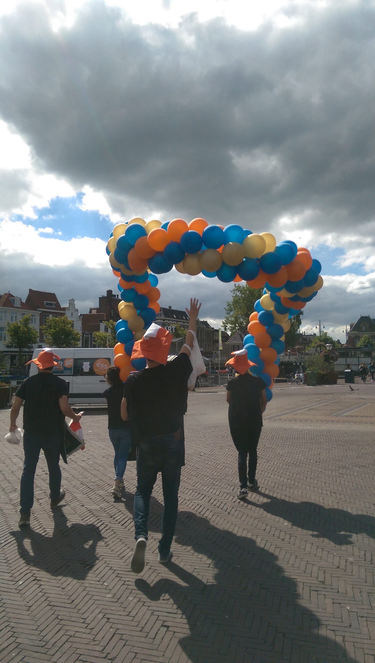 De commissie die volgend jaar de introductieweek organiseert staat al klaar in de startblokken. Deze week lopen ze mee om ervaring op te doen. Eén van hun belangrijke taken: de ballonnenboog van Leiden Centraal naar de Informatiemarkt brengen.