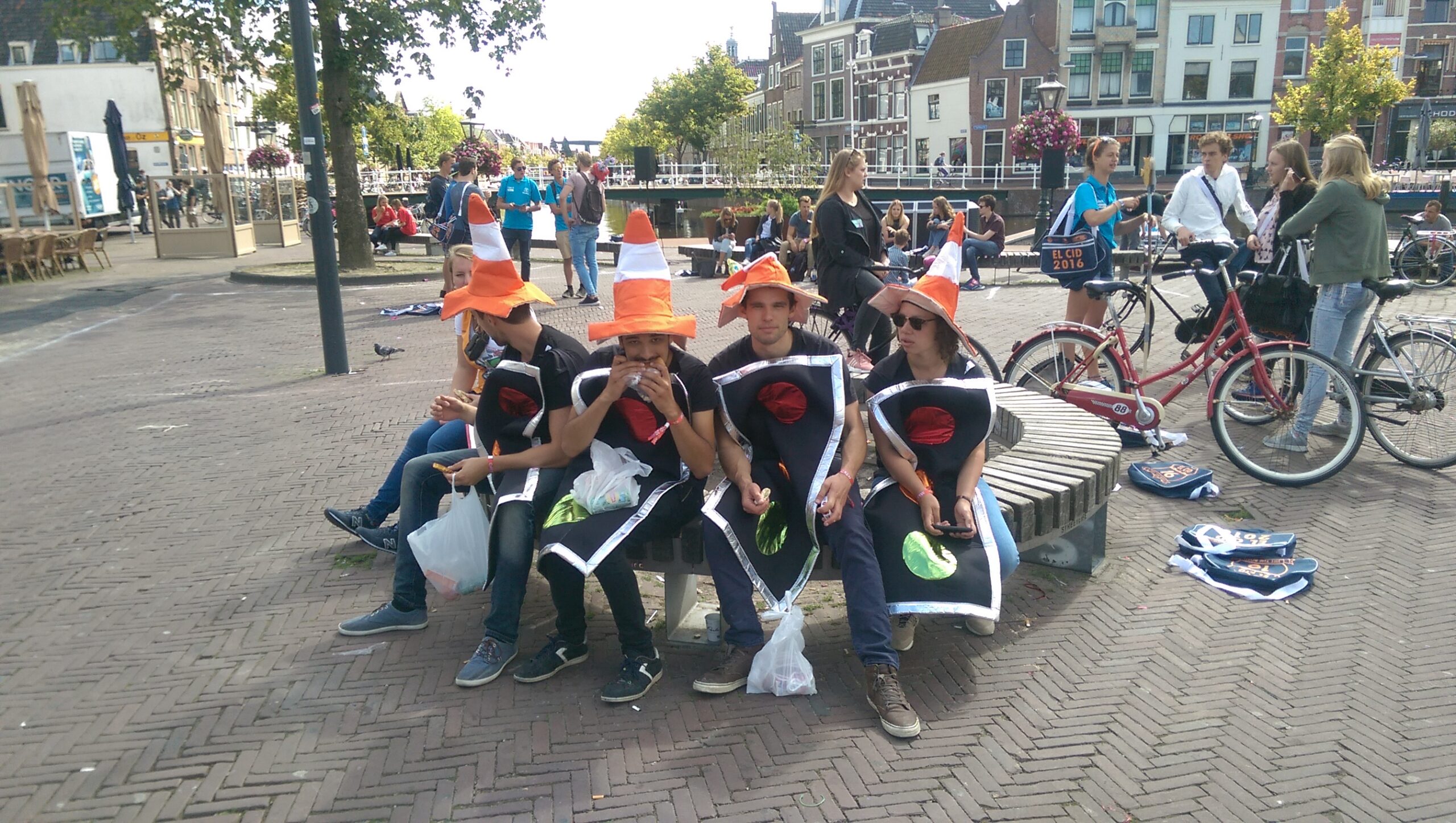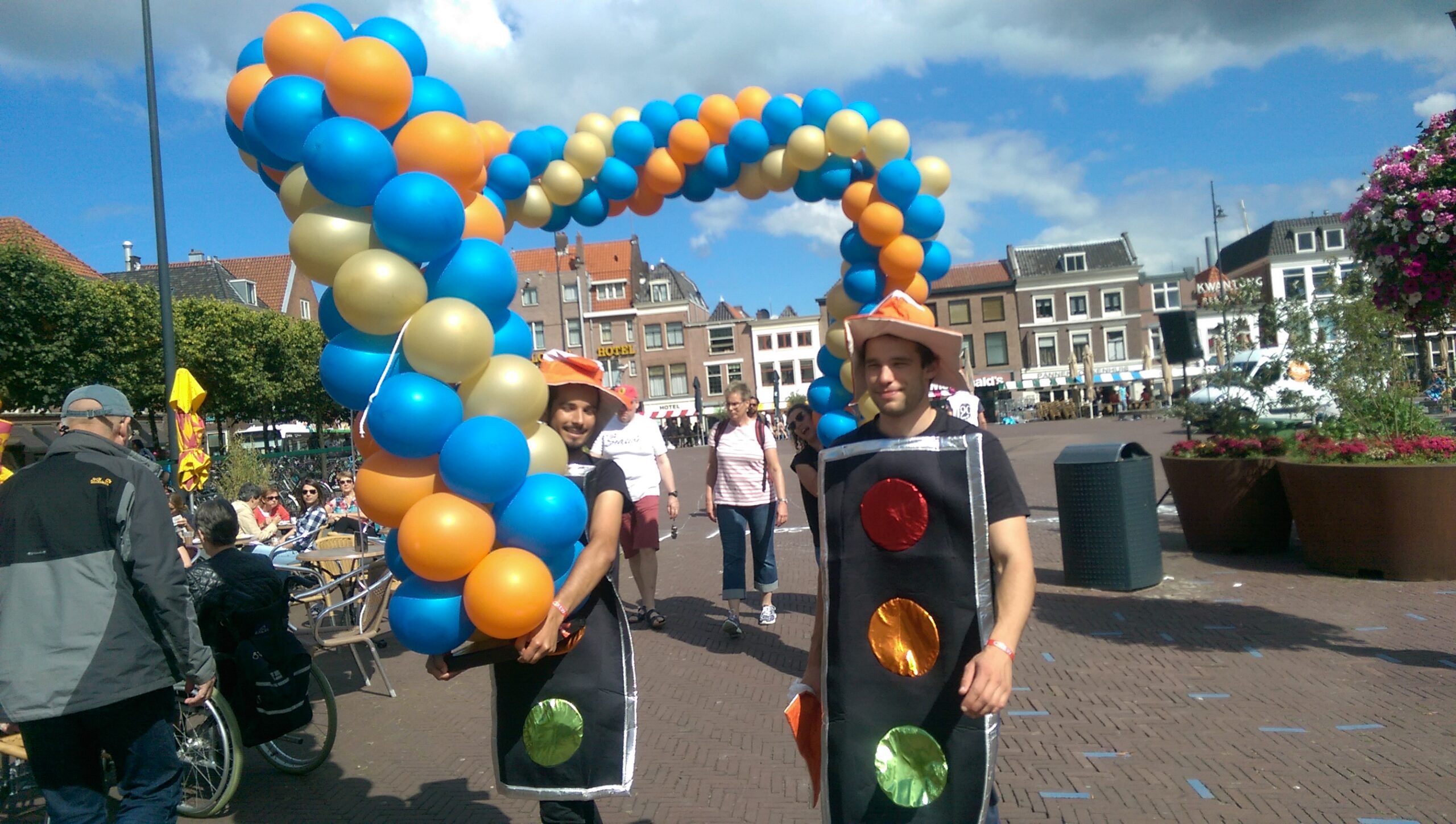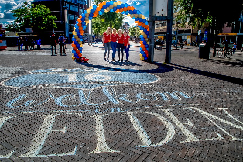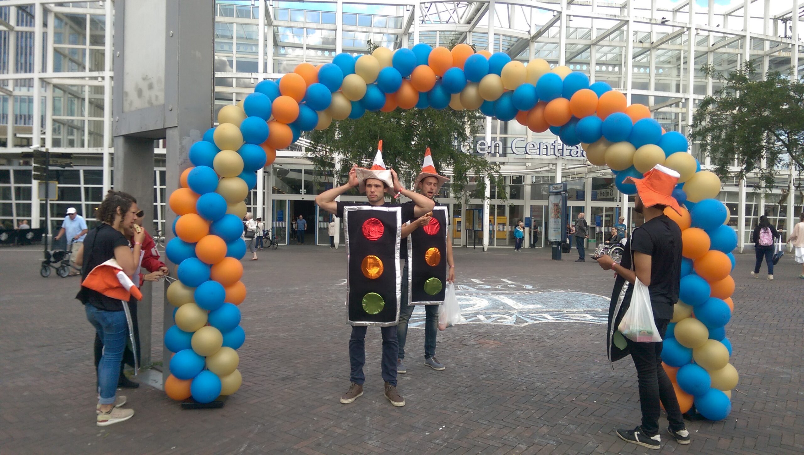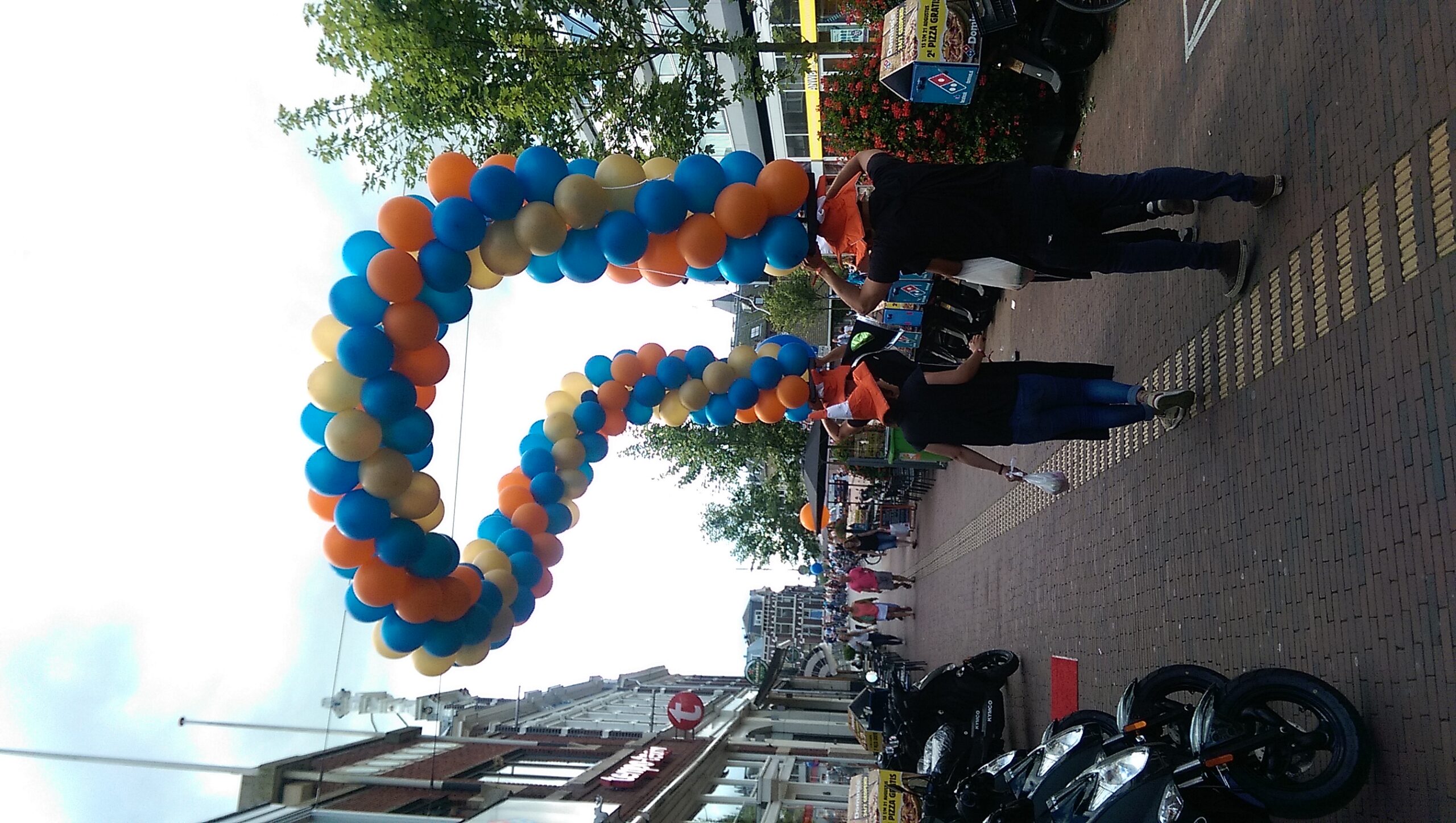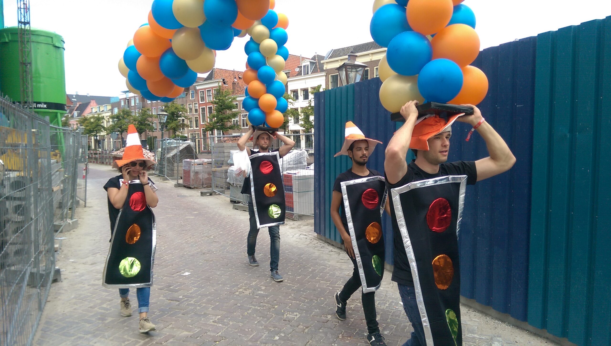 De commissie die volgend jaar de introductieweek organiseert staat al klaar in de startblokken. Deze week lopen ze mee om ervaring op te doen. Eén van hun belangrijke taken: de ballonnenboog van Leiden Centraal naar de Informatiemarkt brengen.