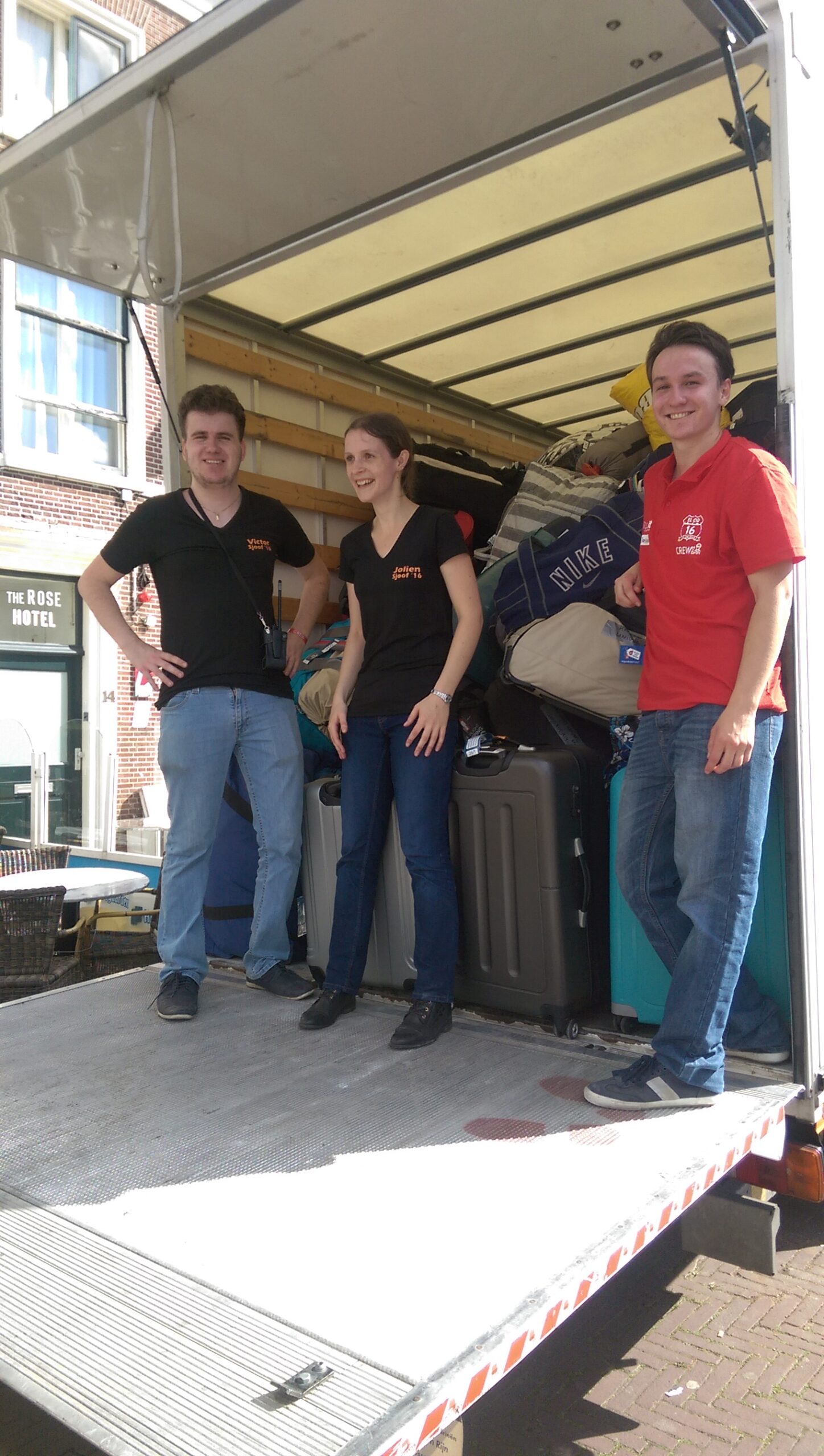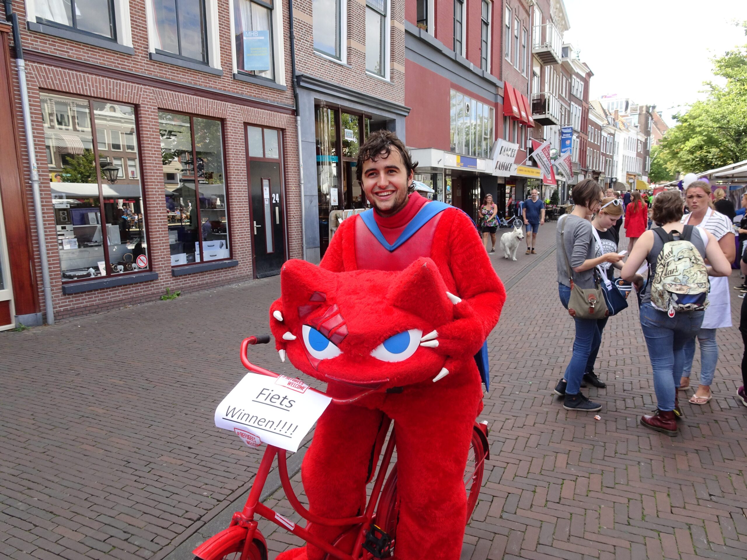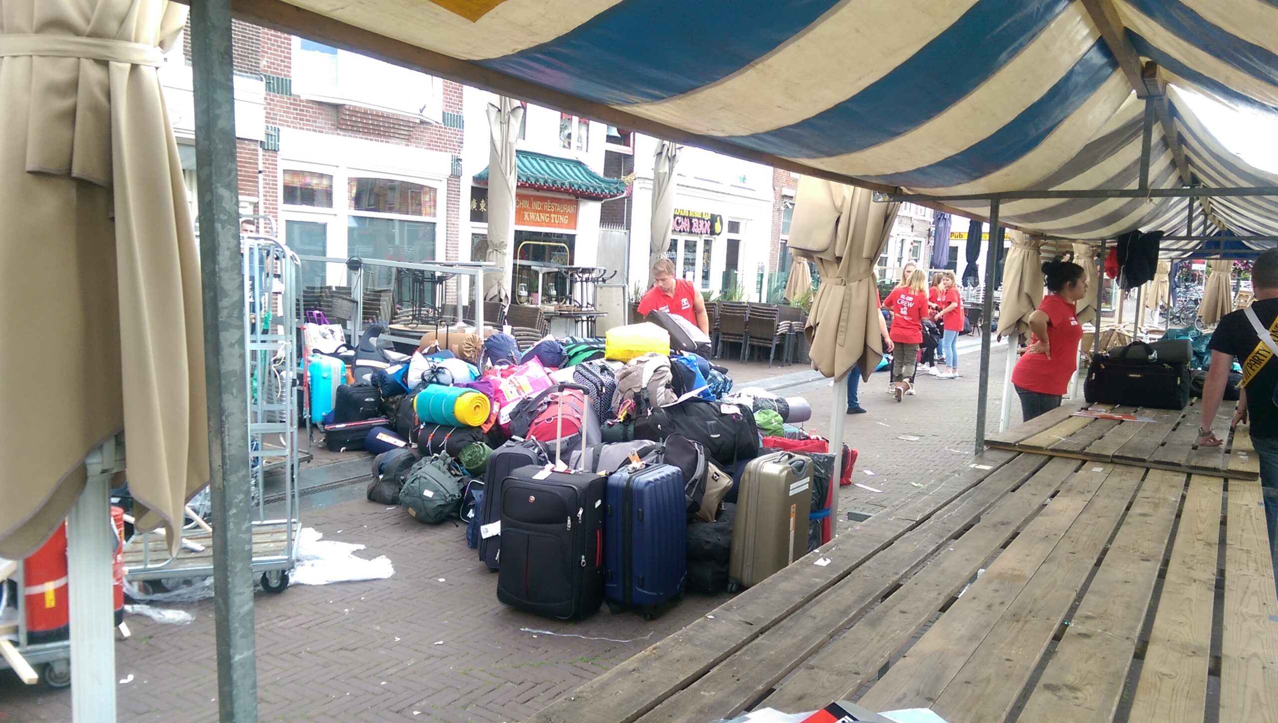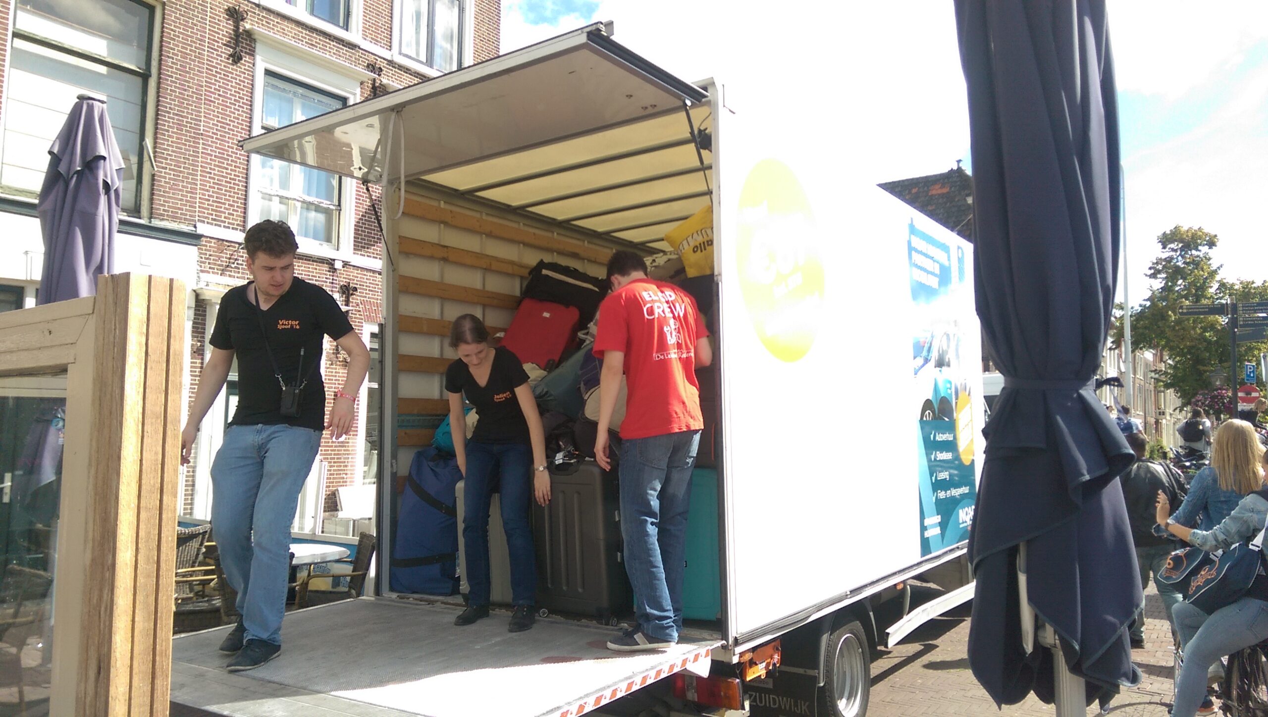 De commissie die volgend jaar de introductieweek organiseert staat al klaar in de startblokken. Deze week lopen ze mee om ervaring op te doen. Eén van hun belangrijke taken: de ballonnenboog van Leiden Centraal naar de Informatiemarkt brengen.