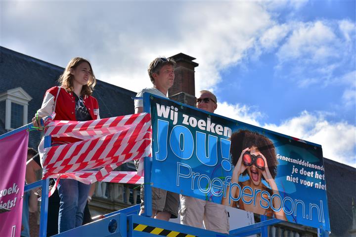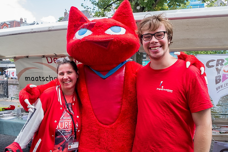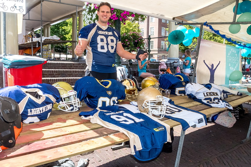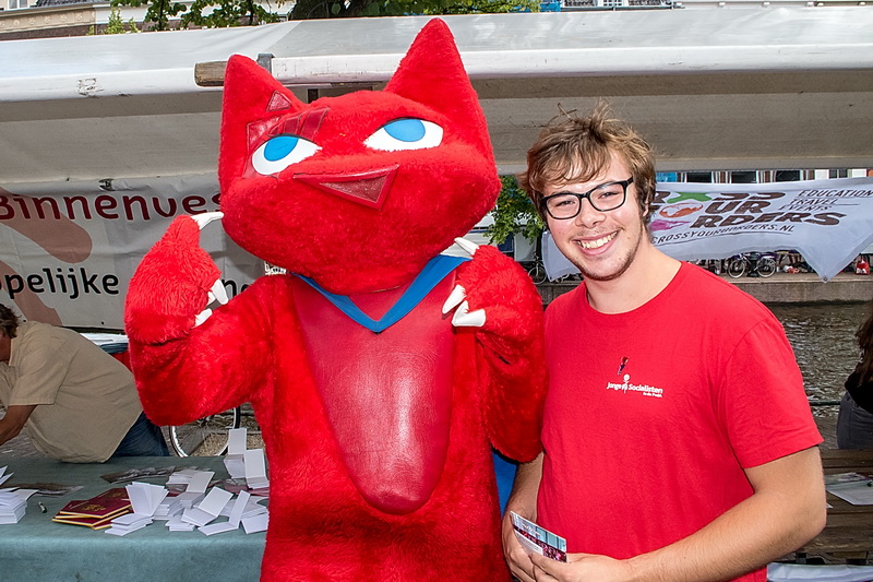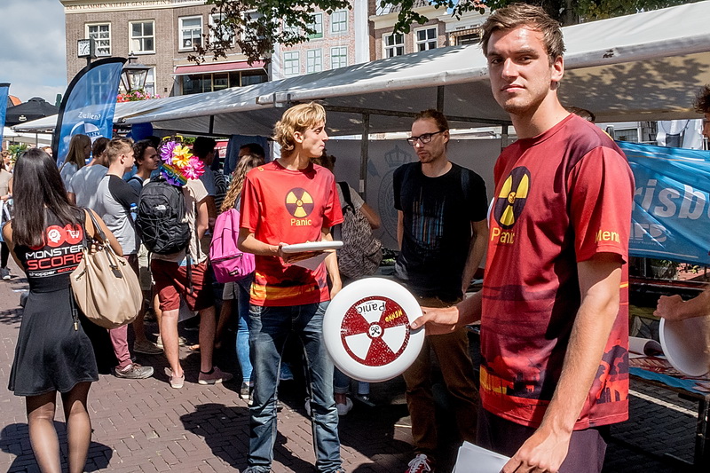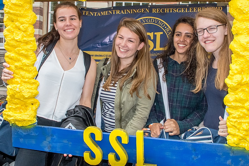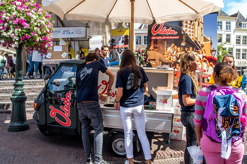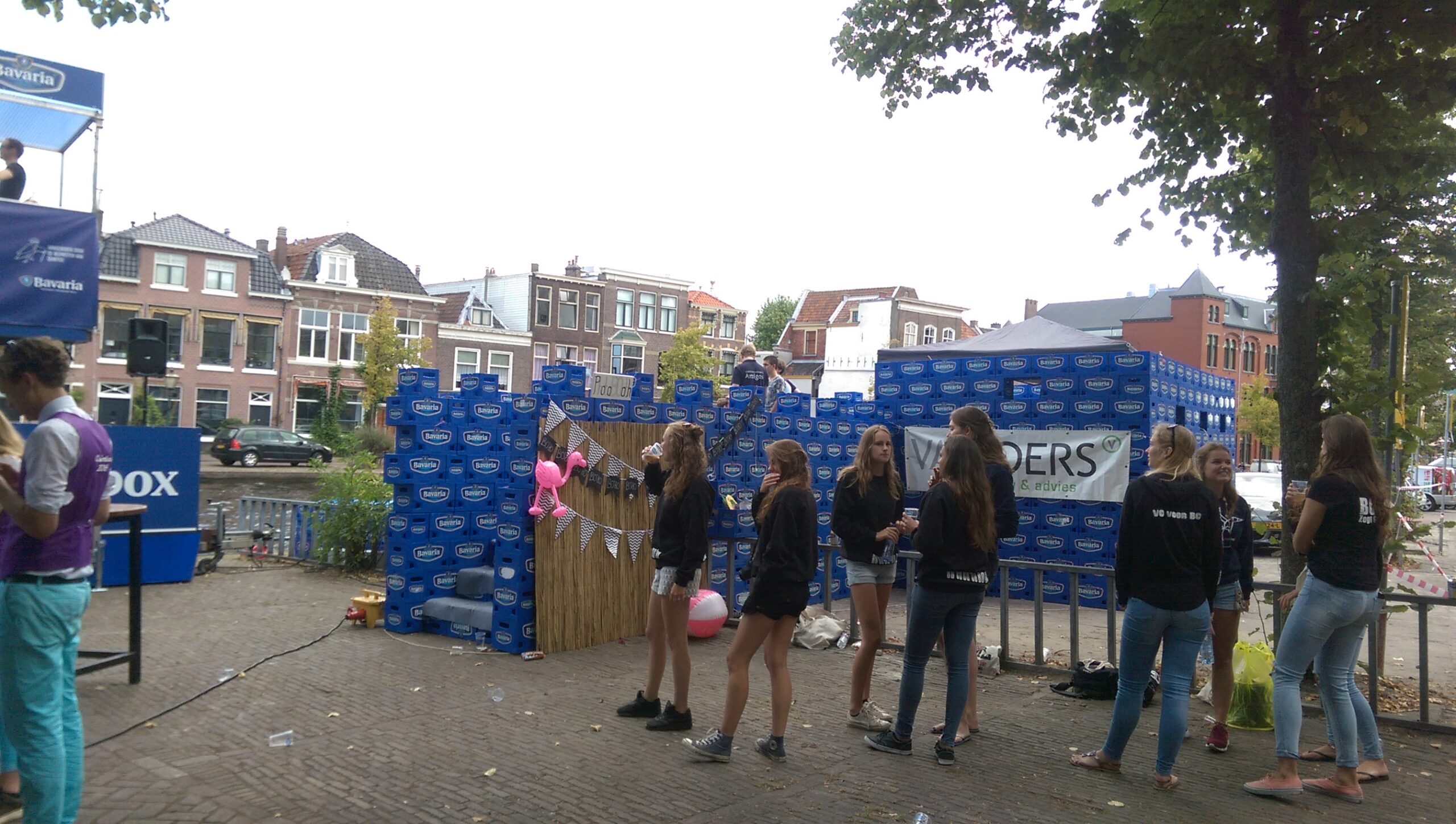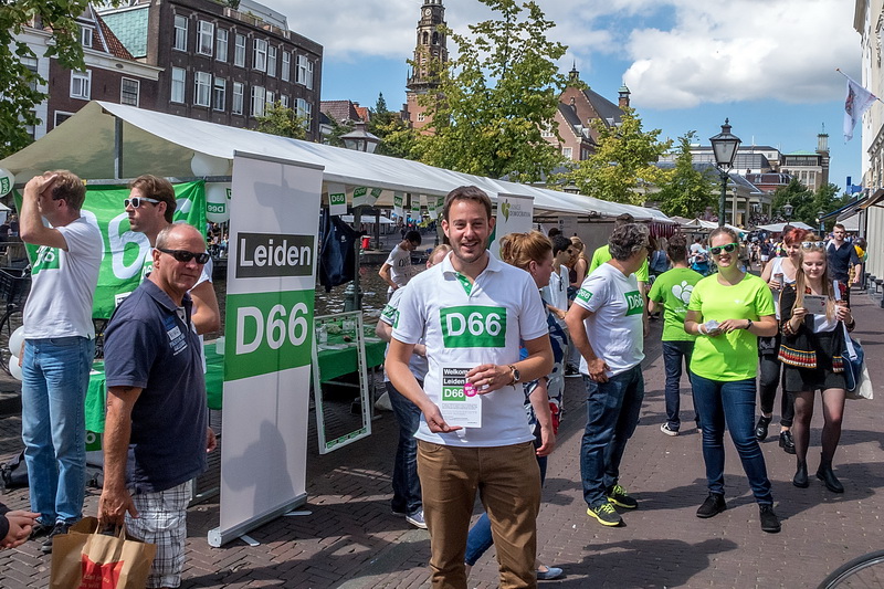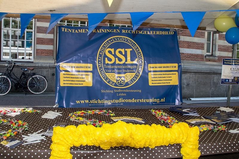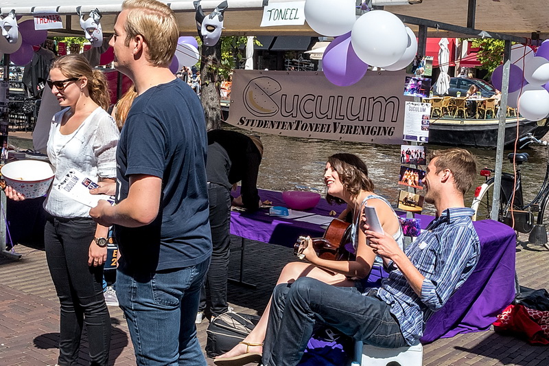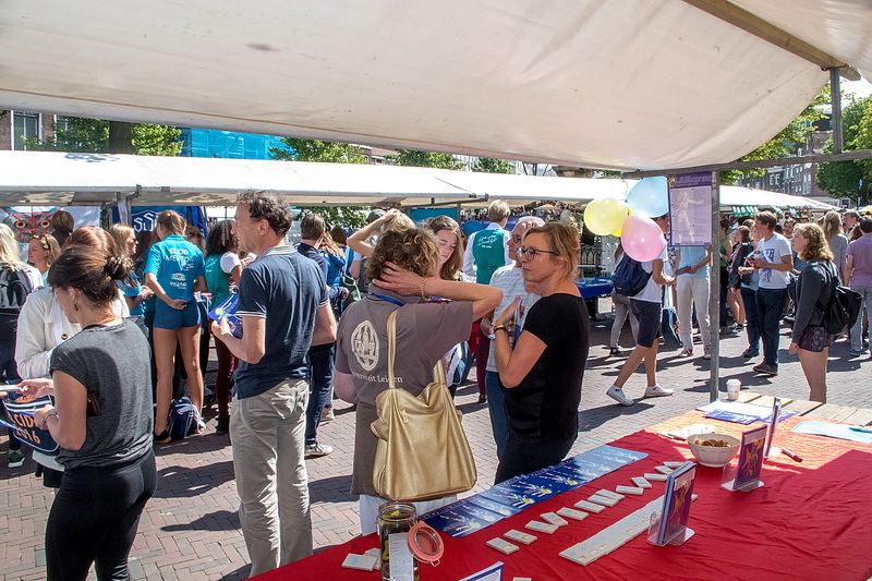 Op de informatiemarkt presenteren ruim tweehonderd Leidse organisaties zich aan de nieuwe studenten. Van sportclubs tot politieke partijen en gezelschapsverenigingen. Dat de sfeer er goed inzit laten VVD-wethouder Paul Laudy en D66-raadslid Peter Bootsma zien: ze komen erachter dat hun partijen precies dezelfde zonnebrillen (met een ander logo) uitdelen en wisselen gebroederlijk een bril uit.