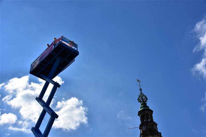 Bezoekers van de informatiemarkt konden met de hoogwerker van Proefpersoon 35 meter de hoogte in voor een prachtig uitzicht over Leiden.