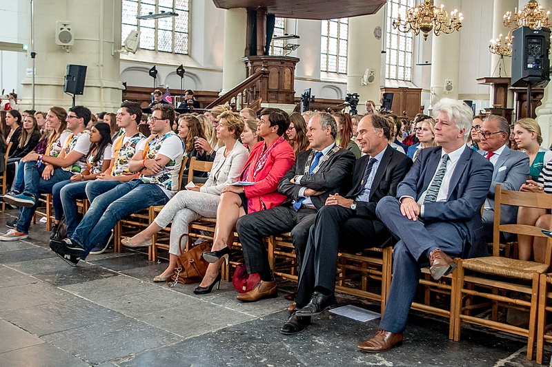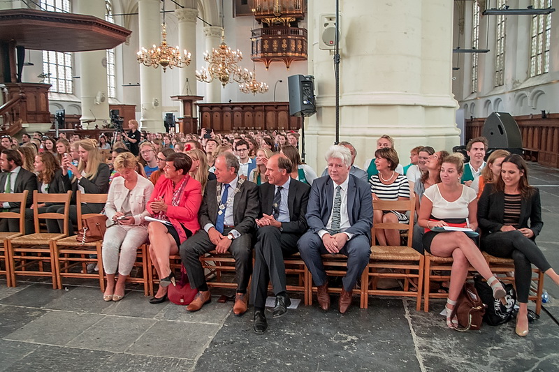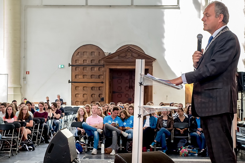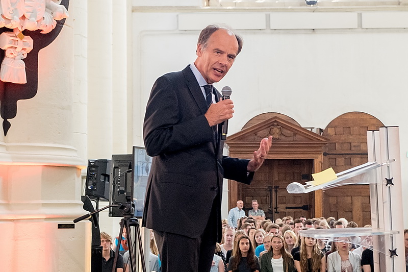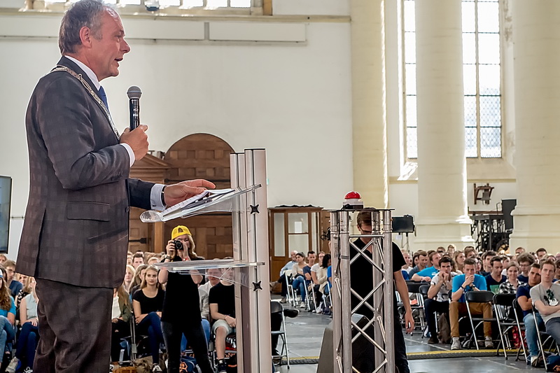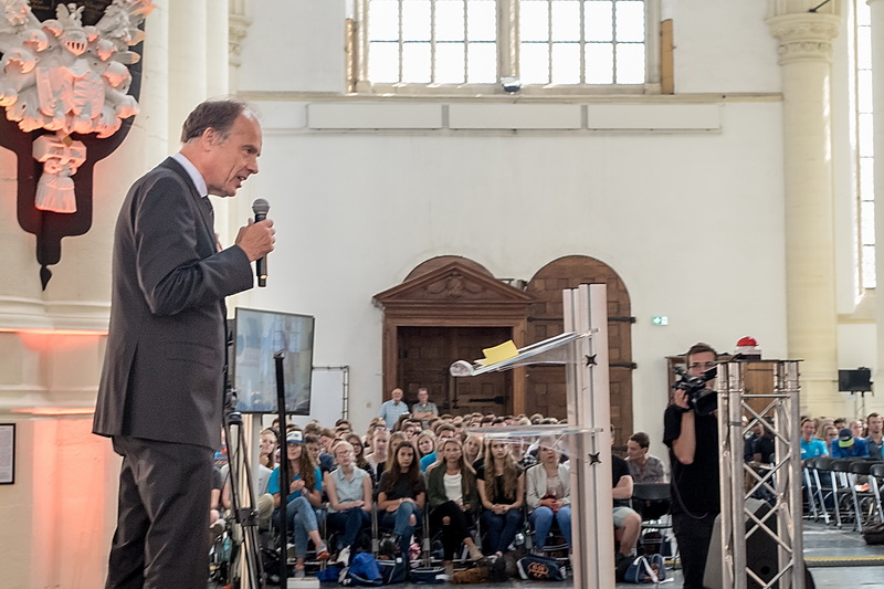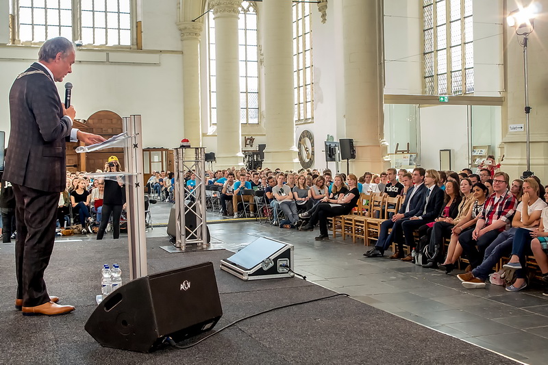 Het zal je gebeuren. De blijdschap van het behaalde eindexamen is net weggeëbd of je krijgt je nieuwe uitdaging voor de kiezen. De rector magnificus van de Universiteit van Leiden, Stolker, legde de lat voor de eerstejaars meteen ambitieus hoog. Hij wees op de (verschillende soorten) crises die de wereld teisteren en de reactie van velen daarop “dat zullen ‘ze’ vast gaan oplossen. Die ‘ze’ zijn de wetenschappers. Die ‘ze’ zijn jullie, de nieuwe generatie wetenschappers, ondernemers, politici”. Op een zonnige maandagmiddag in een Hooglandse Kerk in Leiden het lot in handen gelegd krijgen. Da’s nog ’s onbelast starten.