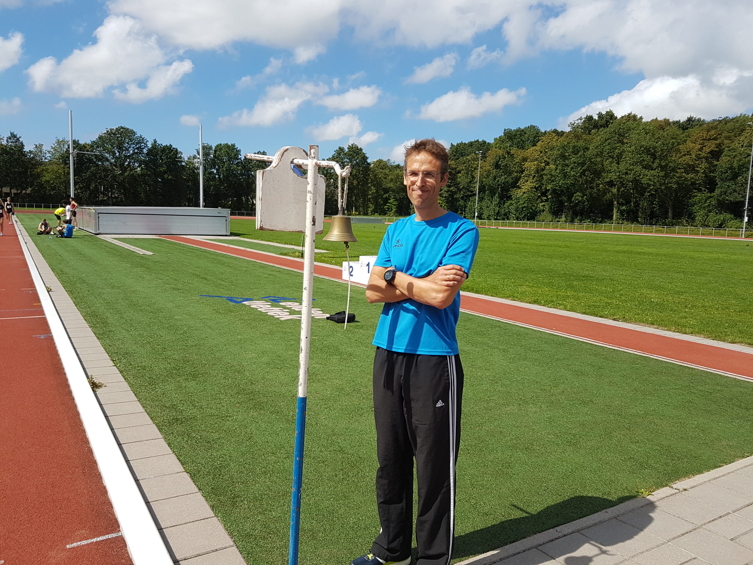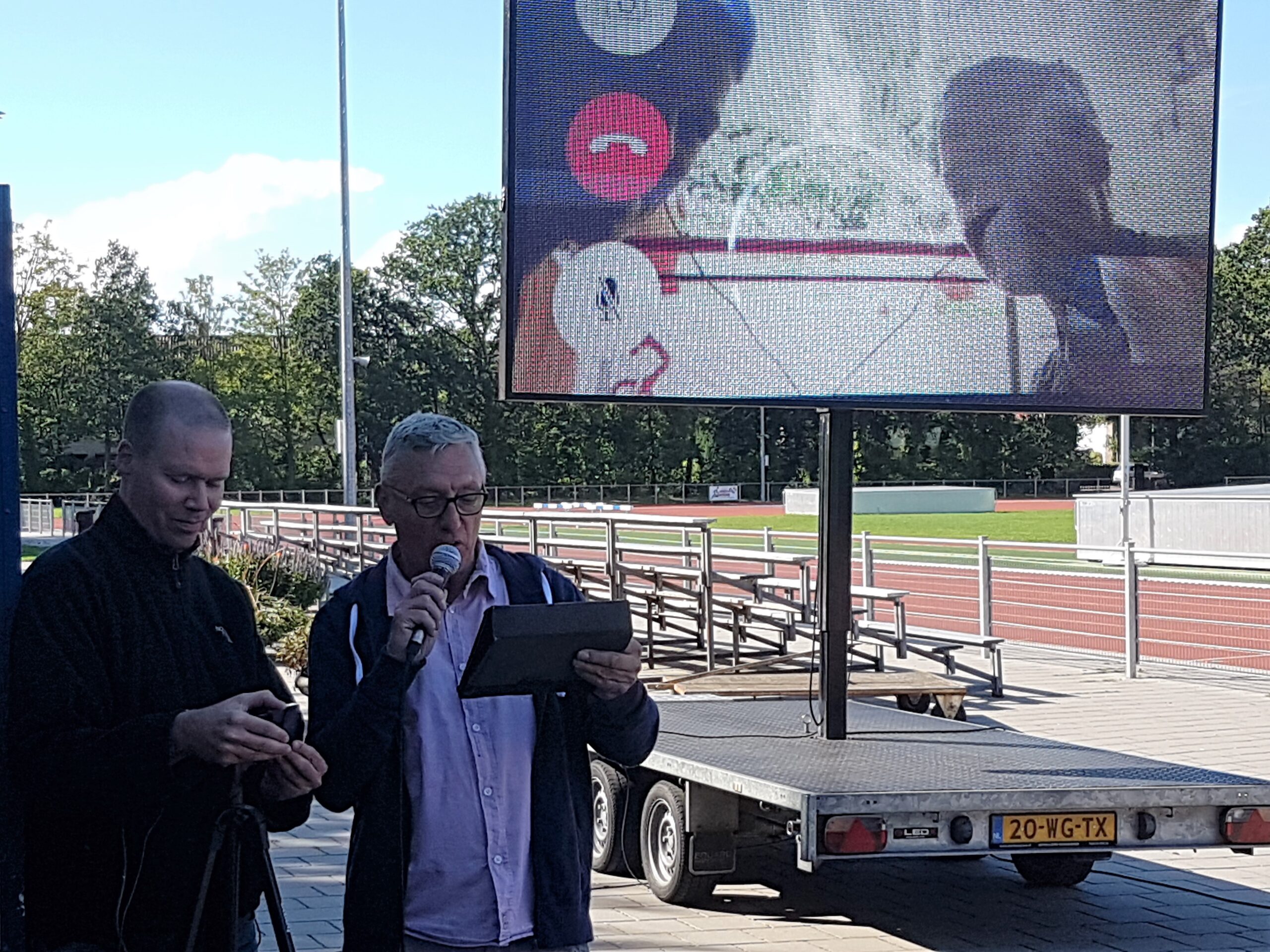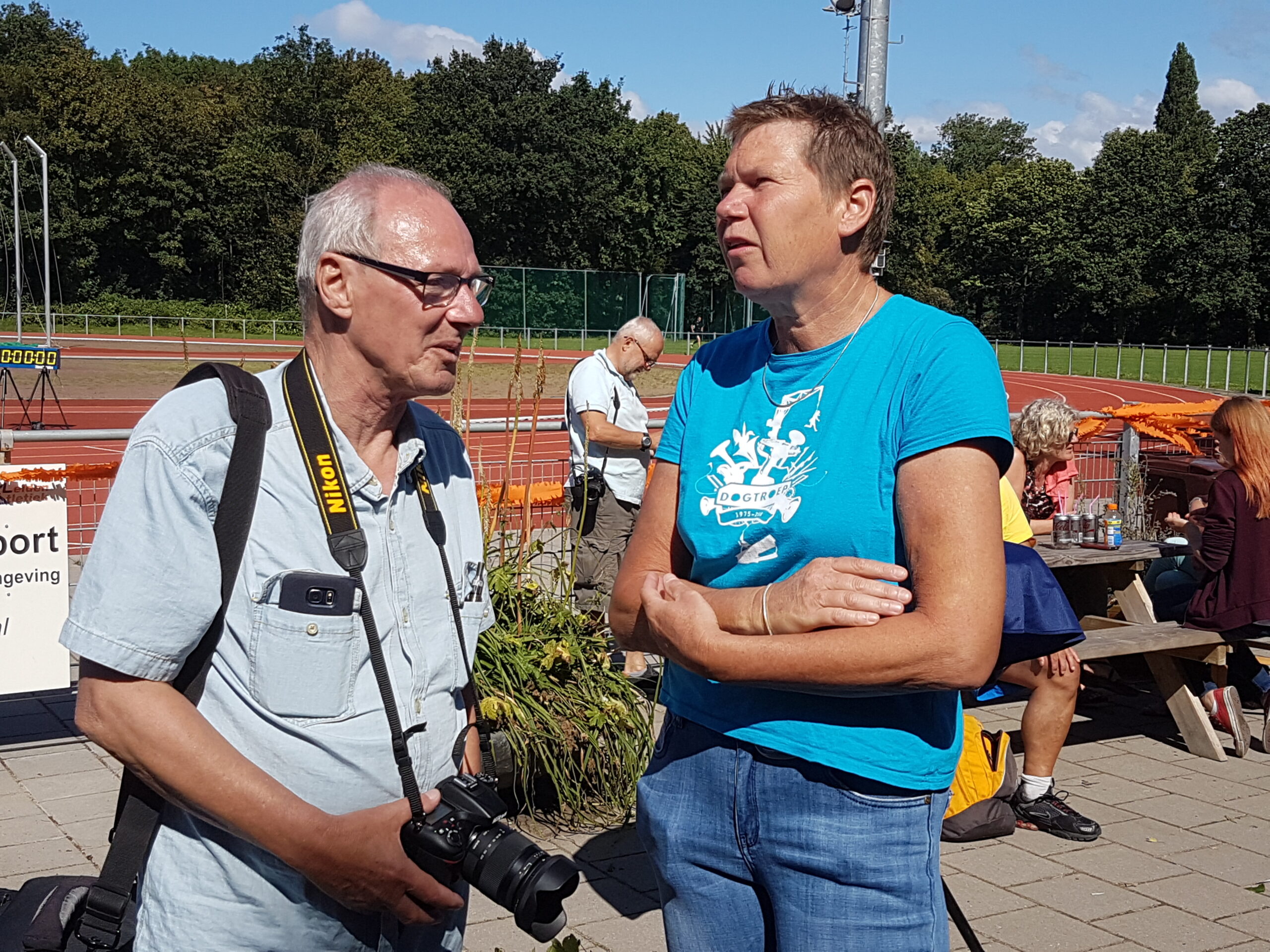 Chris de Waard in gesprek met topsportcoördinator Tjeerd Scheffer tijdens de Olympische Dag bij Leiden Atletiek.
