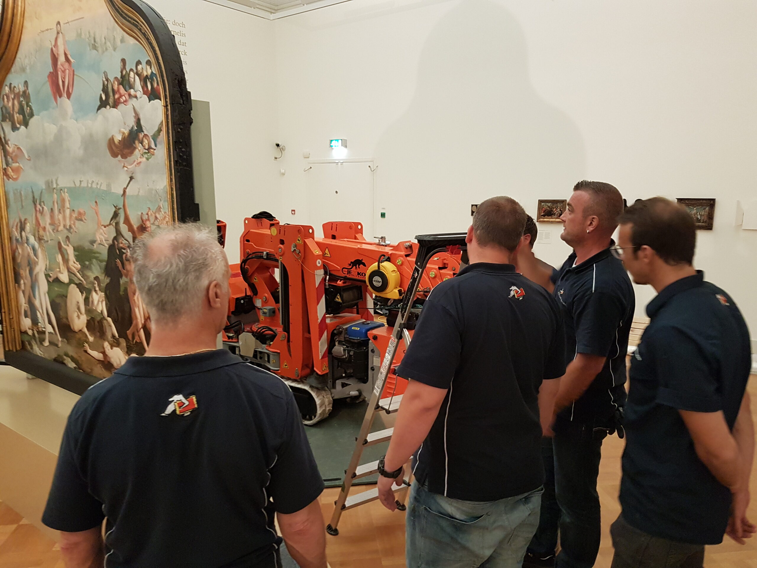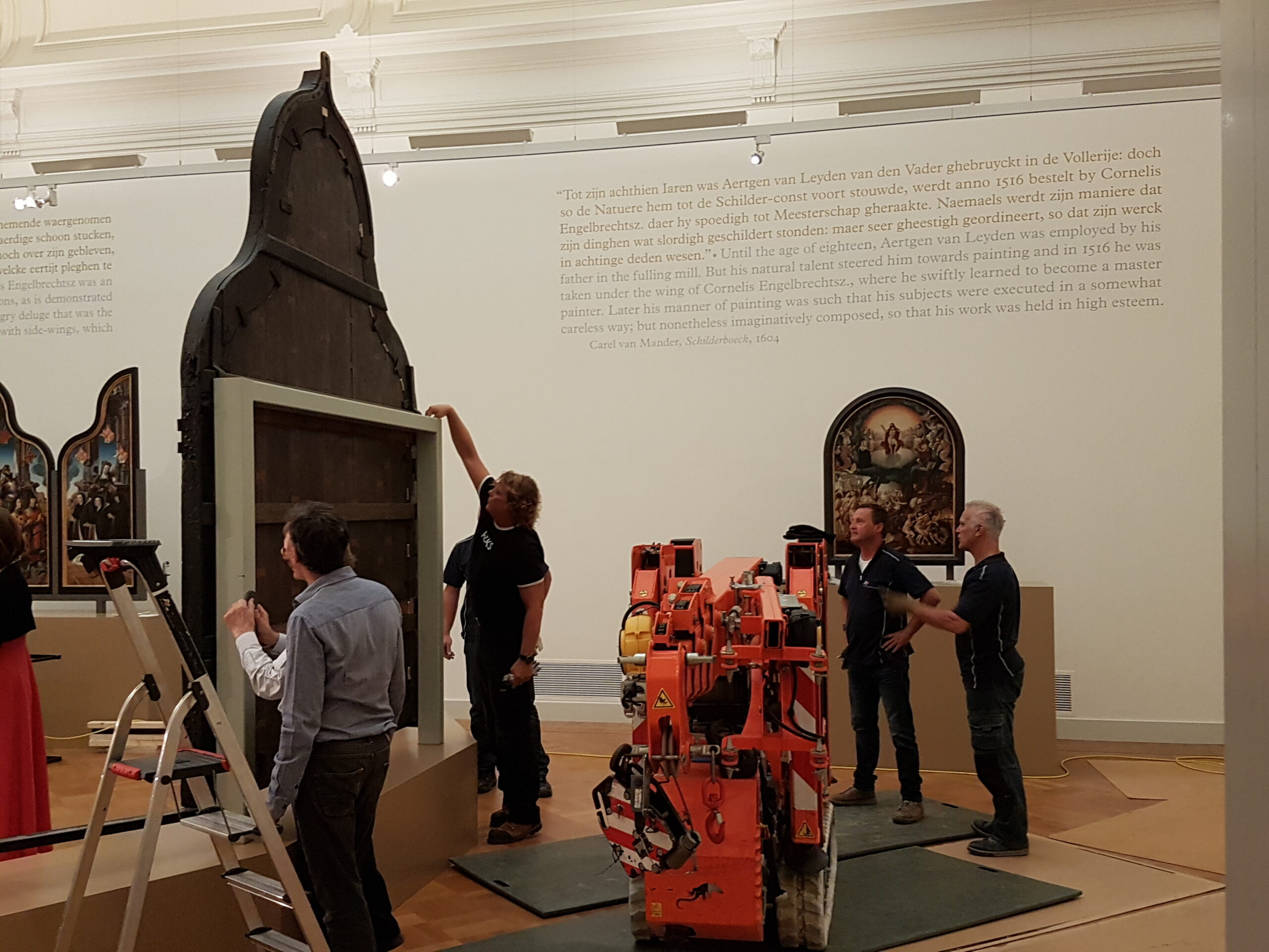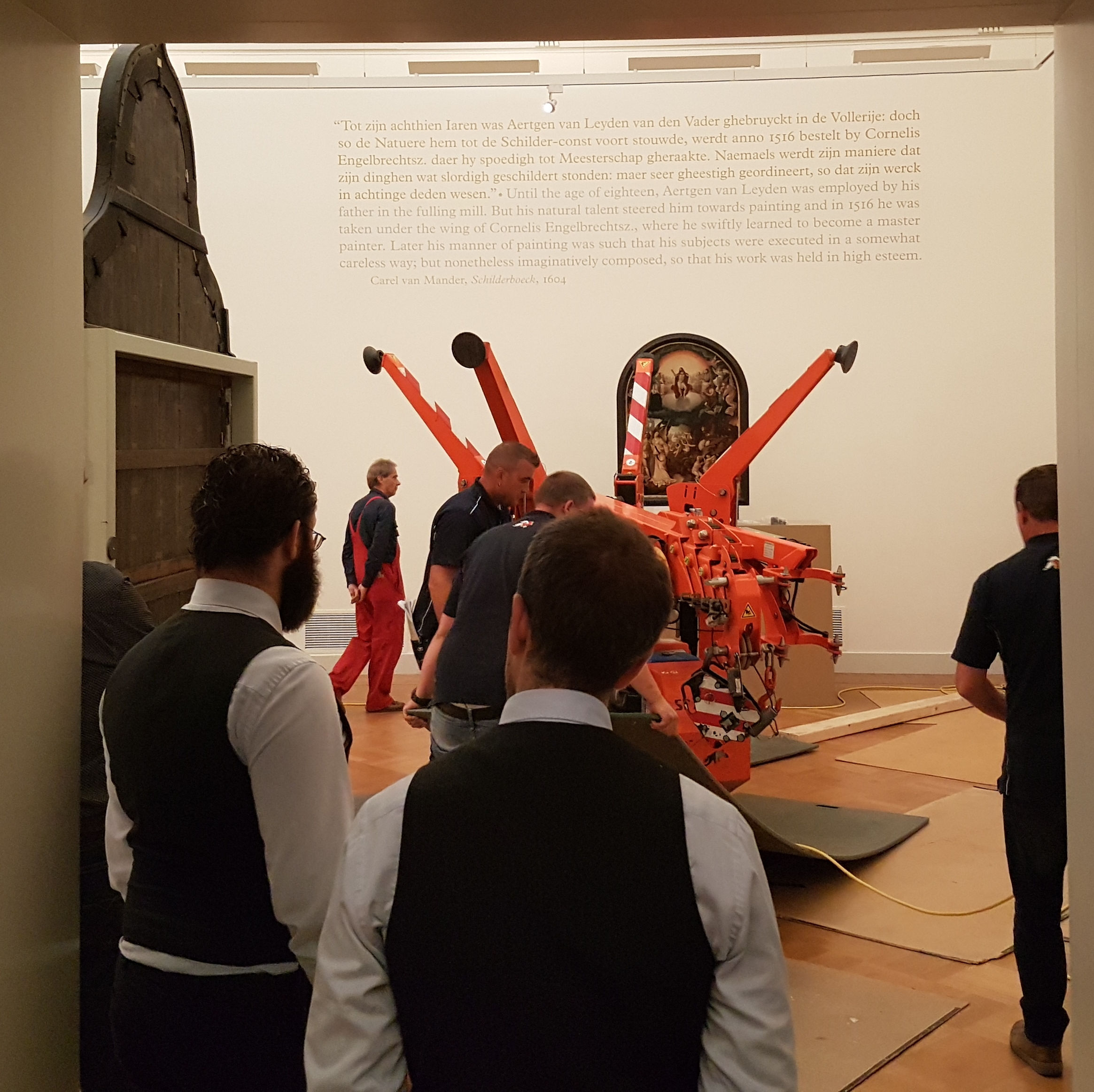Het enorme drieluik werd vanmorgen heel voorzichtig uit elkaar gehaald. De zijpanelen zitten met scharnieren aan het middendeel vast. Die scharnierpennen moesten er uitgetikt worden. Een uiterst omzichtig klusje. Vervolgens werden de panelen een voor een in een speciale transportkist vastgezet. Voor waren vijf sterke mannen nodig van zeer een gespecialiseerd verhuisbedrijf die het Leidse erfgoed in de loop van de middag schokvrij naar Amsterdam transporteerde.