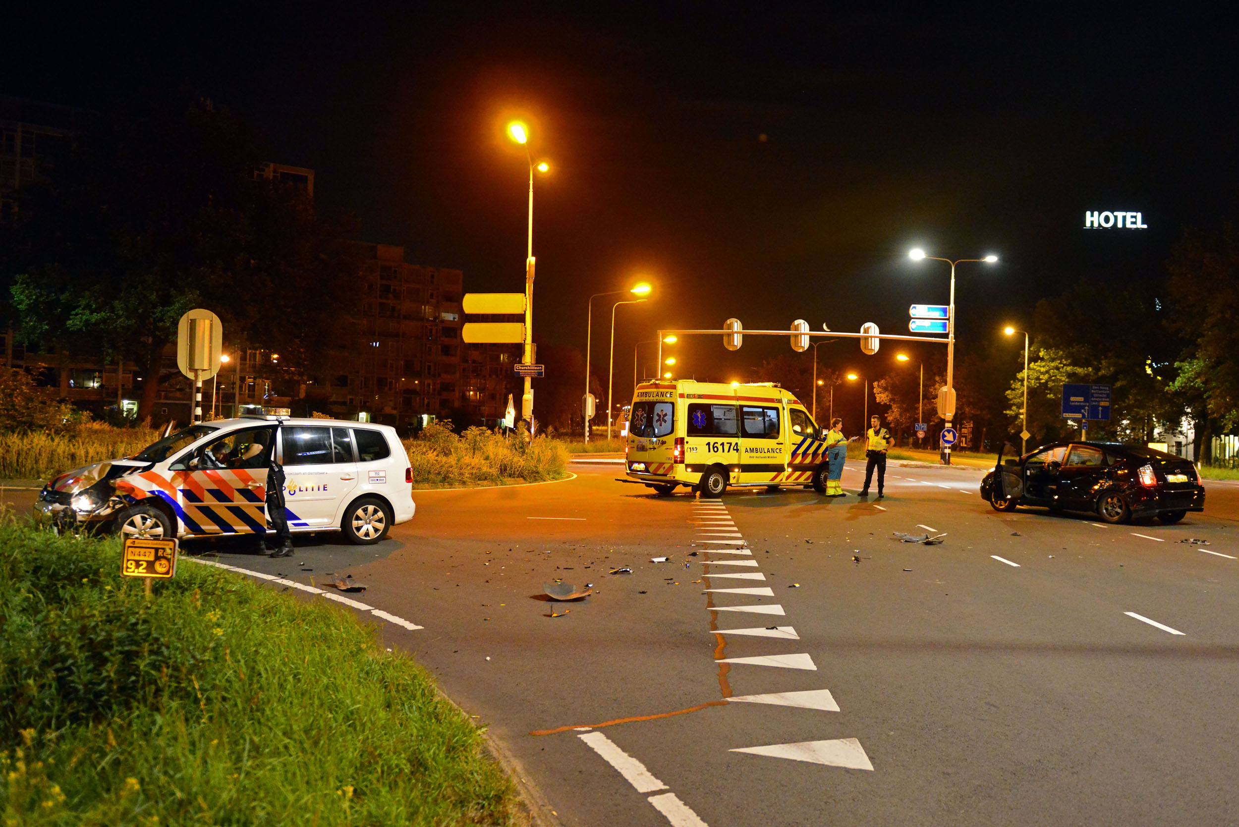 In de nacht van vrijdag op zaterdag zijn op de kruising van de Voorschoterweg en de Churchilllaan in Leiden Zui-West een personenauto en een politiewagen op elkaar geknald. De politieauto reed met licht- en geluidssignalen richting Voorschoten voor een melding toen het mis ging. Een andere politie-eenheid heeft de melding overgenomen.