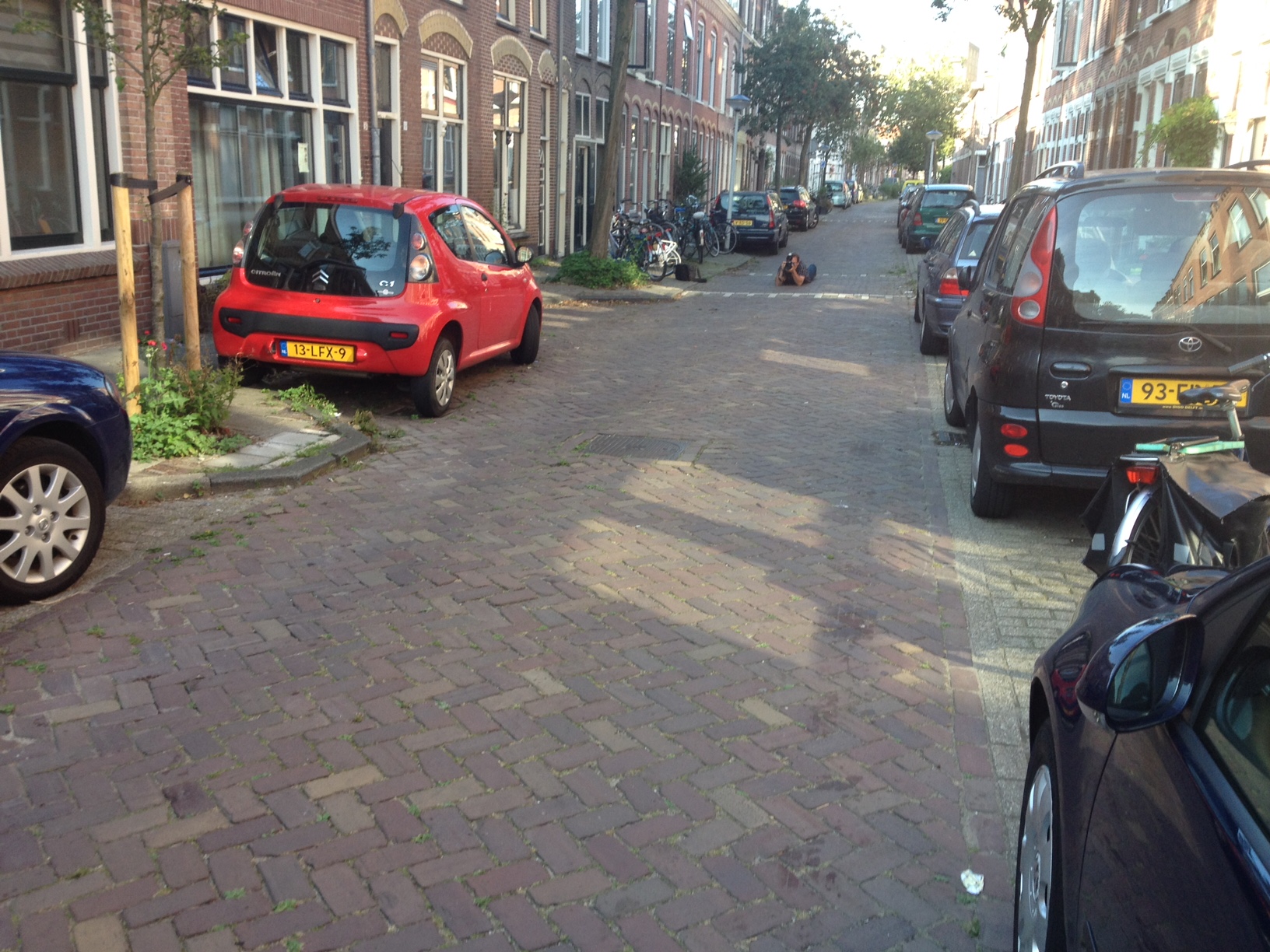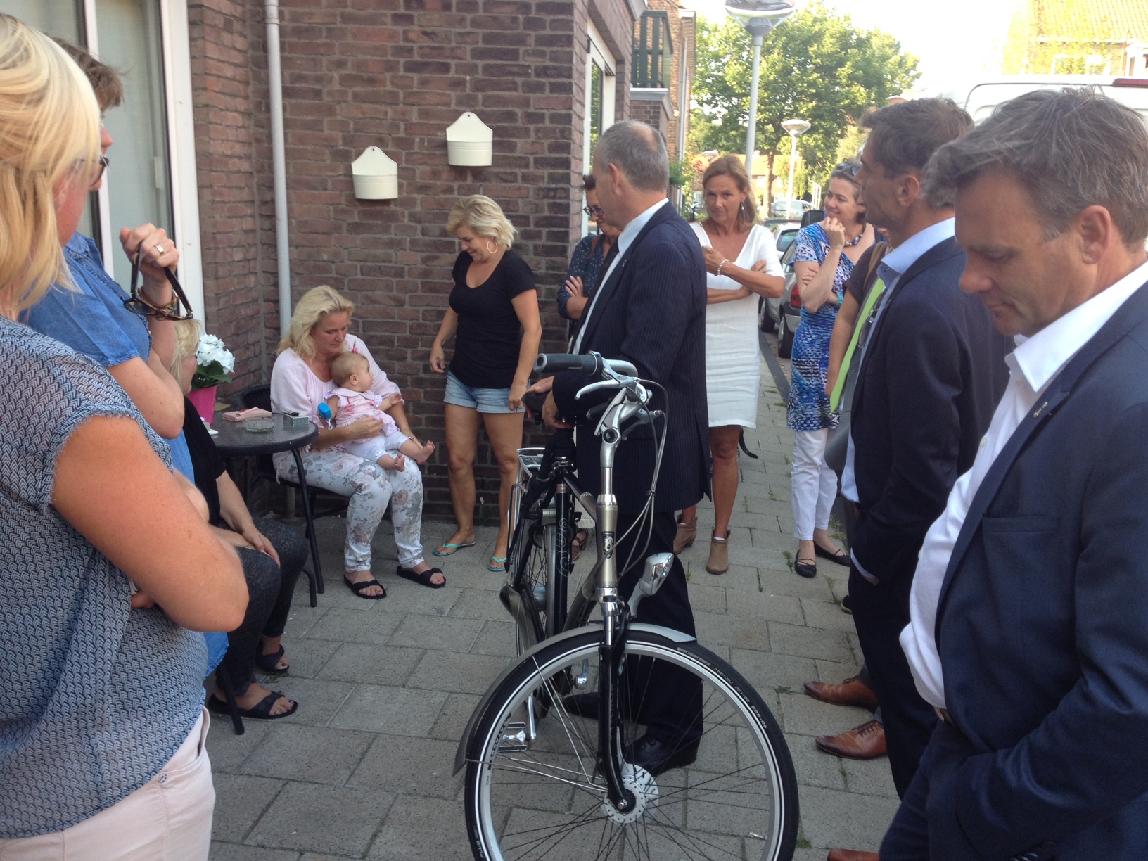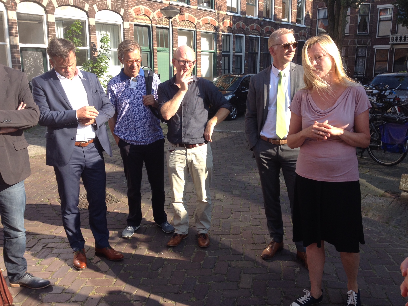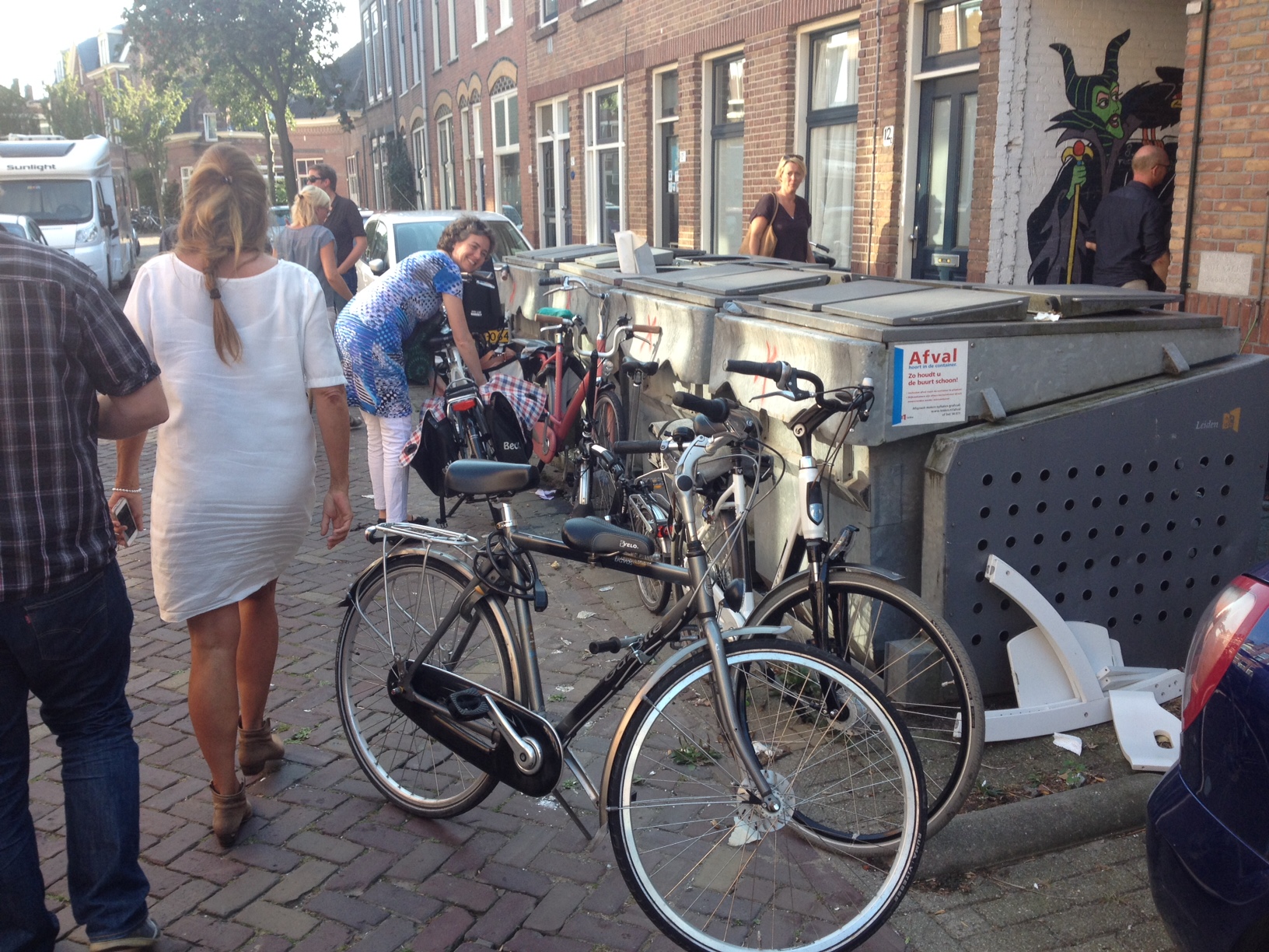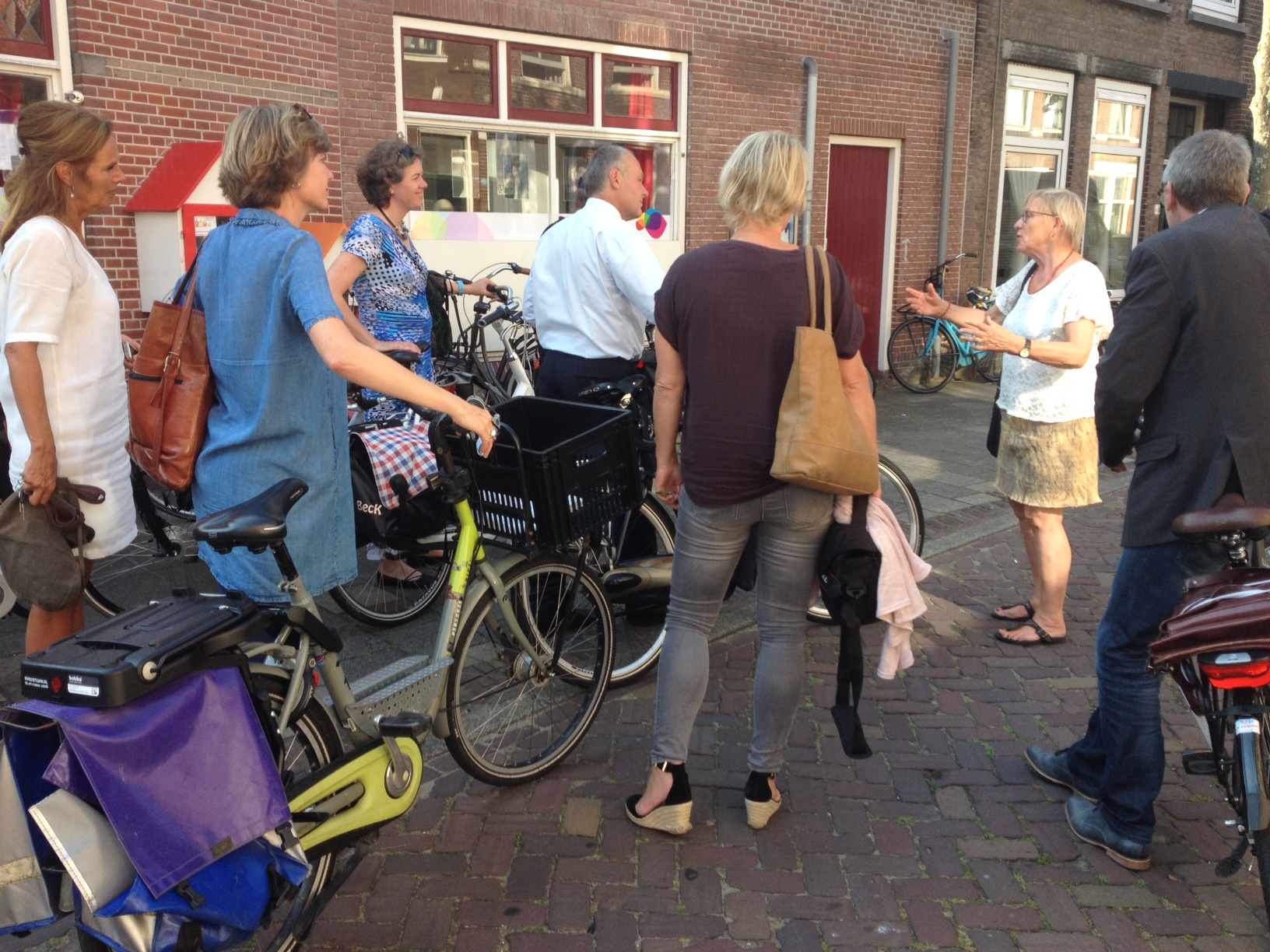 Iedere stop was niet veel langer dan drie tot vijf minuten, en dus rept het gezelschap zich naar het volgend adres, de Margrietstraat. Die tussenliggende routes zijn eigenlijk ook informatief. We fietsen over groene grasveldjes omdat er geen fietspad dichtbij is en op de Willem de Zwijgerlaan staan we erg lang te wachten op het verkeerslicht om ook nog ’s op de middenberm te stranden. Betere voorbeelden van de scheiding tussen theorie van de tekentafel en de praktijk zijn er in Leiden vast te vinden, maar deze voldoen ook prima. Dat gebeurde overigens ook in de Hansenstraat waar een projectplan voor fietsparkeerplaatsen min of meer verdwenen bleek in de ambtelijke molen. Of ze nu waren opgenomen in andere plannen of echt verdwenen, bleef ook de wethouders even onduidelijk. Maar het zijn juist die momentjes die hen de ogen kunnen openen voor ambtelijke onvolkomenheden.