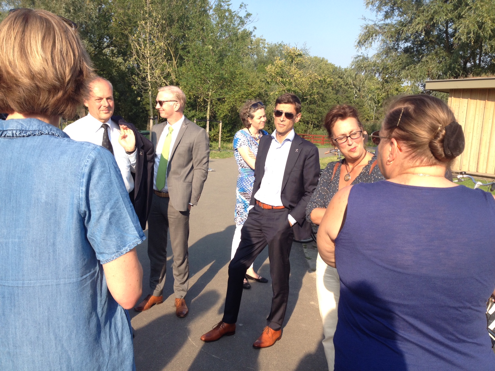 Een heel ander karakter heeft de Tuin van Noord: een brede strook groen met speelvoorzieningen, een theehuis en volks- en schooltuinen parallel aan de Willem de Zwijgerlaan. Ook hier een belangrijke rol voor de bewoners zelf, maar het karakter is anders. Het College amuseerde zich prima. Een enkele wethouder waagde zich boven het water. De burgemeester testte, enigszins besmuikt want volwassenen mochten er eigenlijk niet op, de grond-trampoline. Hij was ook degene die tot verbeelding sprak. “Is de burgemééster hier? Wie is dat?” was de vraag waarmee twee jochies zich naar voren wurmen en meteen met hem op de foto willen. ‘De burgemeester in de straat’ spreekt tot de verbeelding. En burgemeester Lenferink is benaderbaar. Hij praat net zo makkelijk met de jochies “jij hebt het niet koud, want ik zie geen kippenvel” als met wijkbestuurders.