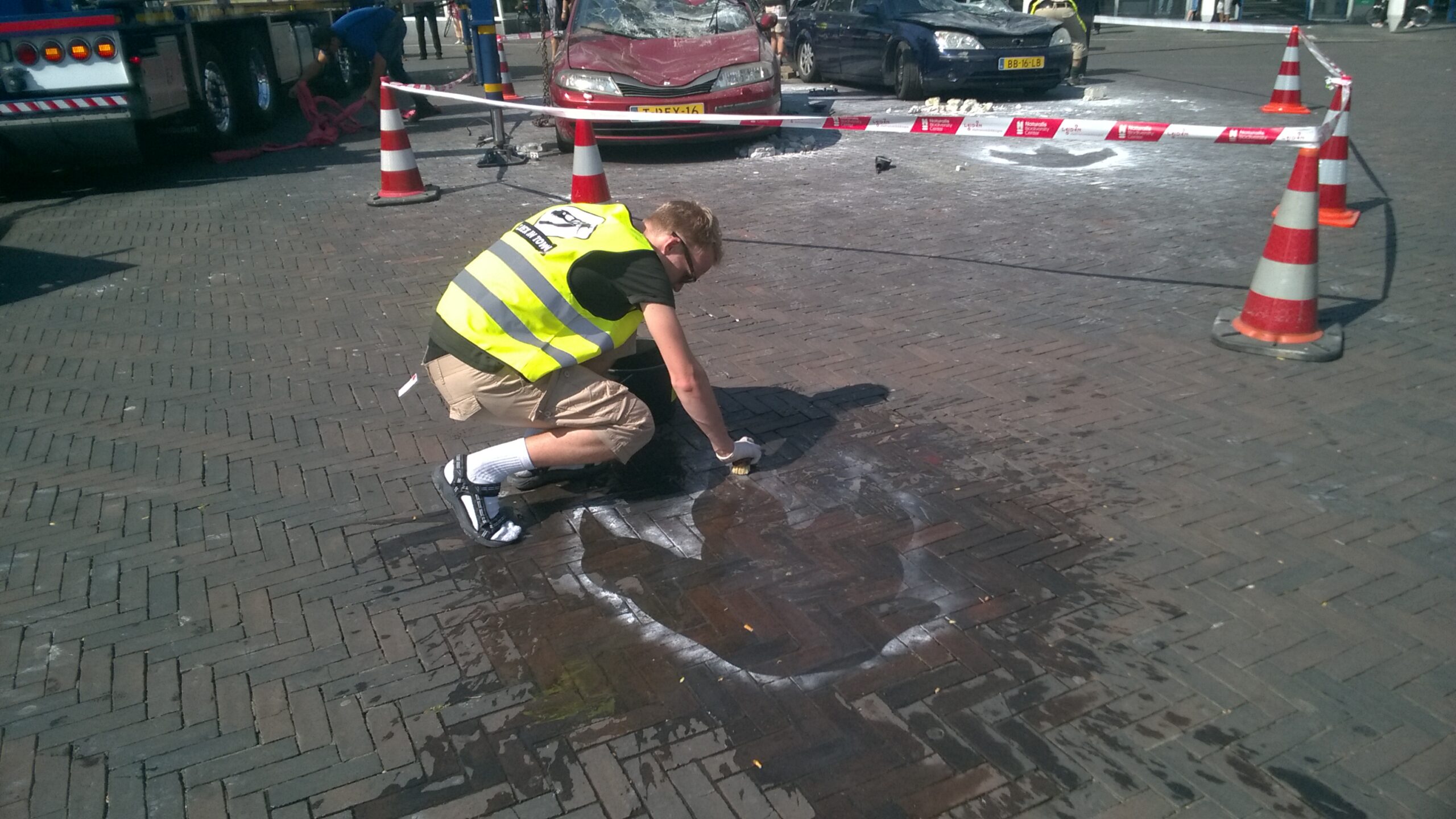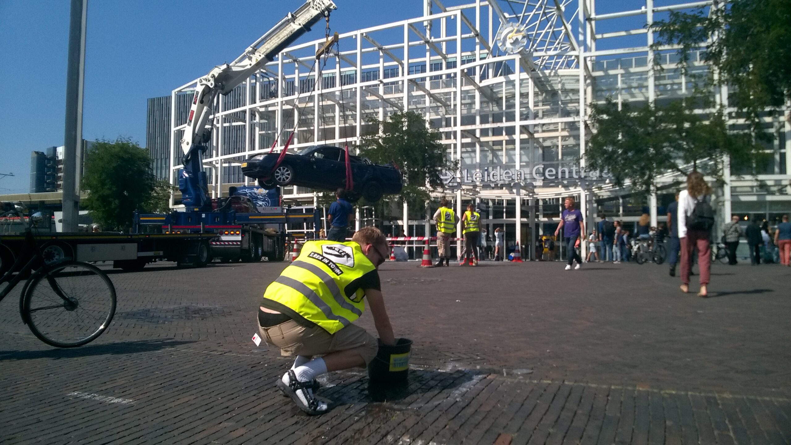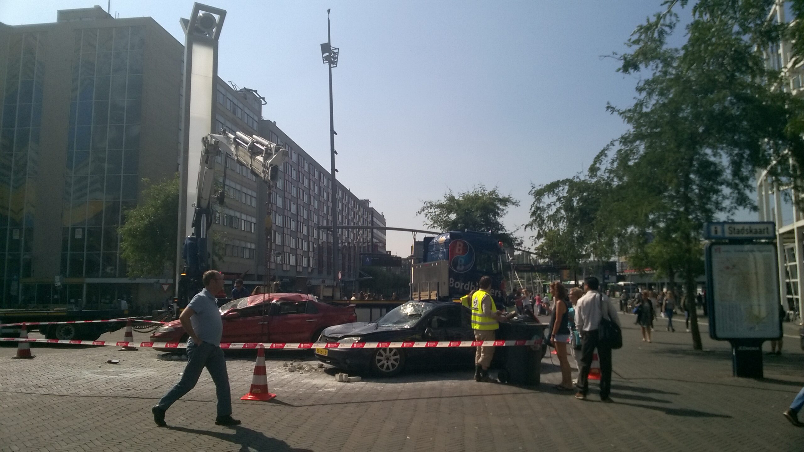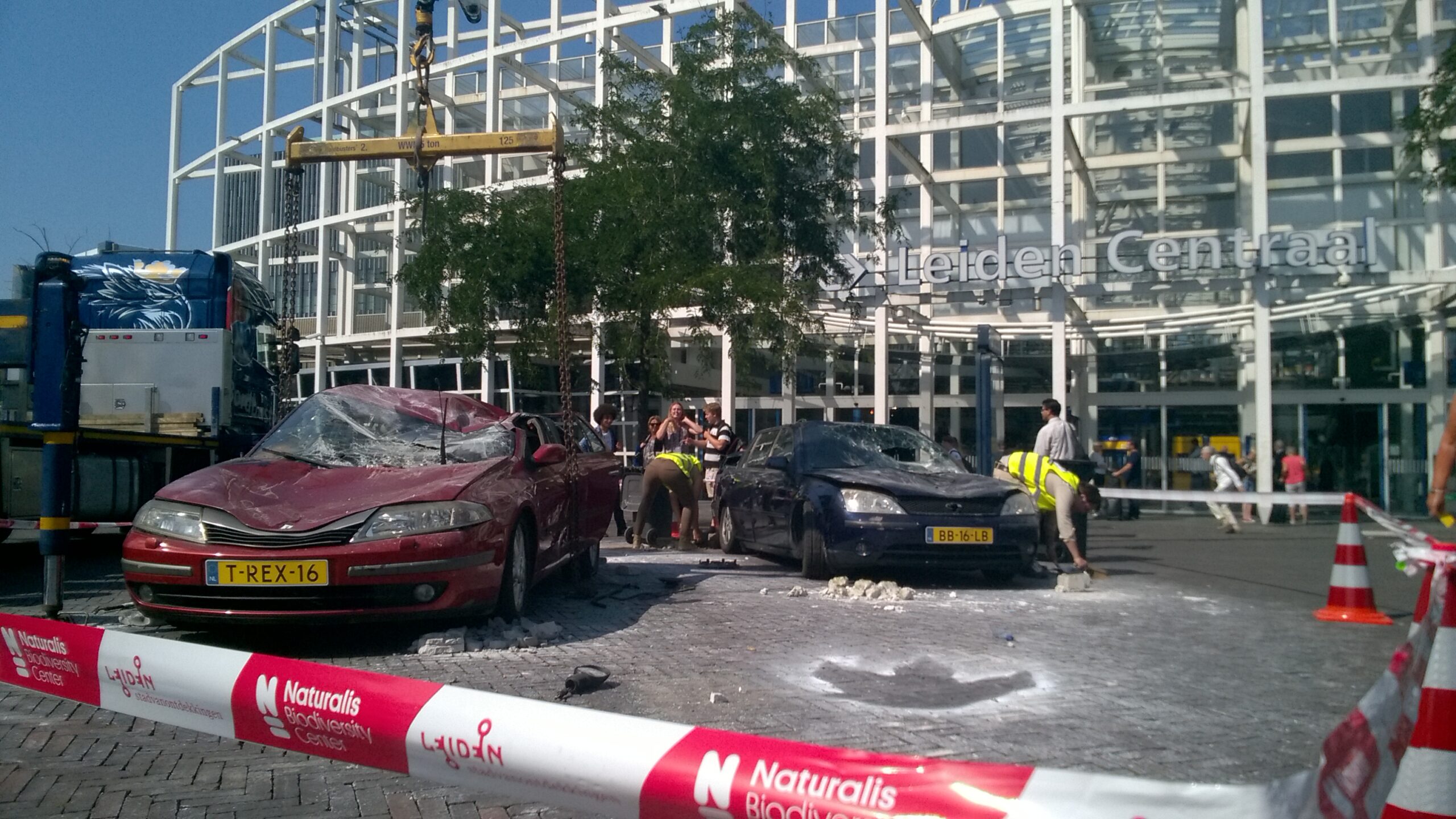 Een apart gezicht voor wie gisteren in en uit het station liep: twee autowrakken en een paar sporen van voetstappen, ogenschijnlijk toebehorend aan Trix, de T-Rex die afgelopen vrijdag in onze stad welkom werd geheten.