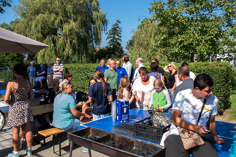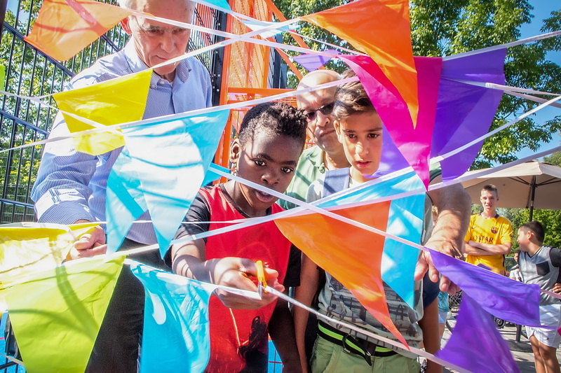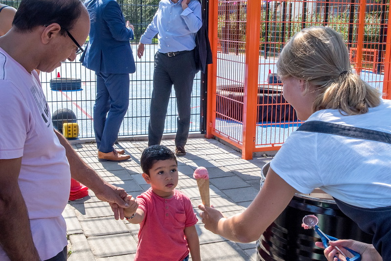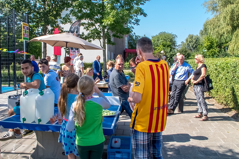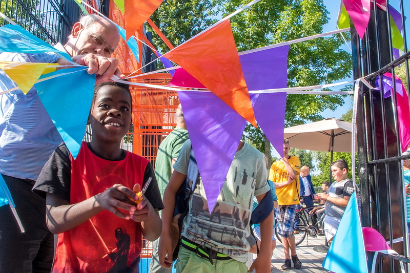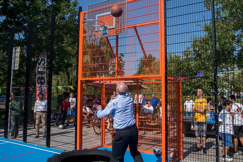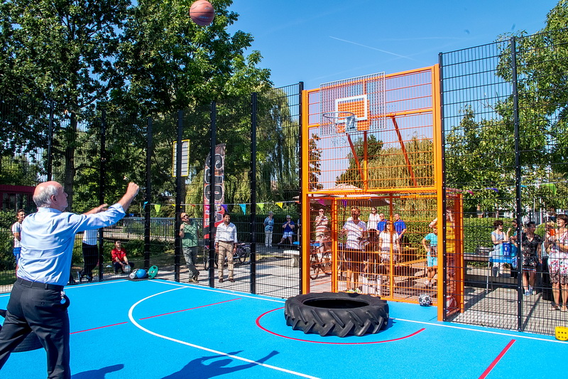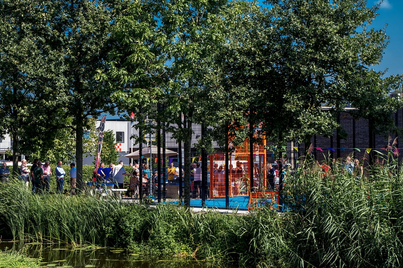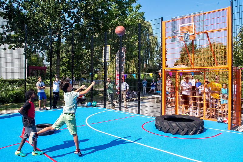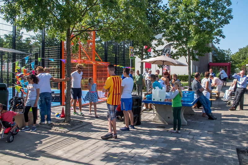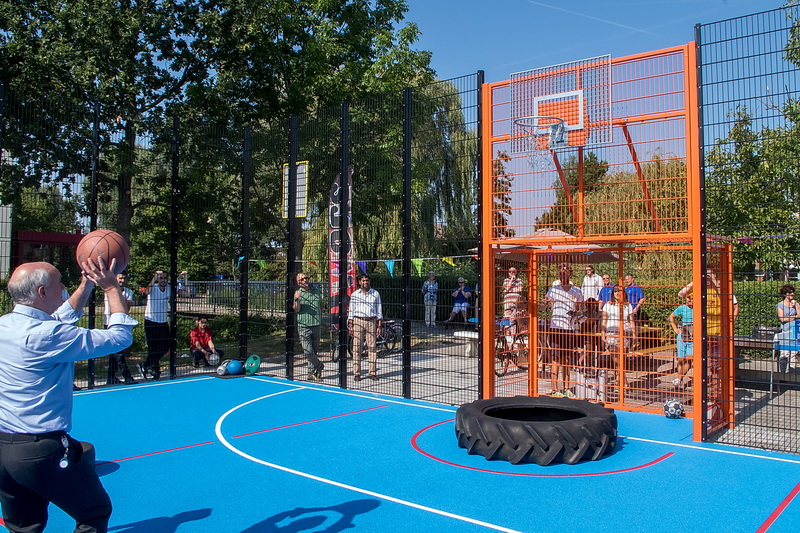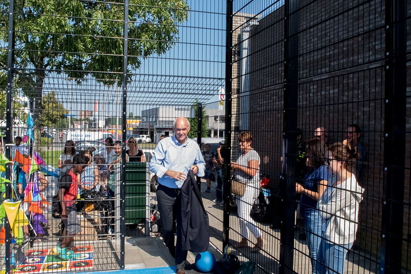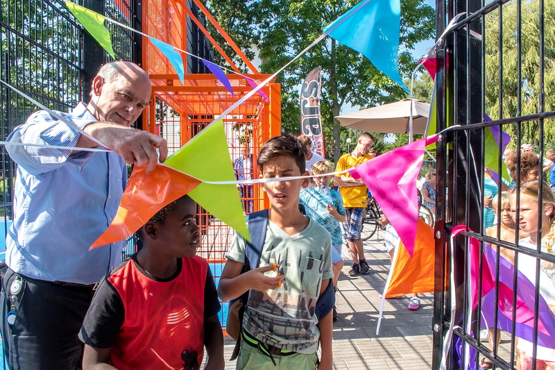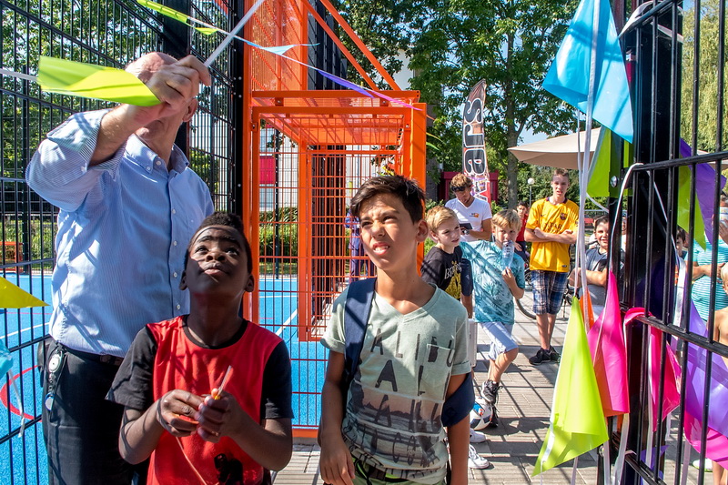 Woensdag opende Wethouder Gardeniers samen met jongeren uit de buurt de kooi met het doorknippen van de vlaggenlijn. Omwonenden waren in groten getale komen kijken en de uiteindelijke gebruikers van de kooi probeerden al volop hun nieuwe terrein uit.