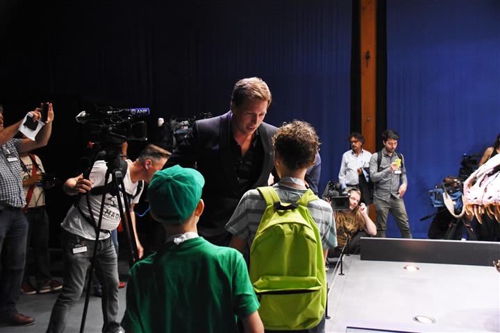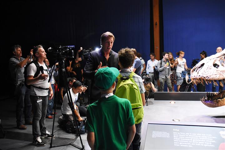 Reanne van Kleef was vrijdagochtend aanwezig bij de sneak-preview en vroeg Naturalisdirecteur Edwin van Huis, paleontoloog Anne Schulp en Leidse bioloog Freek Vonk hoe ze zich voelden nu Trix eindelijk in Naturalis staat. Ook sprak ze met Beau van Rijn die drie jaar geleden het eerste ’tientje voor T. rex’ doneerde en met Martijn Guliker van het Dinolab.