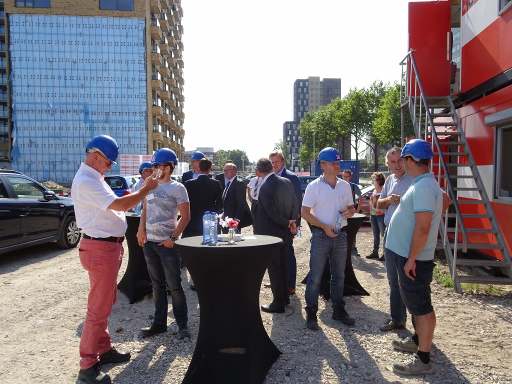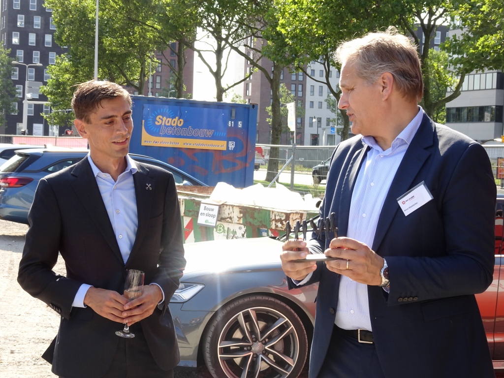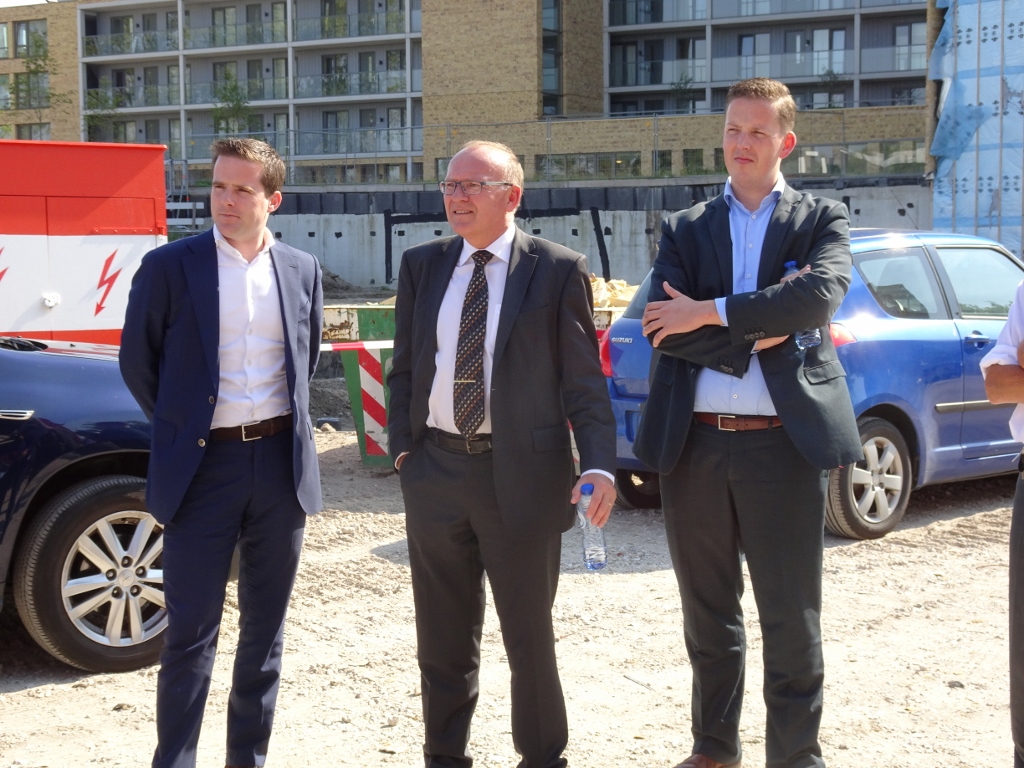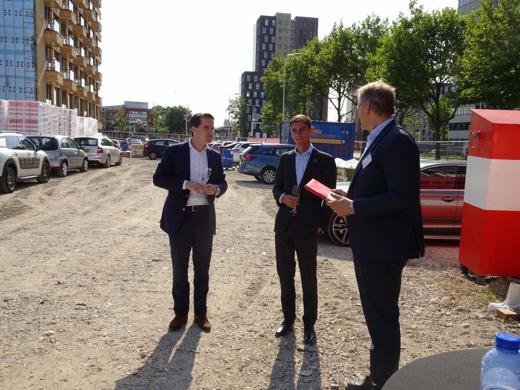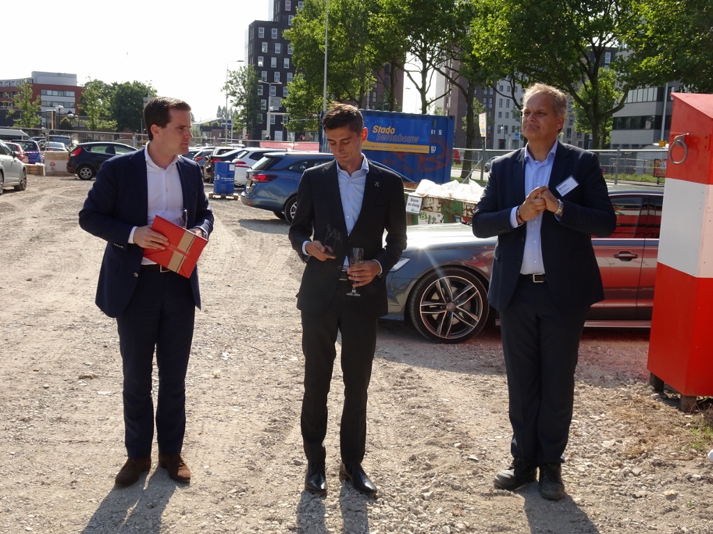 Reanne van Kleef in gesprek met bouwwethouder Paul Laudy en vestigingsdirecteur Arno Kleisterlee van Van Wijnen Haarlemmermeer B.V. over De Kroon van Noord.