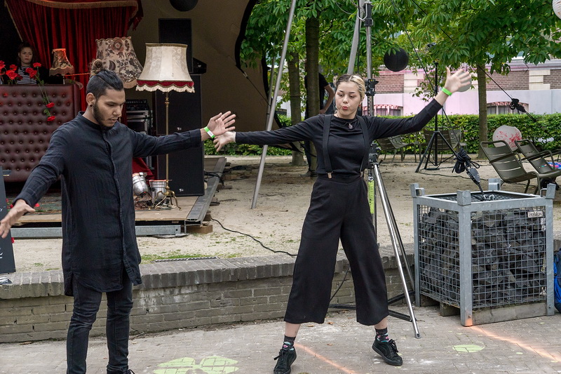 Buiten was zó veel aangenamer dan veel binnen-locaties. Niet alleen de pendelboten of de Hortus, maar ‘gewoon buiten’. Zoals voor het Academiegebouw waar de cast van Hutspot, de musical, musicalgroep De Hollandse Nieuwe, de longen uit het lijf zong en flyers uitdeelde. “We hebben er zo’n 1000 uitgedeeld. En de reacties zijn leuk, hoor. Ook van de terrasbezoekers van Barrera krijgen we applaus”. Minstens één dame komt kijken: “Ik kom zeker. Uit Amsterdam”.