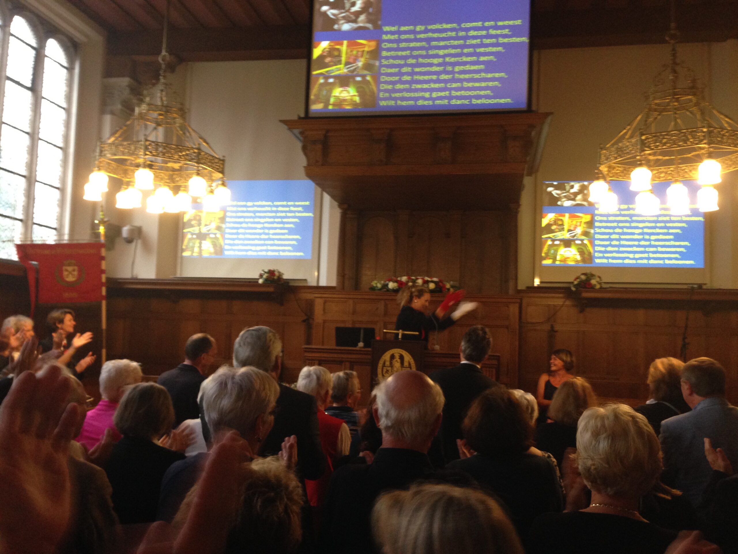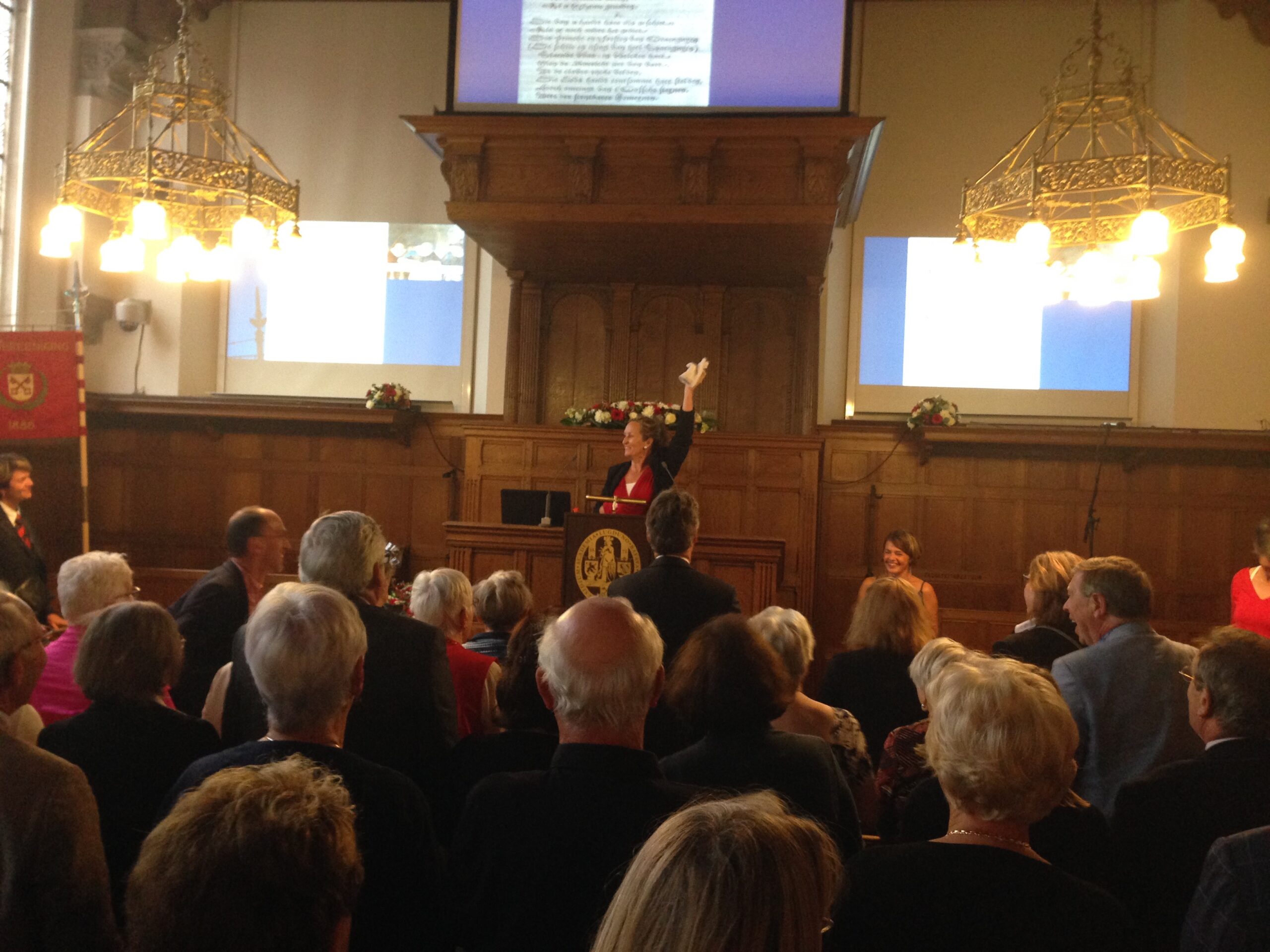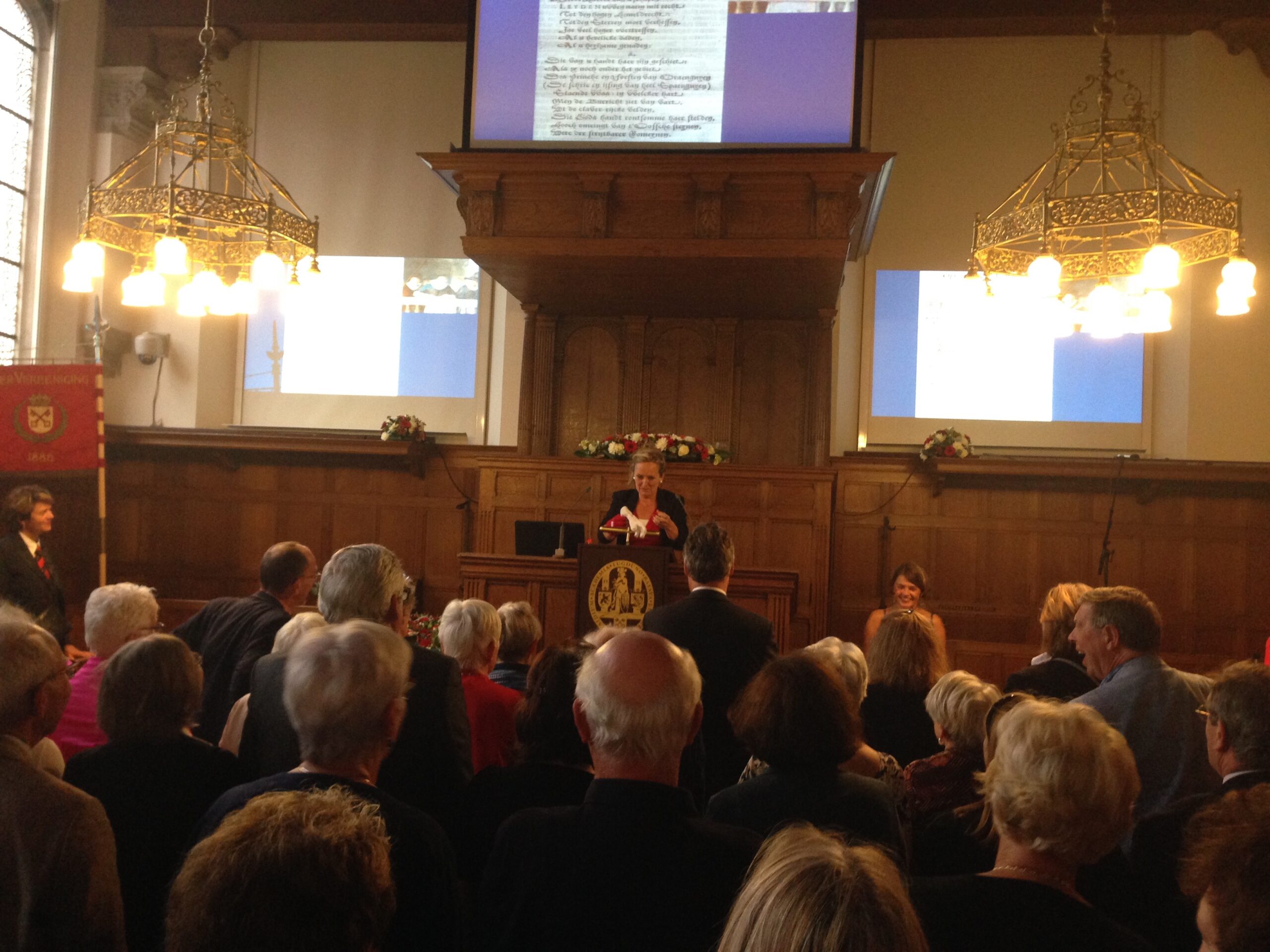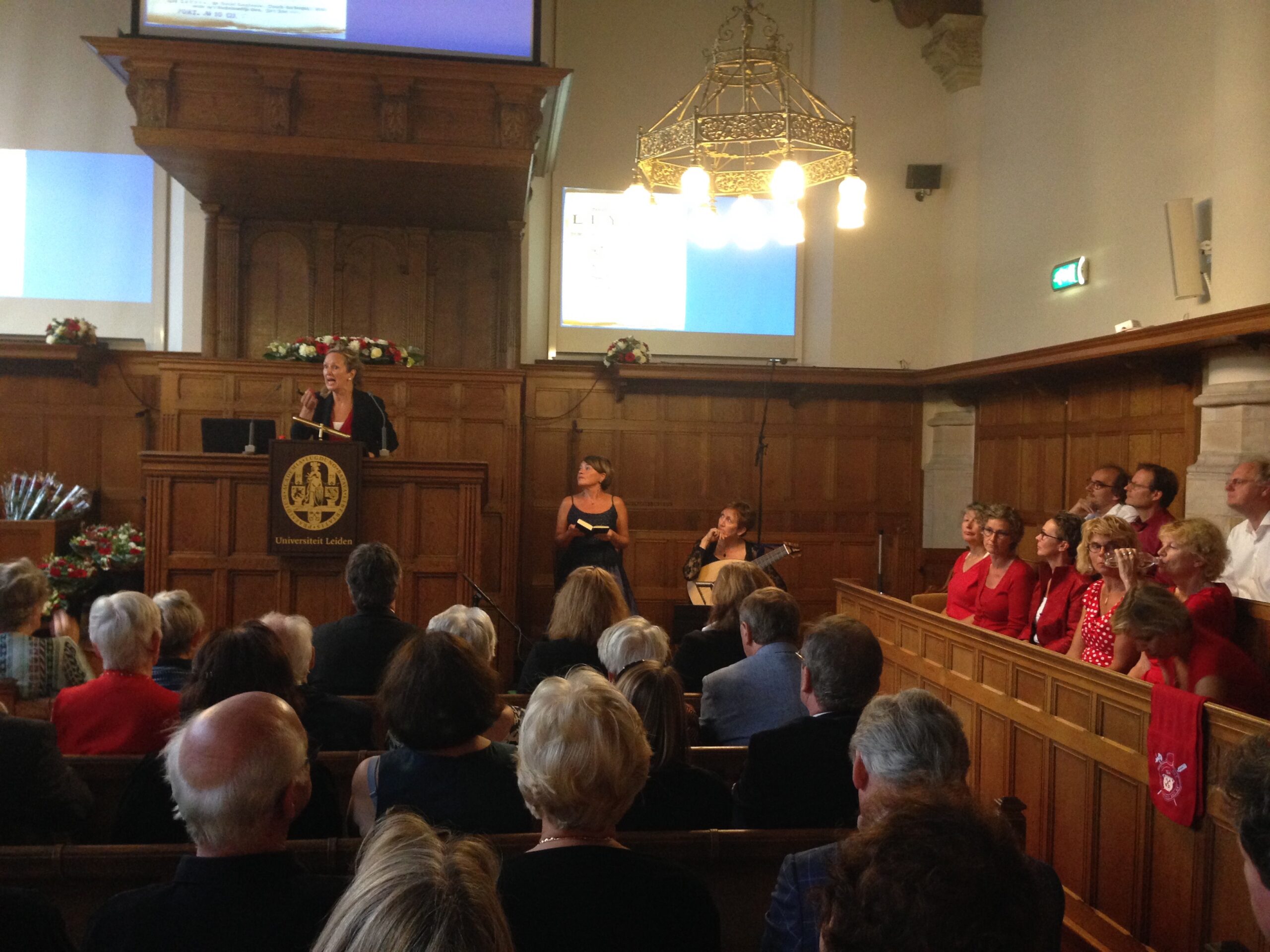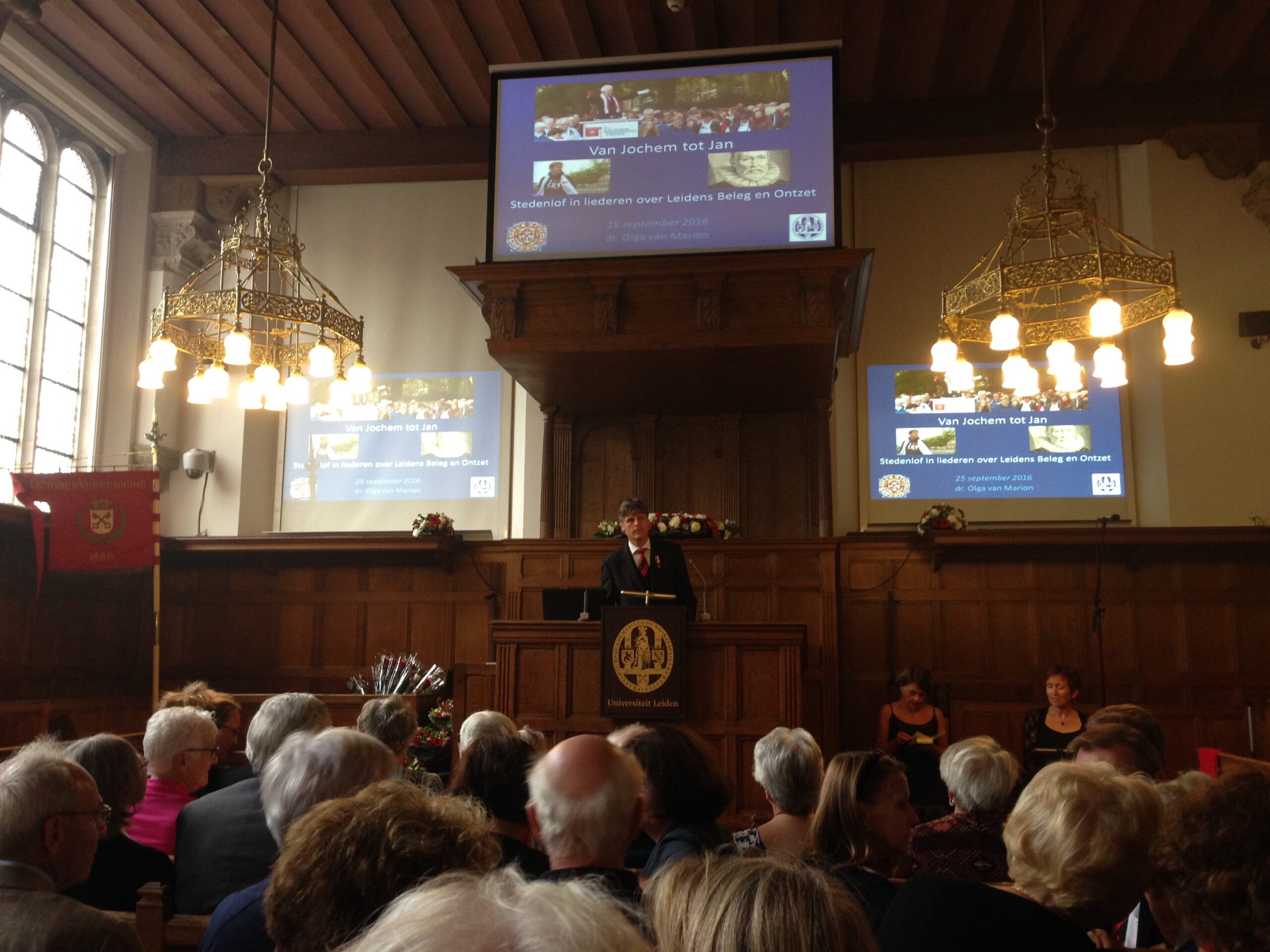 Zelfs in het Italiaans wordt er lof geuit over de standvastigheid van de Leidse bevolking tijdens het beleg van Leiden. Dat bleek gisteren tijdens de negentiende historische 3 Octoberlezing in het Groot Auditorium van het Academie gebouw van de Leidse universiteit. Universitair docent Nederlandse literatuur Olga van Marion boeide het publiek bijna negentig minuten lang met de lezing “Van Jochem tot Jan. Stedenlof in liederen over Leidens beleg en ontzet.” Dit alles omlijst met muzikale optredens van het koor het Zingend Hart, musicologe Margo Kalse begeleid door een luitiste en het publiek zelf. Na afloop was er traditioneel haring en corenwijn.