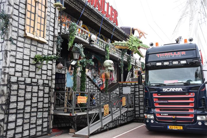 Wel anders is dit jaar dat de plek van ‘de Buurt’ beschikbaar is. Volgens de plattegrond van de gemeente gebeurt er verder niks met die grond wat attracties betreft. Op dit moment staan daar de vrachtwagens van de grote zweefmolen. Uiteraard staan de ‘Booster’ en de ‘Super Mouse’ weer op de Beestenmarkt. (Foto: Floris van der Werf).