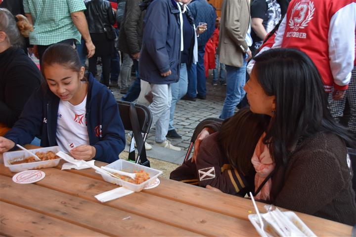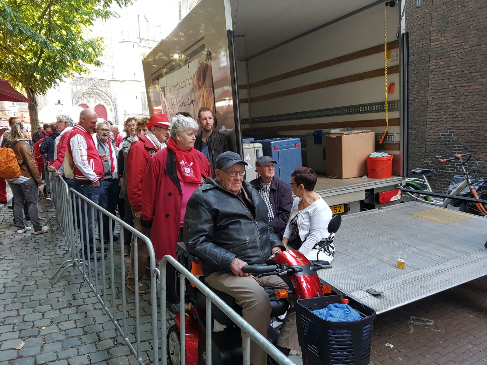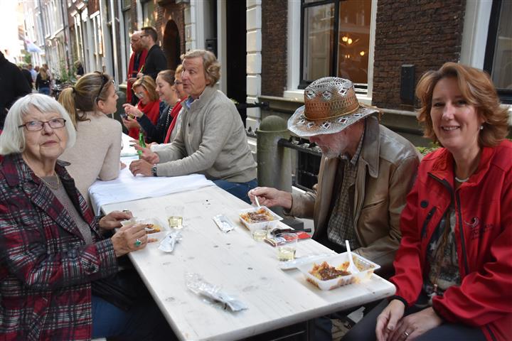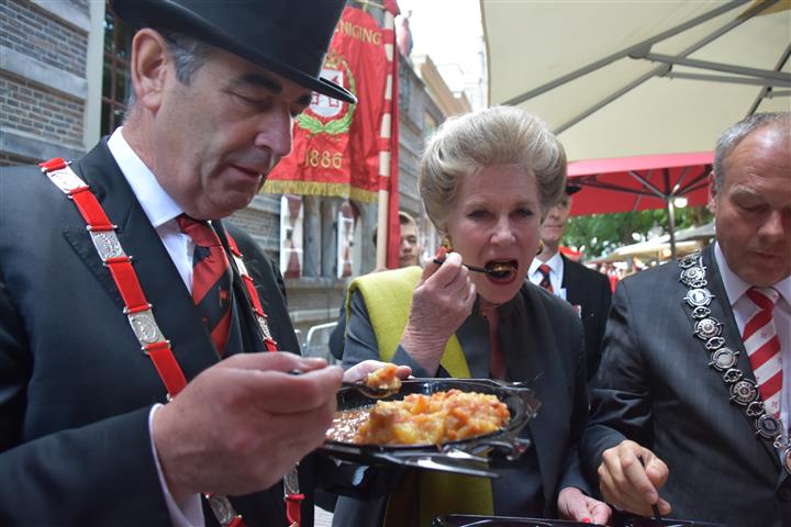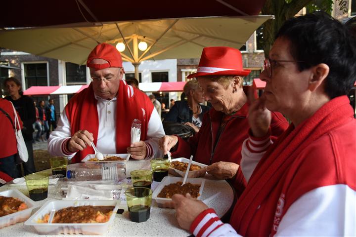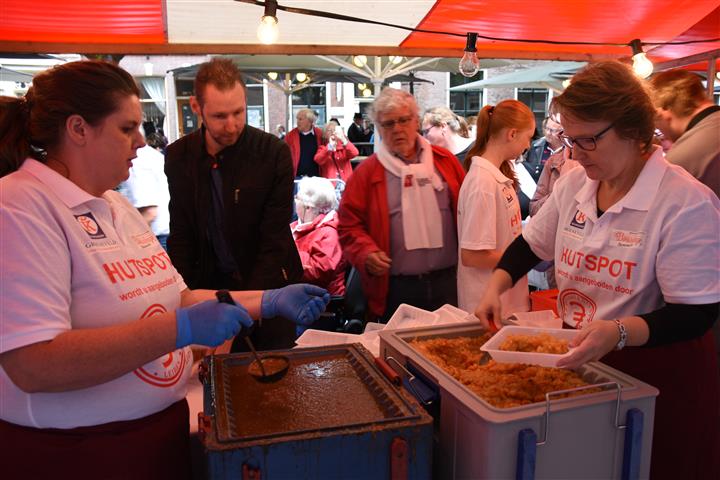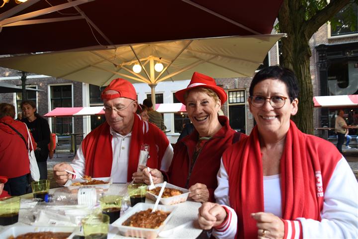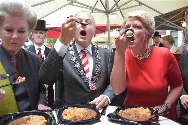 Net als ieder jaar werd ook gistermiddag de hutspot gekeurd door erevoorzitter Lenferink van de 3 October Vereeniging, de reguliere voorzitter Michiel Zonnevylle en voorzitter Gerda Schukking van het 3 October Gilde. Daarna was het de beurt aan duizenden Leidenaren die keurig in de rij hun beurt of stonden te wachten in toen nog een lekker zonnetje. Dit jaar werd er een recordaantal van 6.847 hutspotmaaltijden uitgedeeld.