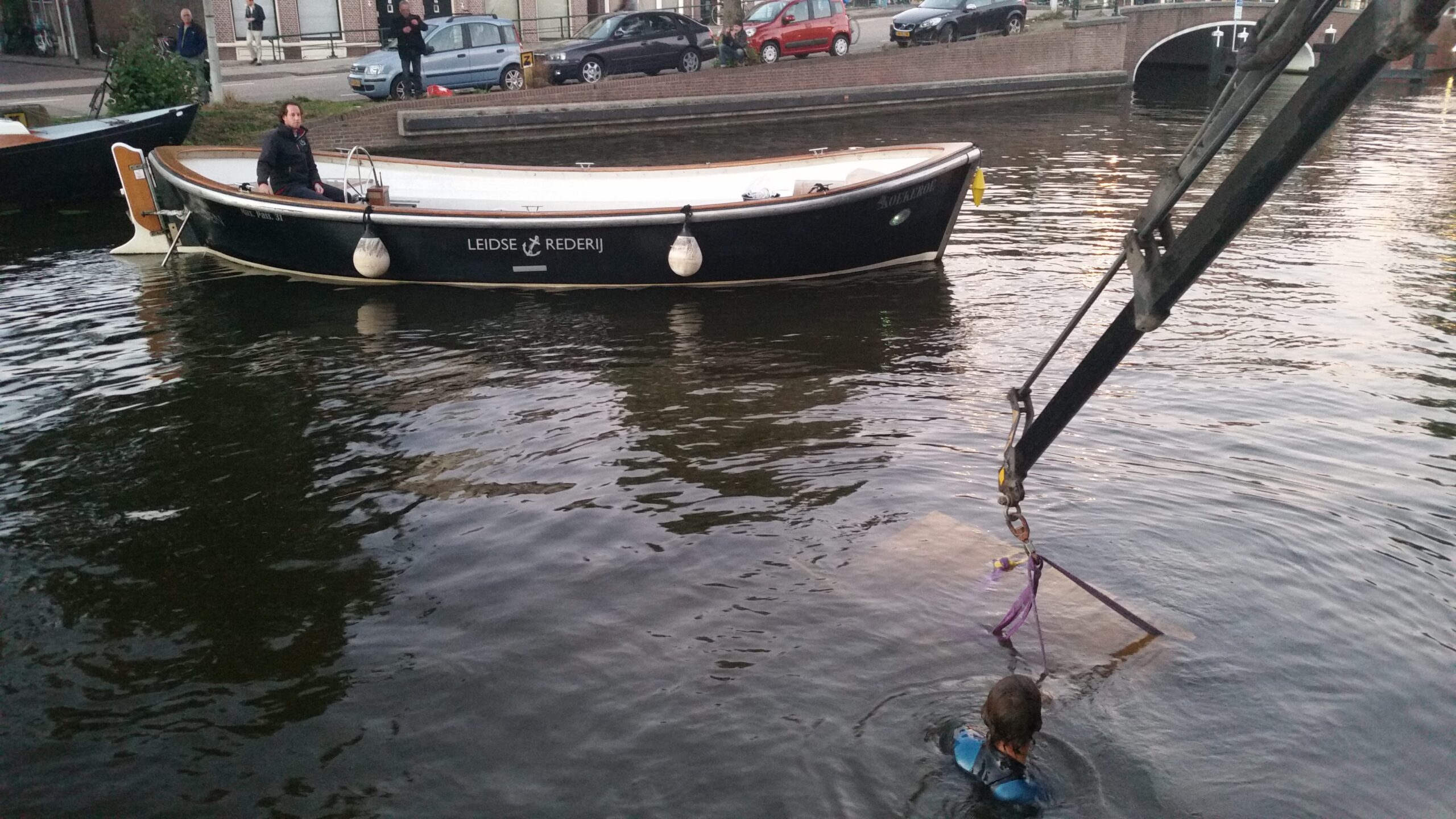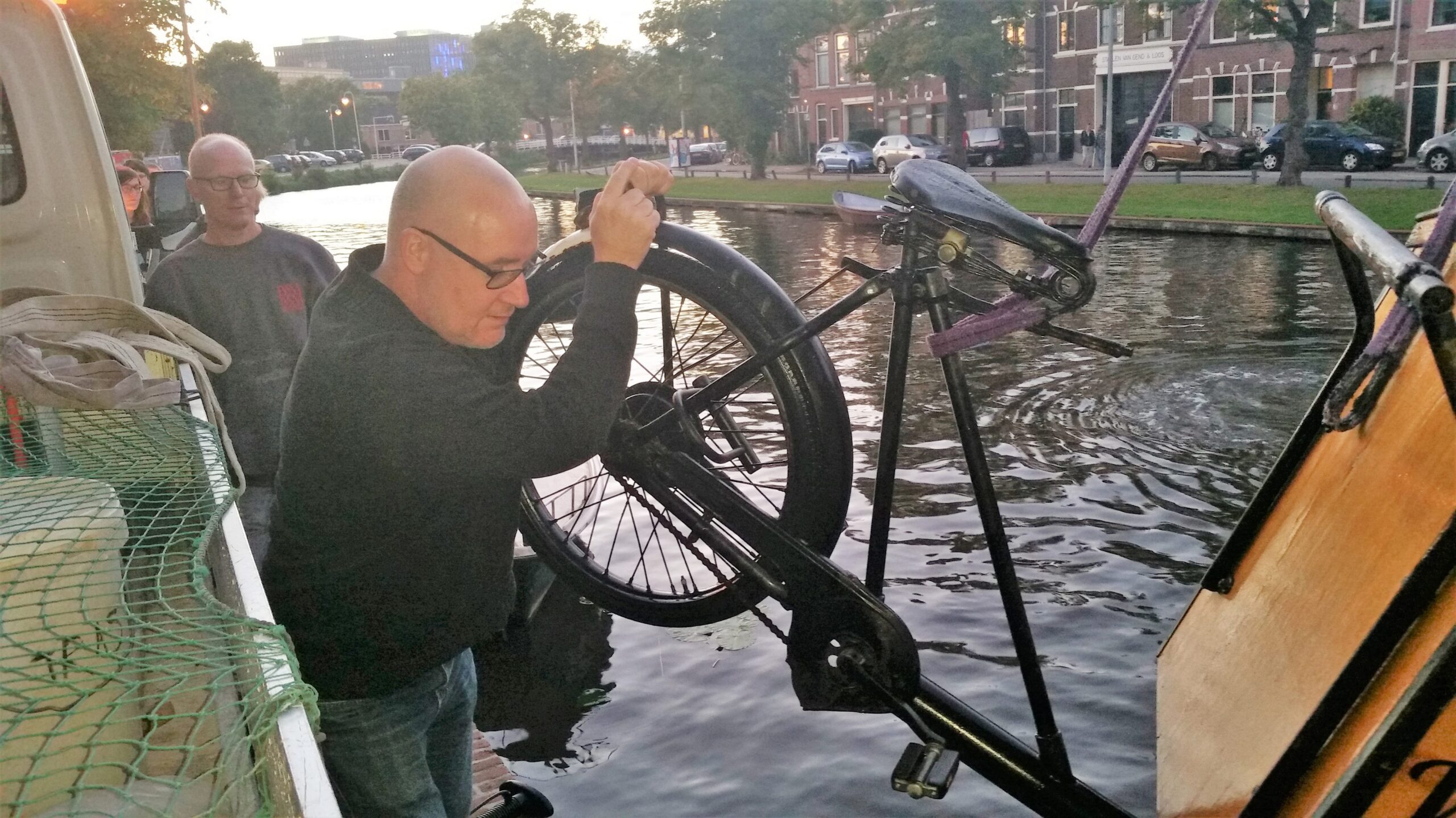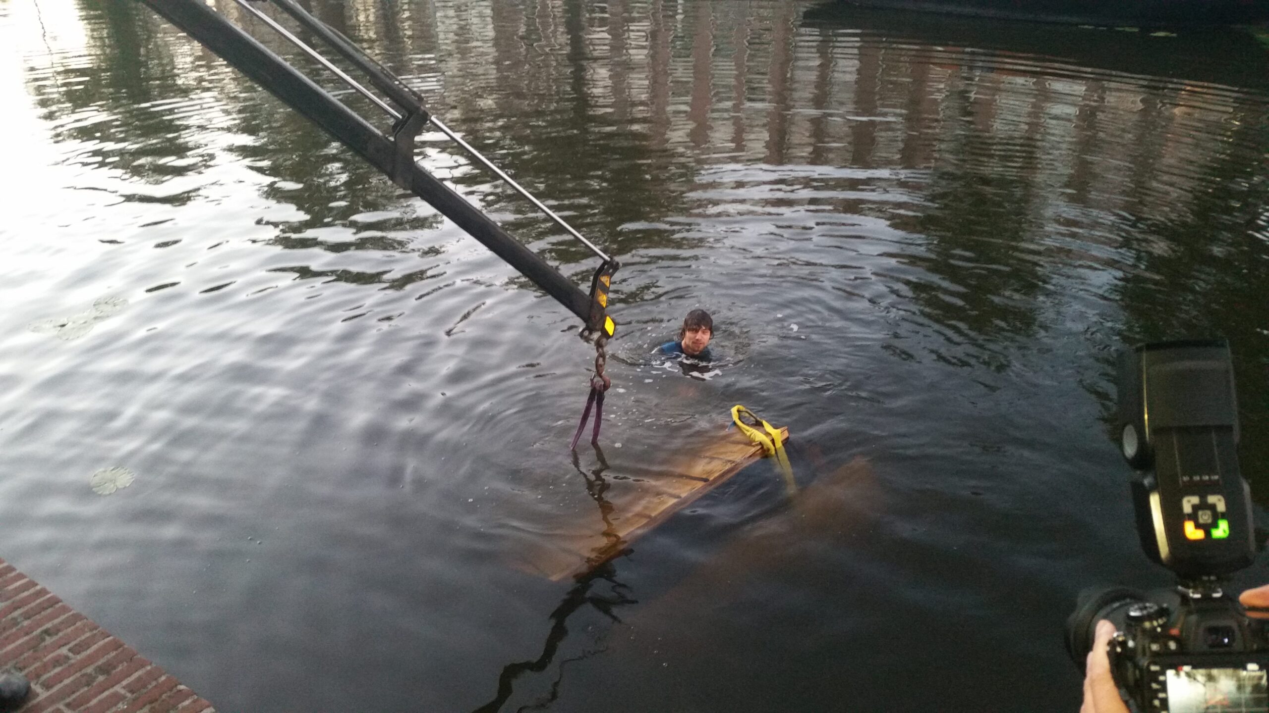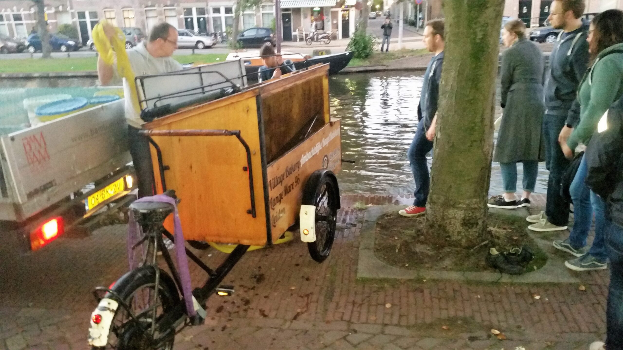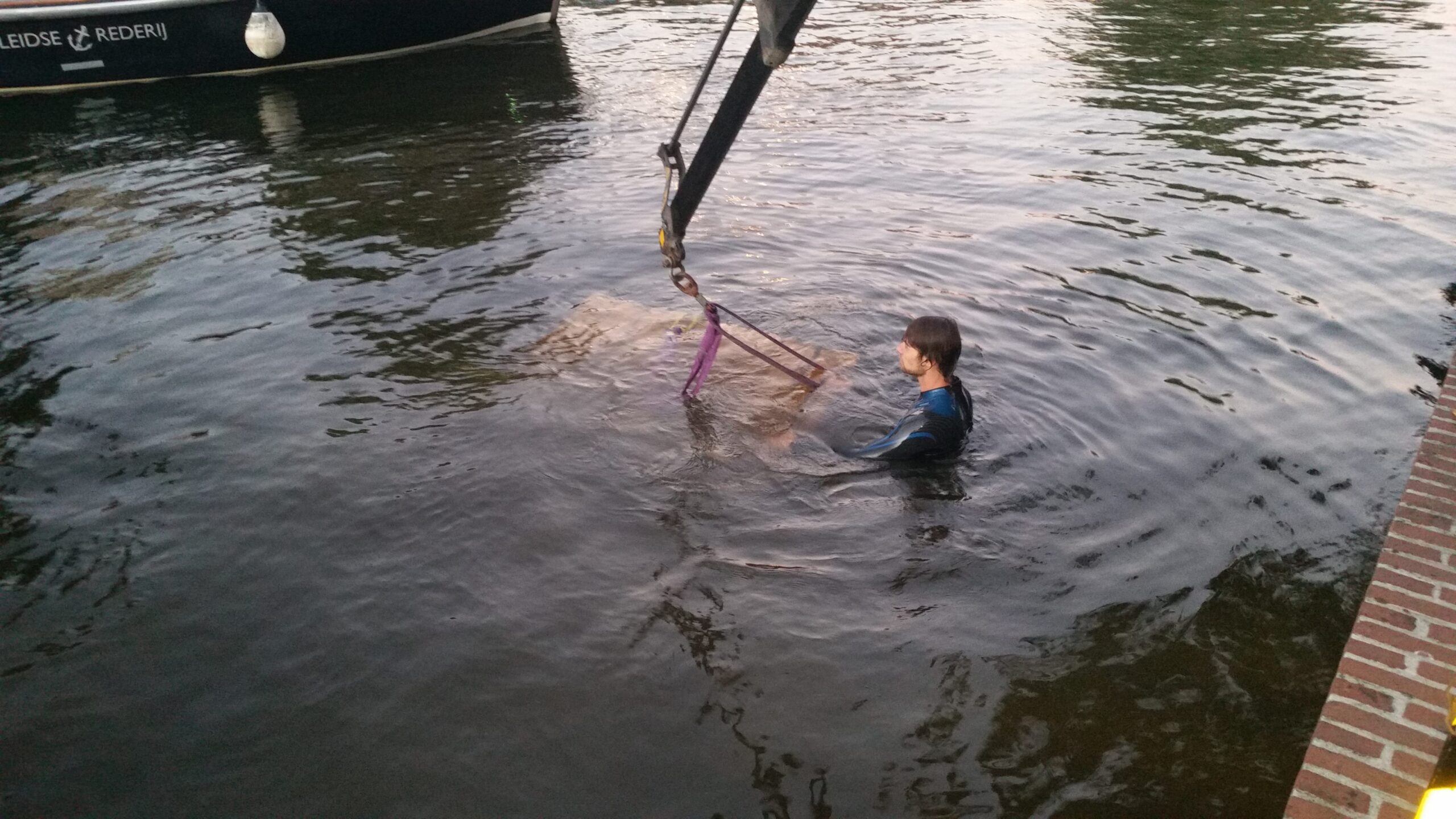 Met hulp van klanten, een duiker en de takel van BAM BAM Steenhouwers stond de bakfiets binnen de kortste keren weer op het droge.