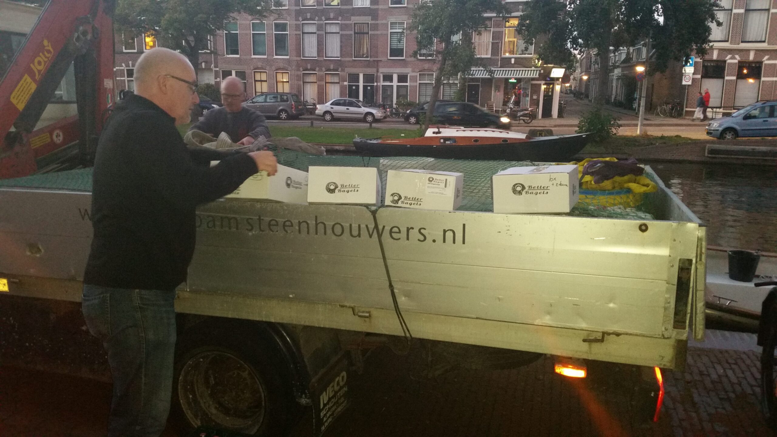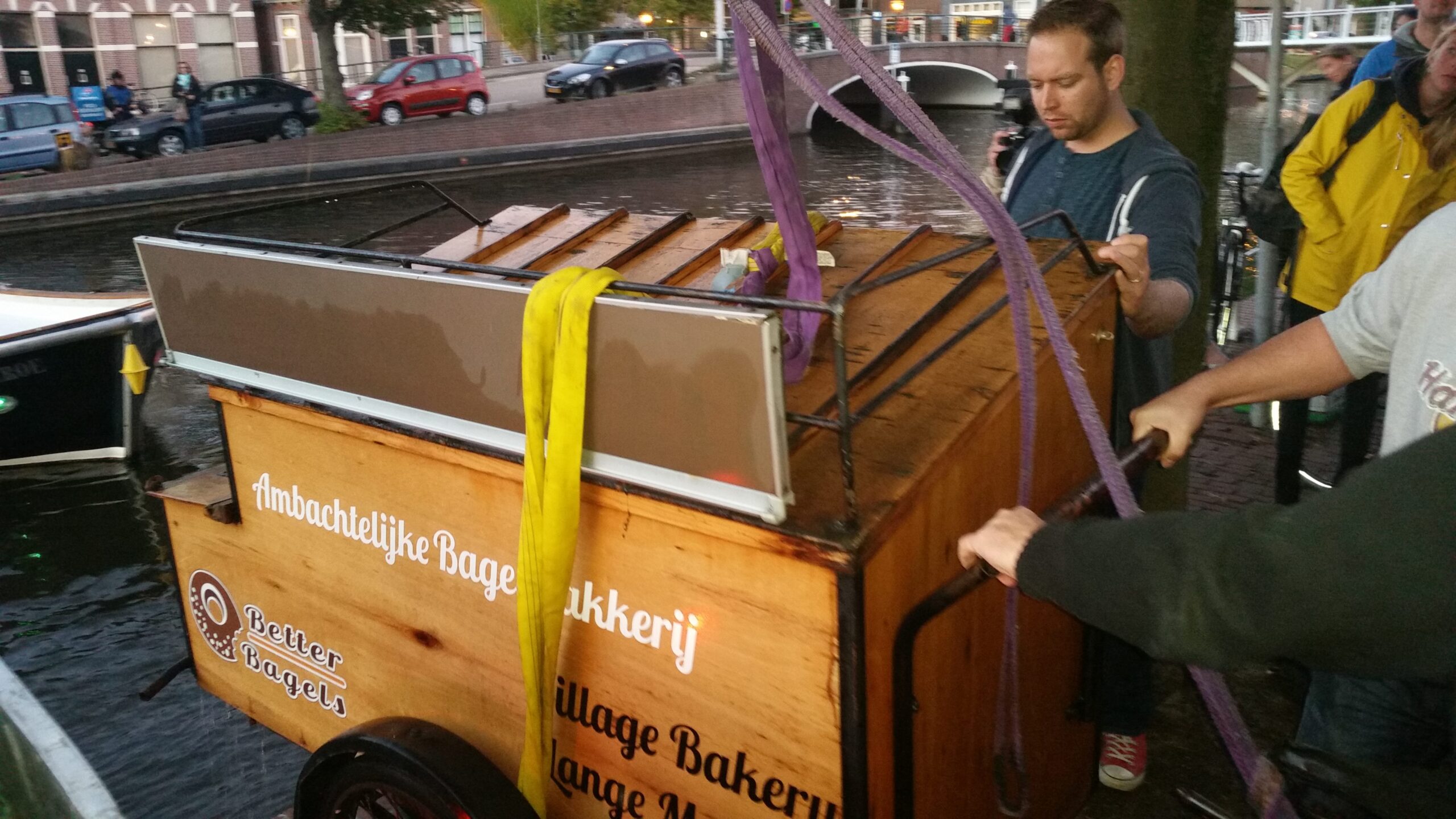 Het optakelen van het enorme gevaarte leek nog een uitdaging te worden. Better Bagels maakte er een Facebook evenement van en gisteravond kwamen tientallen mensen hun hulp aanbieden. Inclusief een duiker en het bedrijf Bam Bam Steenhouwers die met een takel ter plaatse kwam om de bakfiets op de wal te hijsen.