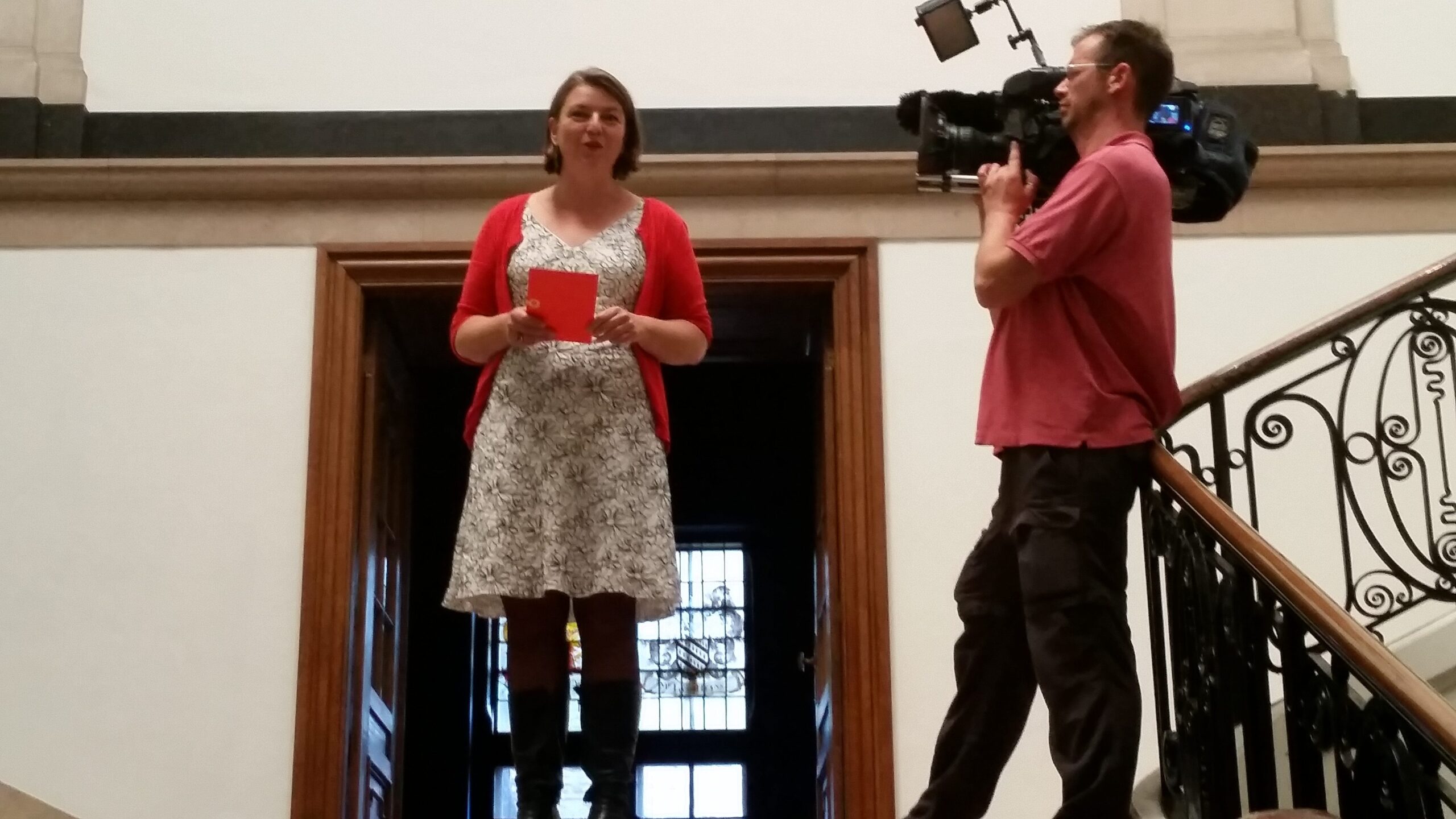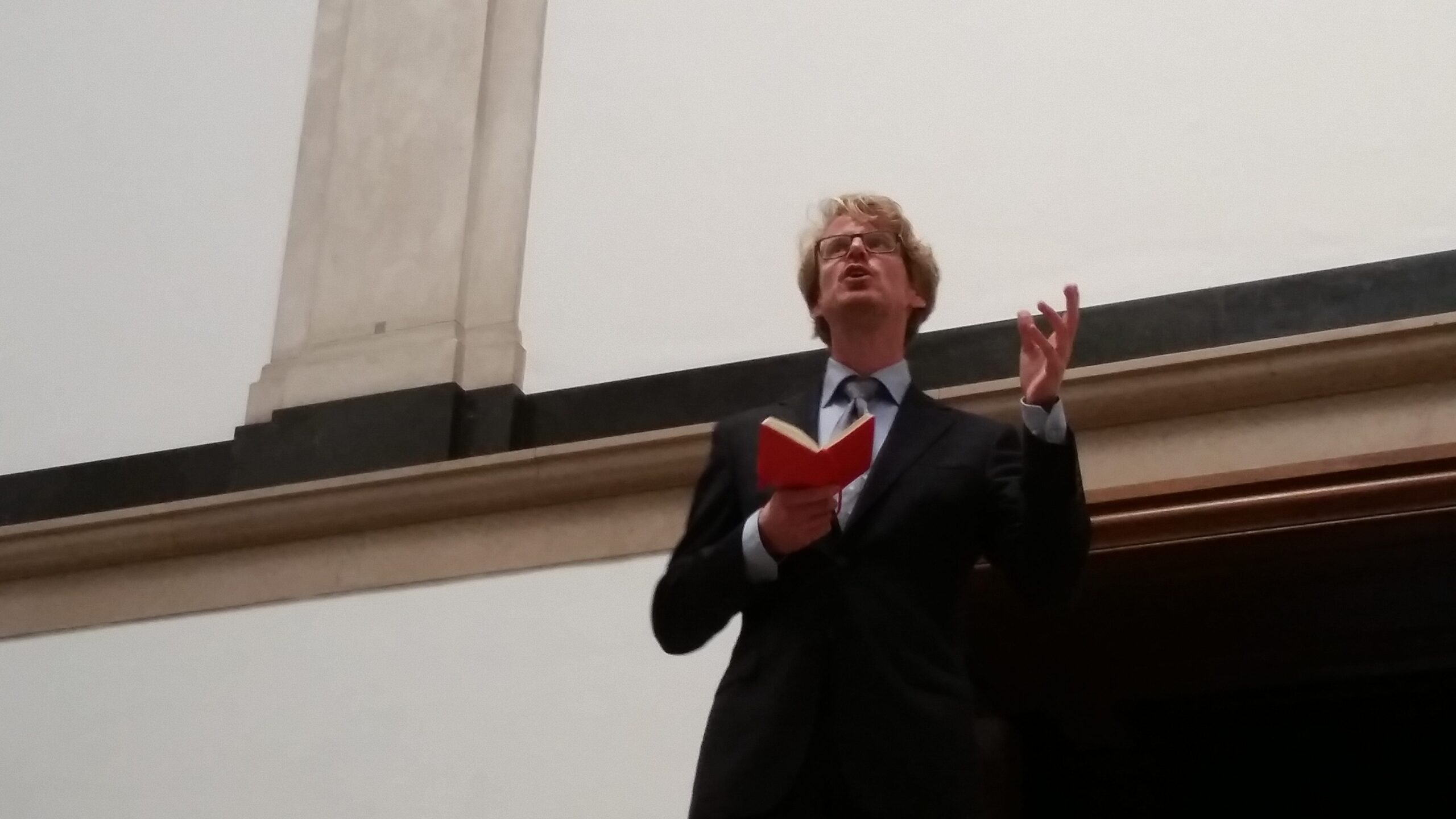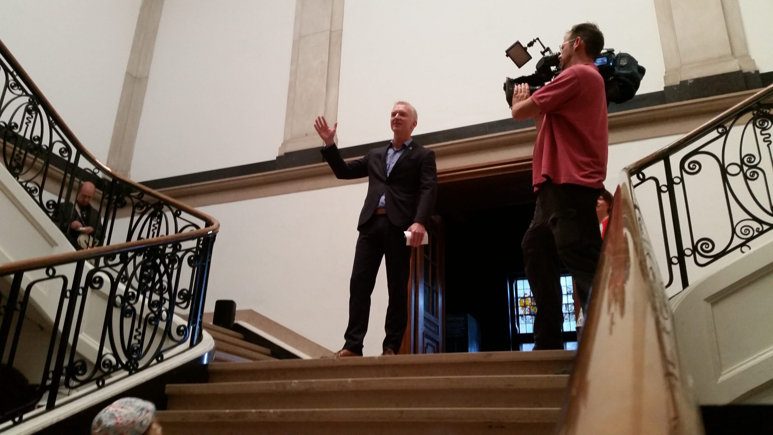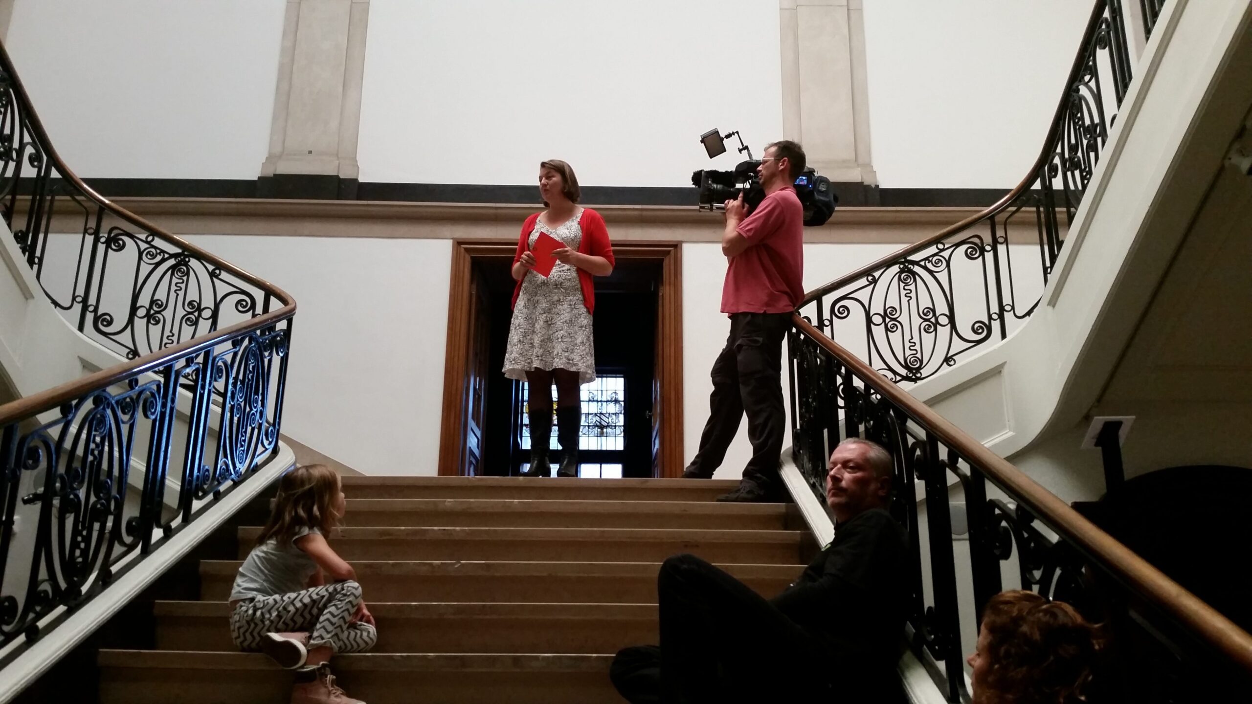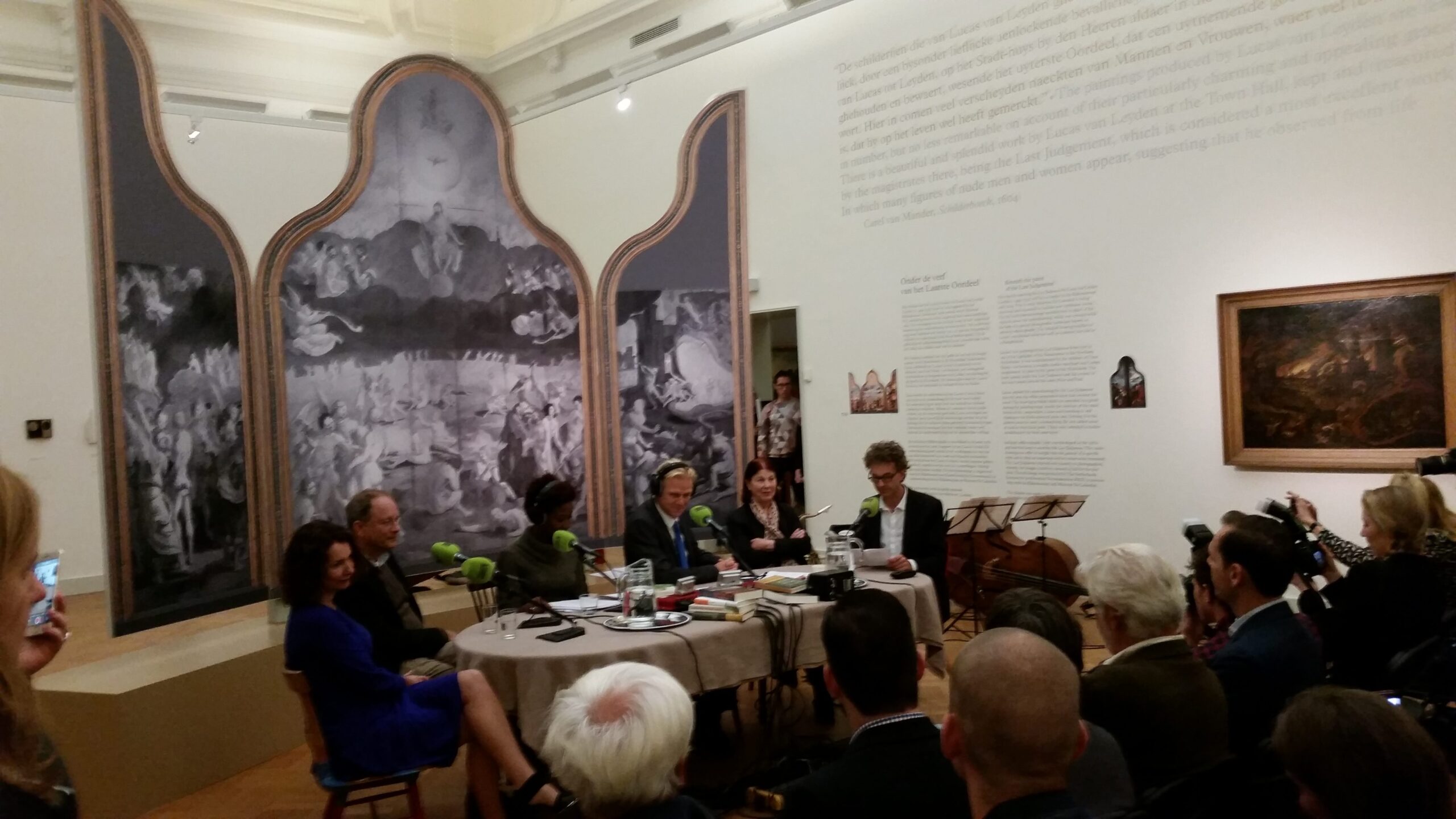 Chris de Waard maakte een radioverslag over de uitreiking van de Jan Wolkersprijs in de Lakenhal.