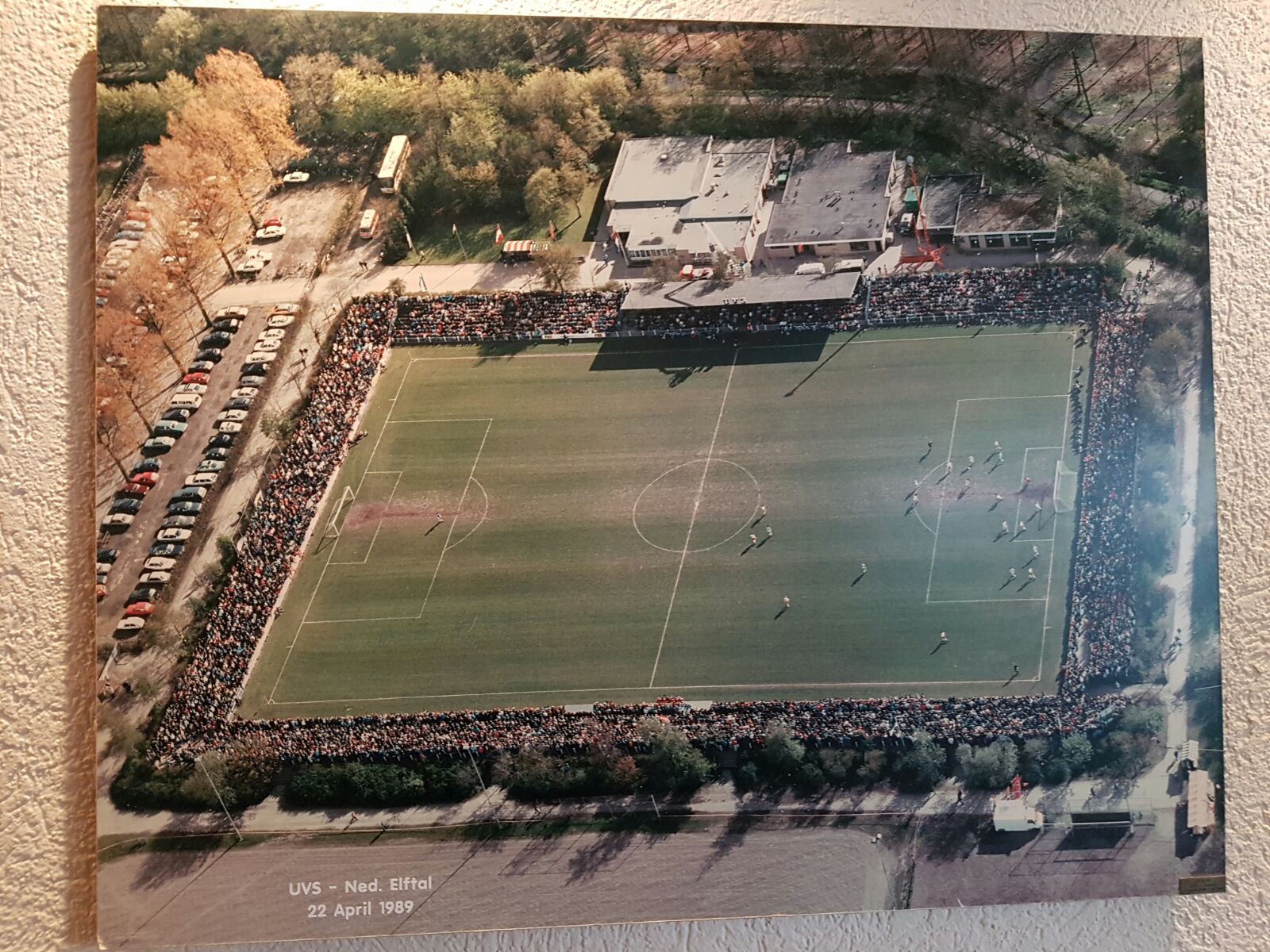 In de kantine hangt een foto van de wedstrijd van UVS tegen het Nederlands Elftal in 1989. Duizenden bezoekers bezochten de Kikkerpolder en klommen zelfs in de bomen. Voorzitter De Tombe wil deze tijden met de opening van de nieuwe tribune laten herleven.