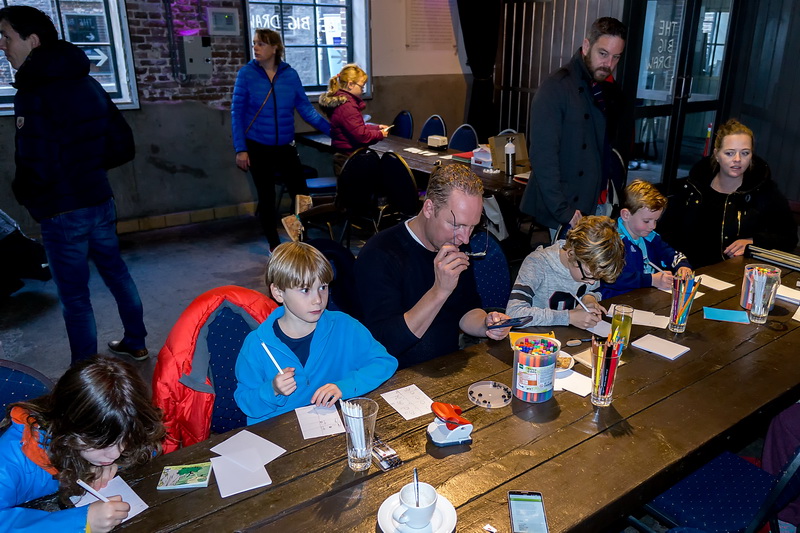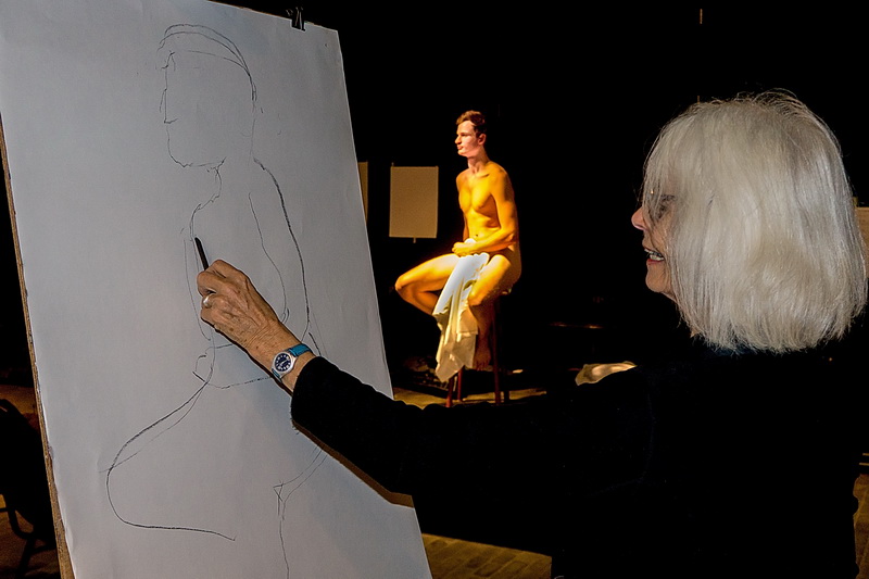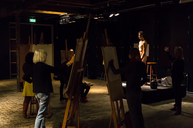 Kunnen kijken is niet voldoende voor een geslaagde tekening. Vaardigheid – en dus oefenen – speelt ook een rol, zeker als het gaat om zoiets als een menselijk lichaam tekenen. Onder begeleiding van kunstenaar Saskia Masselink kon in de theaterzaal ‘naar een model’ worden getekend. Kunstenaar Hans Bonte liep rond om bezoekers het portrettekenen onder de knie te laten krijgen, in elk geval de beginselen.