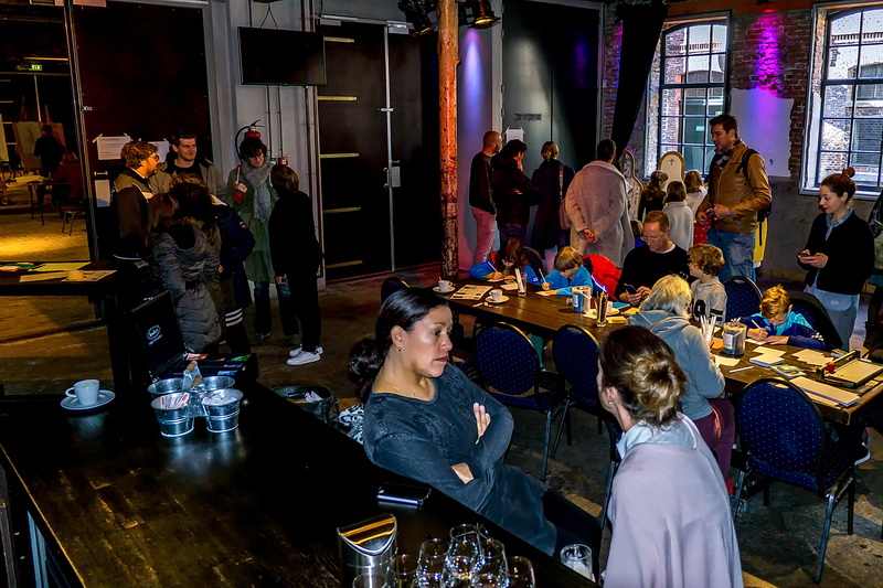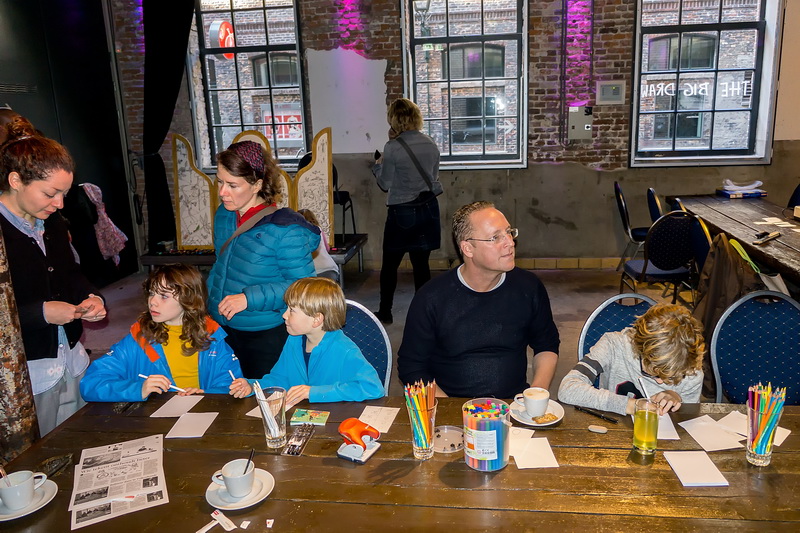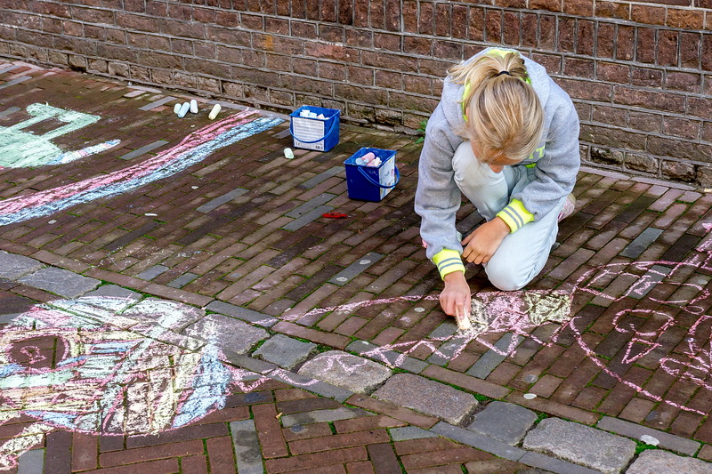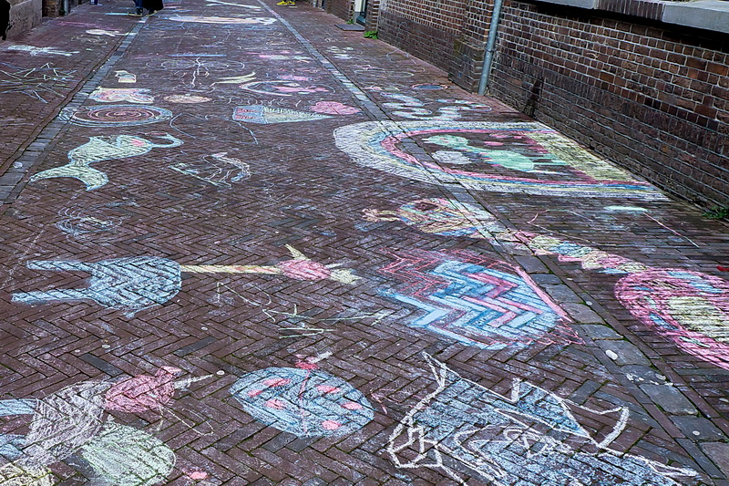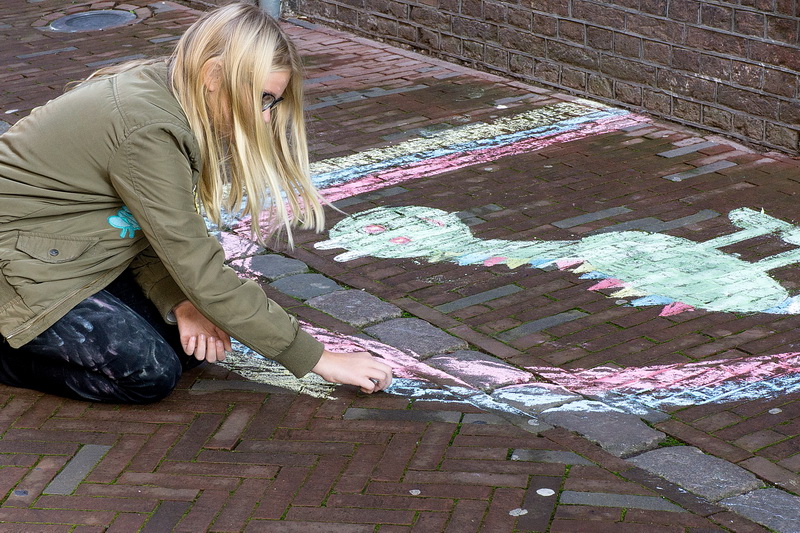 Buiten, in de Marksteeg, was een stoepkrijtwedstrijd van het Jeugdcultuurfonds aan de gang die leidde tot een vrolijke beestenbende. Dat was ook de sfeer: gezellig, ongedwongen en open om eens uit te proberen of ook jij kunt tekenen. Niet dat dat echt héél eenvoudig is. Maar dat tekenen begint met kijken, was wel duidelijk.