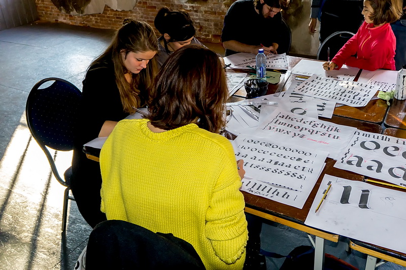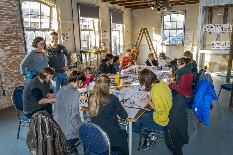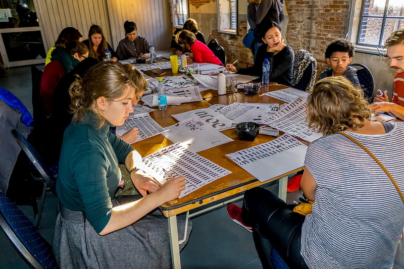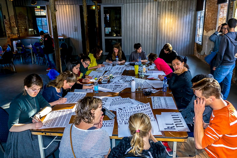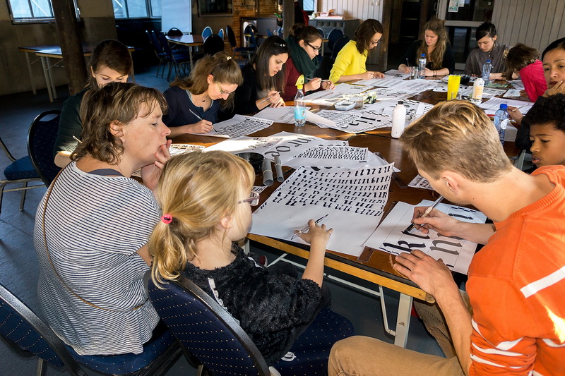 Op de eerste verdieping was de concentratie voelbaar aan de kalligrafeertafel van Type on High. Met de tong tussen de tanden waren bezoekers bezig met Oostindische inkt letters regelmatig en zwierig op papier te krijgen. Hoe ontwikkel je getekende symbolen die je kunnen helpen om dingen te onthouden? Bij de workshop Aantekenen van Marieke van der Velden werd het geduldig uitgelegd en geoefend.