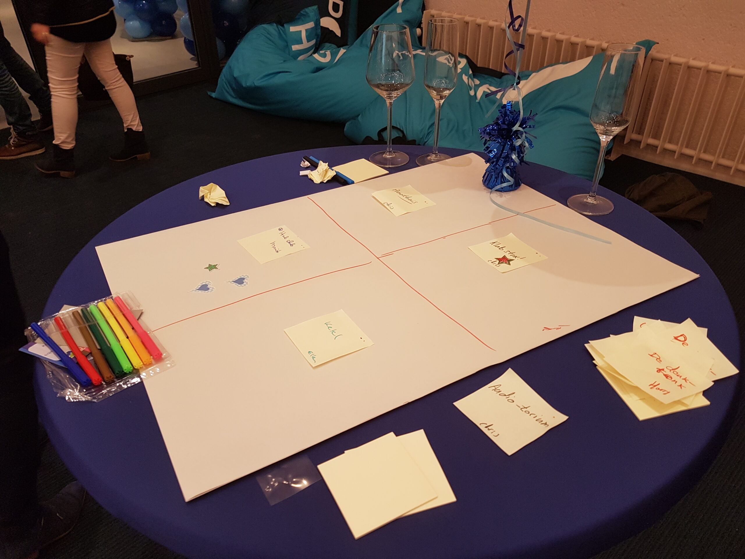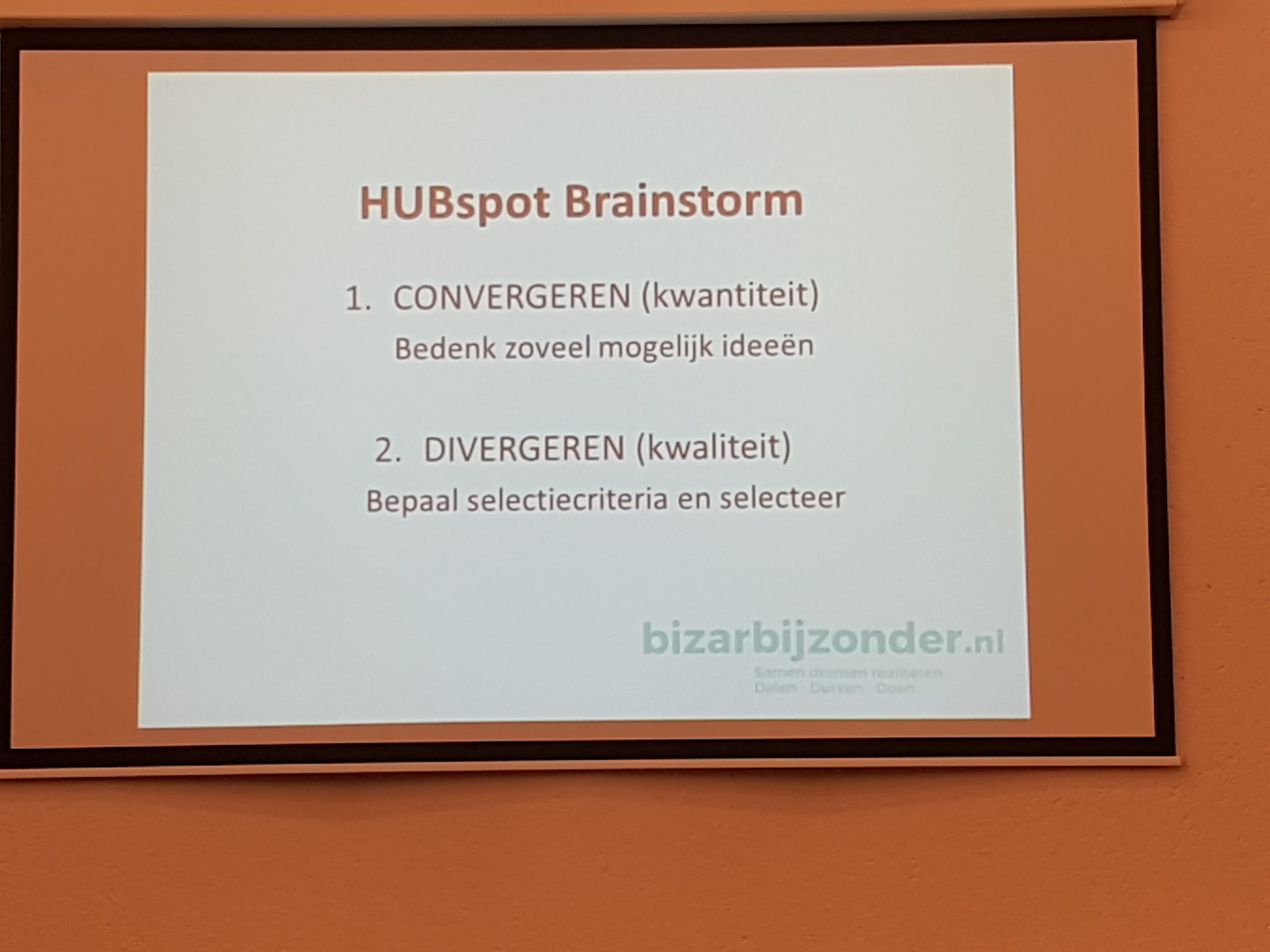 Ook werd er een brainstormsessie georganiseerd om het auditorium van HUBspot van een naam te voorzien. In groepjes eerst convergeren en daarna selecteren. Uit de tientallen naamsuggesties koos de jury onder leiding van vice-voorzitter Willem te Beest van de Universiteit Leiden voor de naam Spotlight.