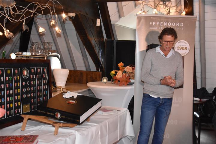 Feyenoord de Grootste. Dat is de titel van het XXL boek dat Leidenaar Jaap Visser over Feyenoord schreef. Gisteren nam Koetshuiseigenaar en groot Feyenoordfan Tom Holswilder onder toeziend oog van een aantal Leidse (ex)profvoetballers zijn exemplaar in ontvangst. Het boek weegt ruim dertig kilo, omvat 890 pagina’s, is 50 x 50 cm groot en kost 999 euro.