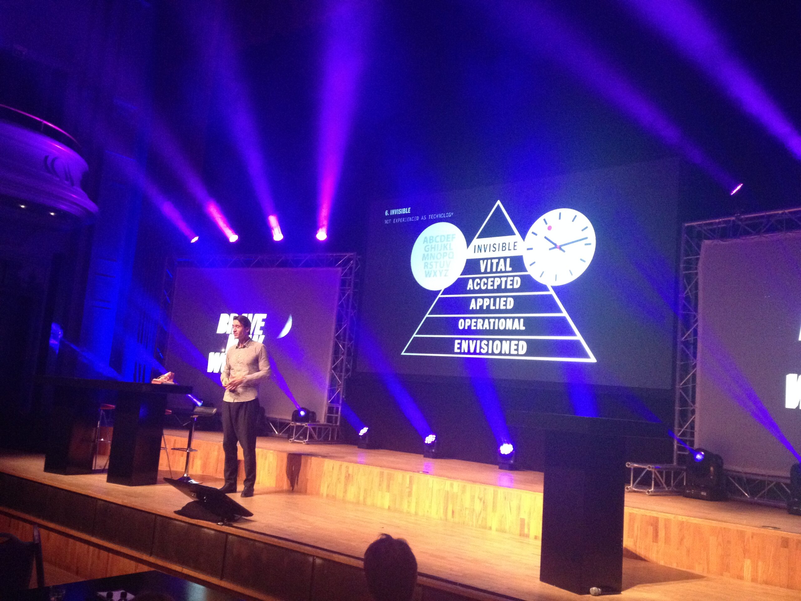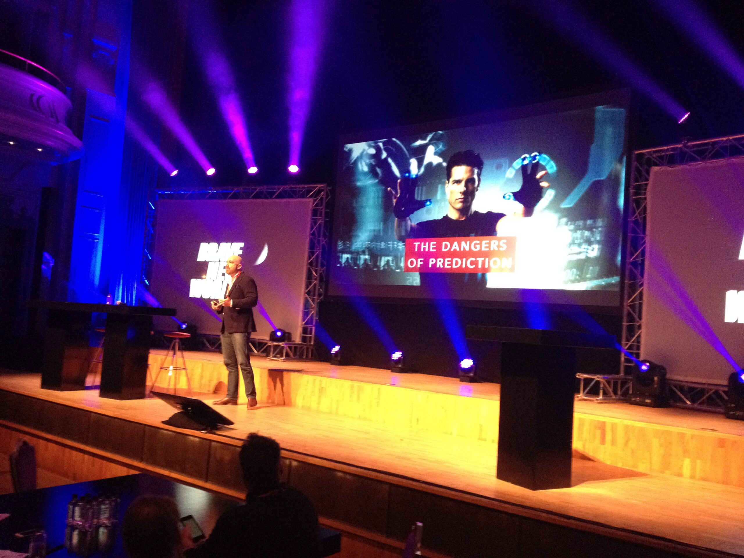 Ook deze tweede dag wordt gekenmerkt door tegenspraak in de goede zin van het woord. Jim Stolze (RTL-Z) neemt een positie in die even later feitelijk wordt bekritiseerd “explaining two exponential technologies that are changing our world”. Het absolute in die positie is dat wat Augé (EUR) zal beschrijven als “propaganda”. “Propaganda is everywhere, and there is more then ever before”. Augé ziet het overal om ons heen: de tendens in dichotomieën te spreken, vóór of tegen. Hij haalt Jules Verne en H.G.Wells aan die met ‘science fiction’ een weg aangaven “to protect me from propaganda. Science fiction is about inventing and preventing, not predicting. (…) The future doesn’t exíst. You can’t predict it”. Dat is nu precies wat Stolze, en later Mark Stevenson, wel lijken te doen. Een onontkoombare toekomst van steeds snellere technologische ontwikkeling. “Dangers of prediction”, volgens Augé “de voorspelling op zich zorgt er voor dat de voorspelling kan uitkomen”.
