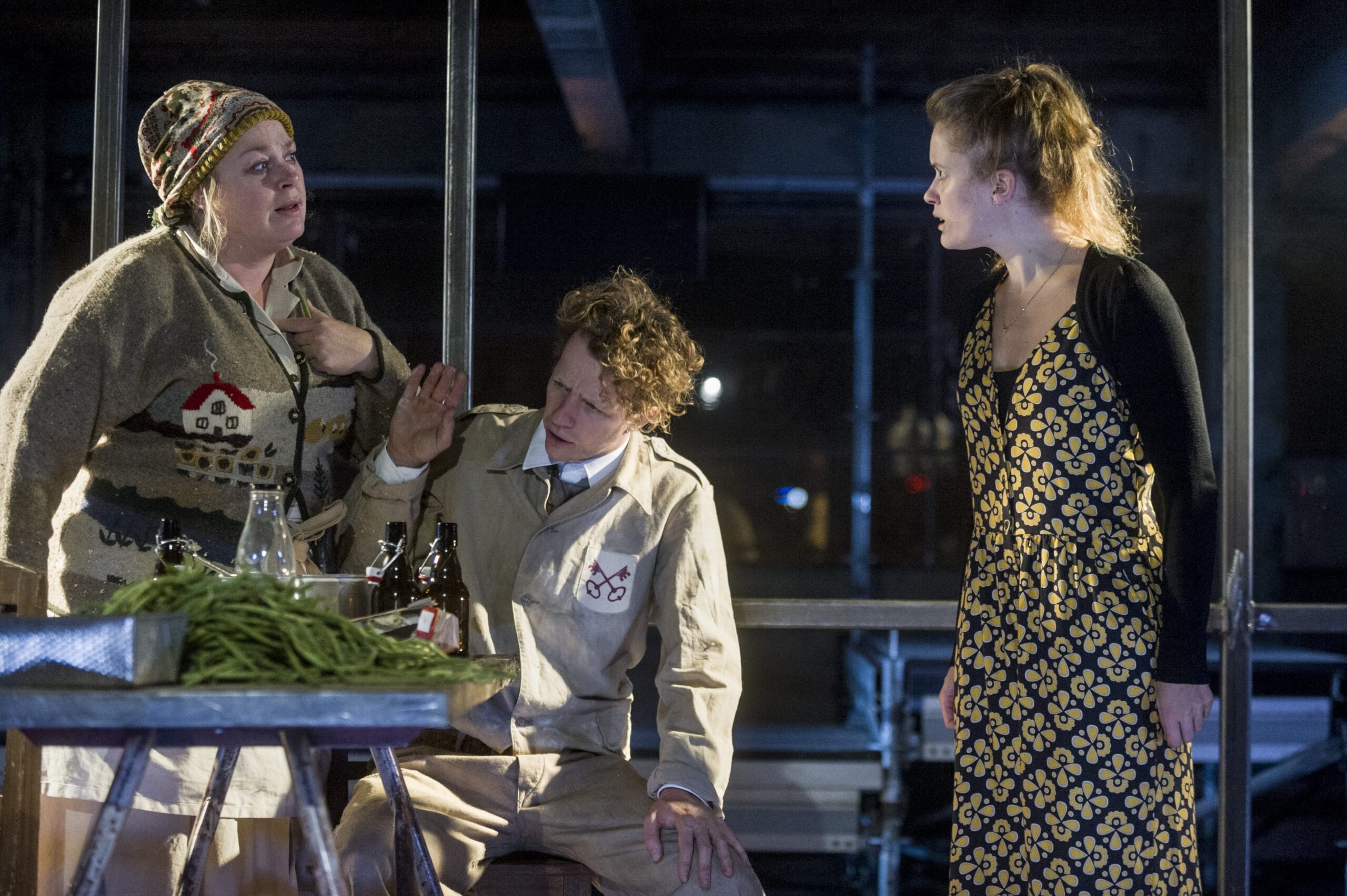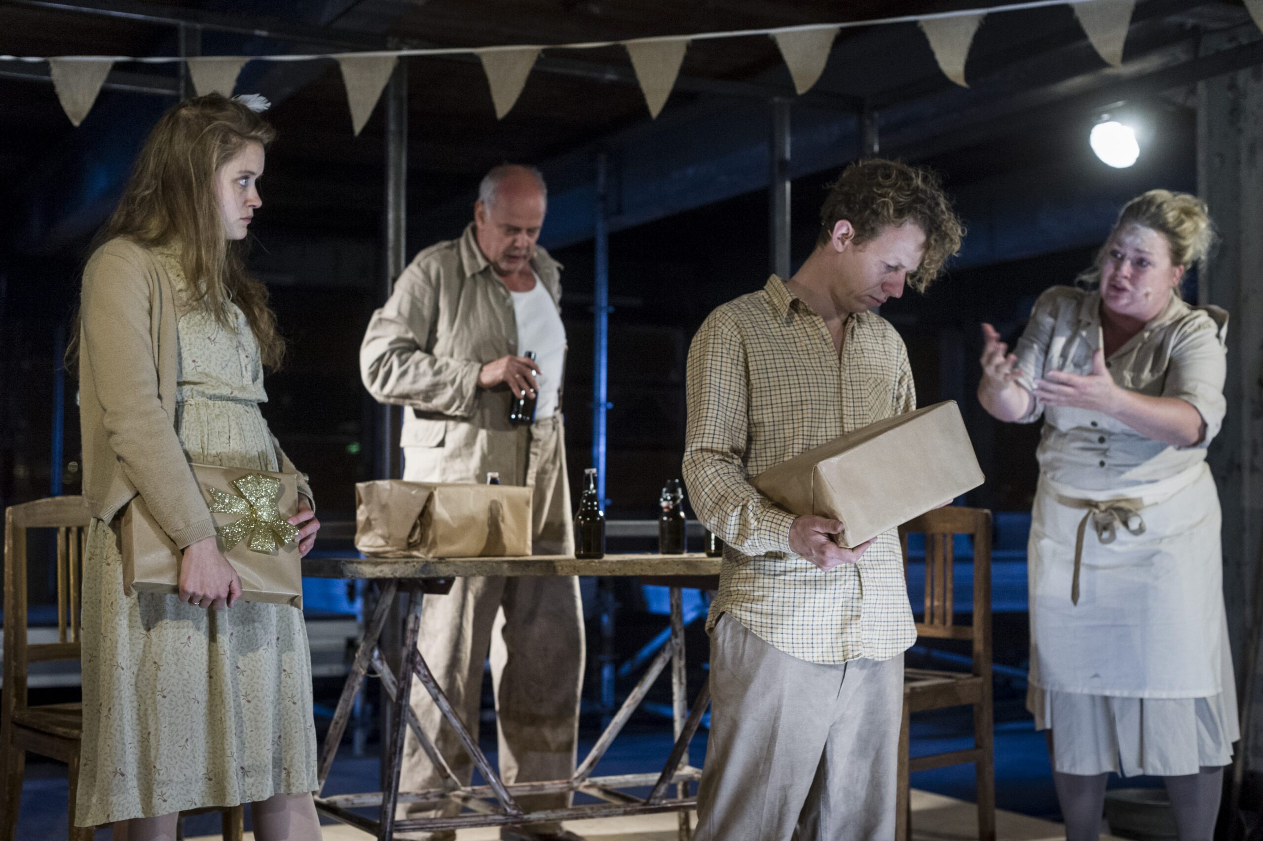 De voorstelling is zeker de moeite waard. Voor je het weet, vergeet je bijna de muzikanten. Dienend aan het verhaal leiden zij de toeschouwer door de tijdvakken. Rian Evers doet dat weer met mooie vertelliedjes en een niet ter versmaden ‘duo’ met Wil van de Meer. Samen met Ralf Gerritse verzorgt zij ook het geluidsbeeld, van sinistere industriegeluiden tot en met de radio-omroepster (die jarenlang dezelfde prijzen voor melk omriep?!). Evers presteert het ook om in één klap om te schakelen van zang- naar spreekstem. Ook de a capella groepszang van Act of Mutiny bepaalt de sfeer in hoge mate. Door hen op verschillende plaatsen in het toneelbeeld te laten opduiken, gebruikt regisseur Smit meteen ook de héle (grote) ruimte die de fabriekshal toch is. Móói zijn de (zang)scénes op afstand, met warmer licht dan op de speelvloer, en die rond de radio; zeker als abrupt de knop wordt omgezet.