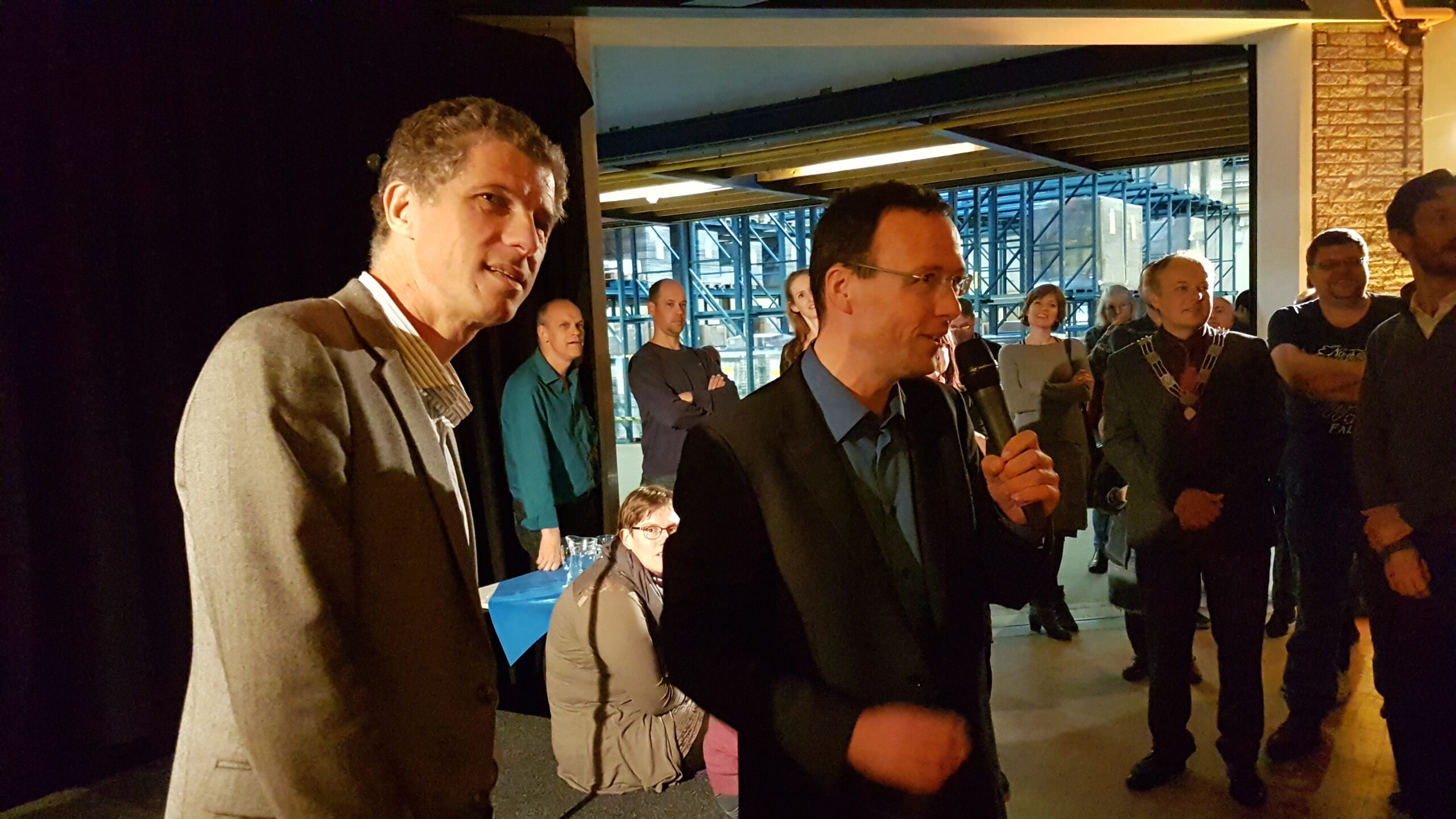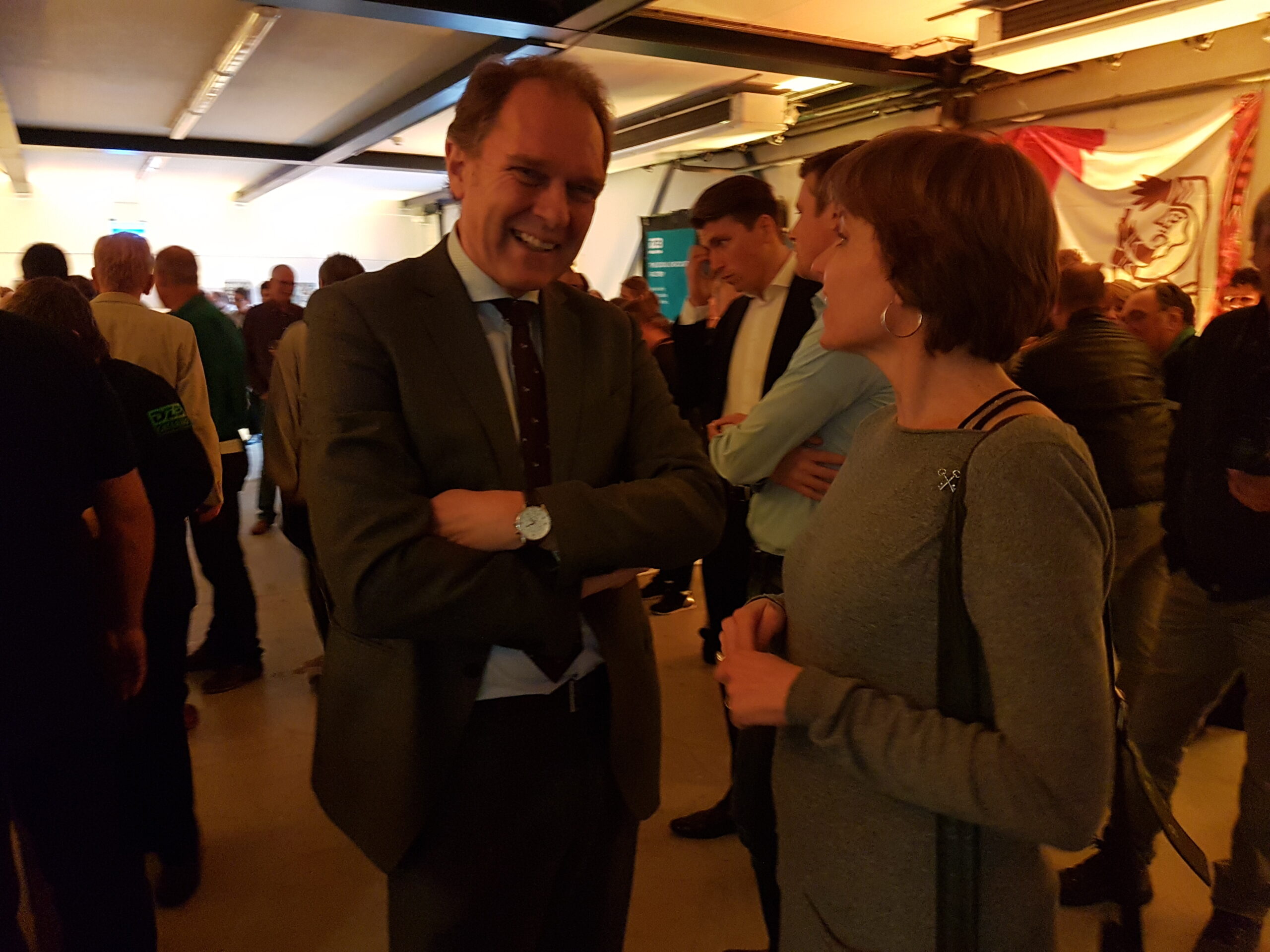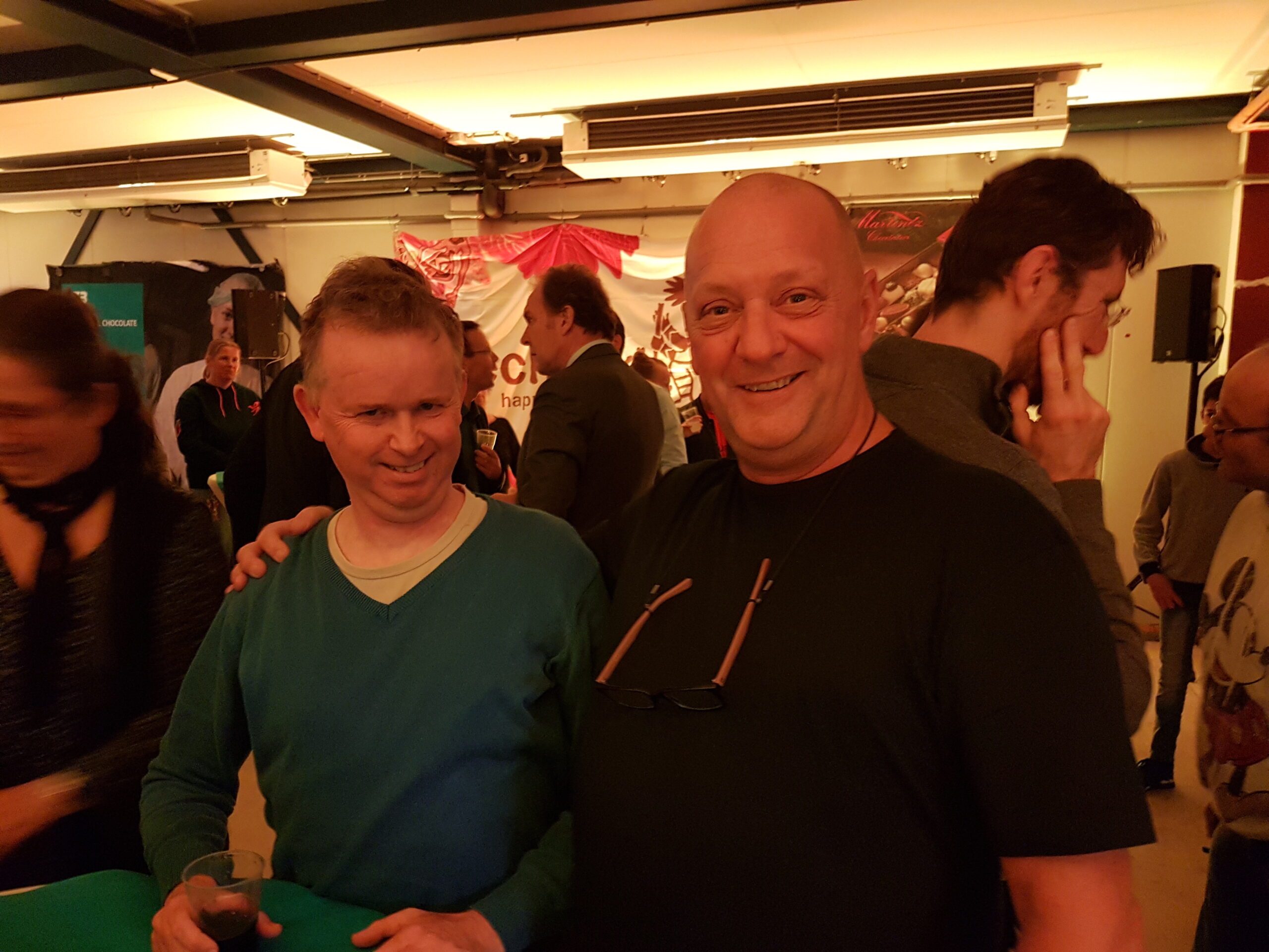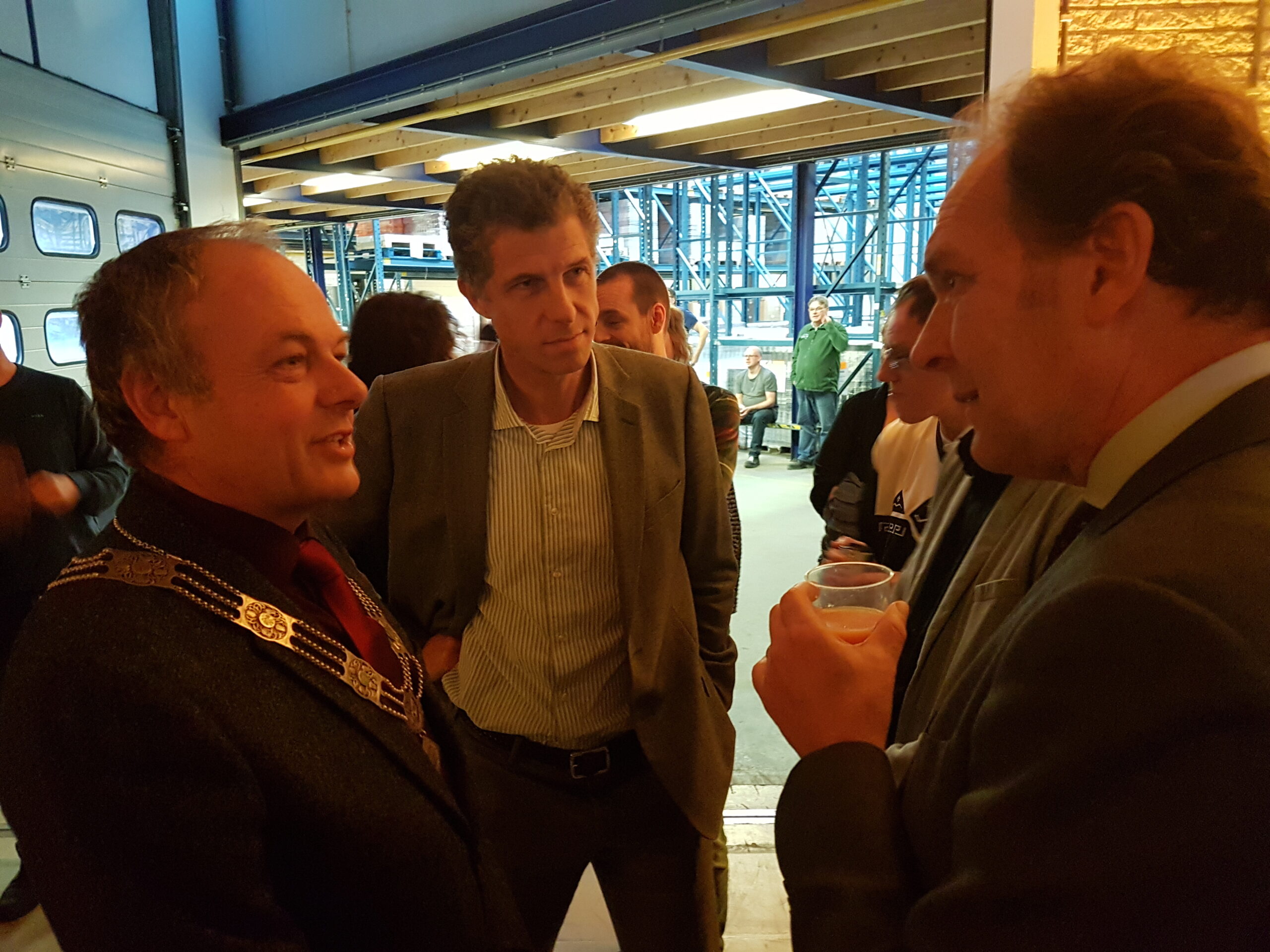 Chris de Waard ging even langs bij het jubileumfeest van de chocolade-afdeling van DZB en sprak er achtereenvolgens met directeur Bas van Drooge, wethouder Marleen Damen, burgemeester Lenferink en werknemer Martino.