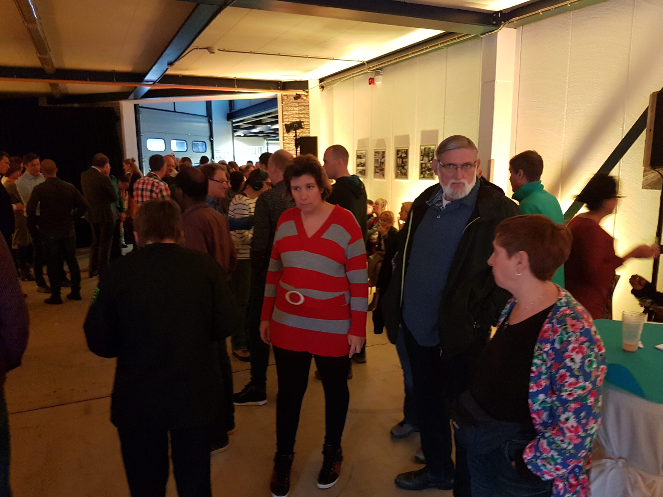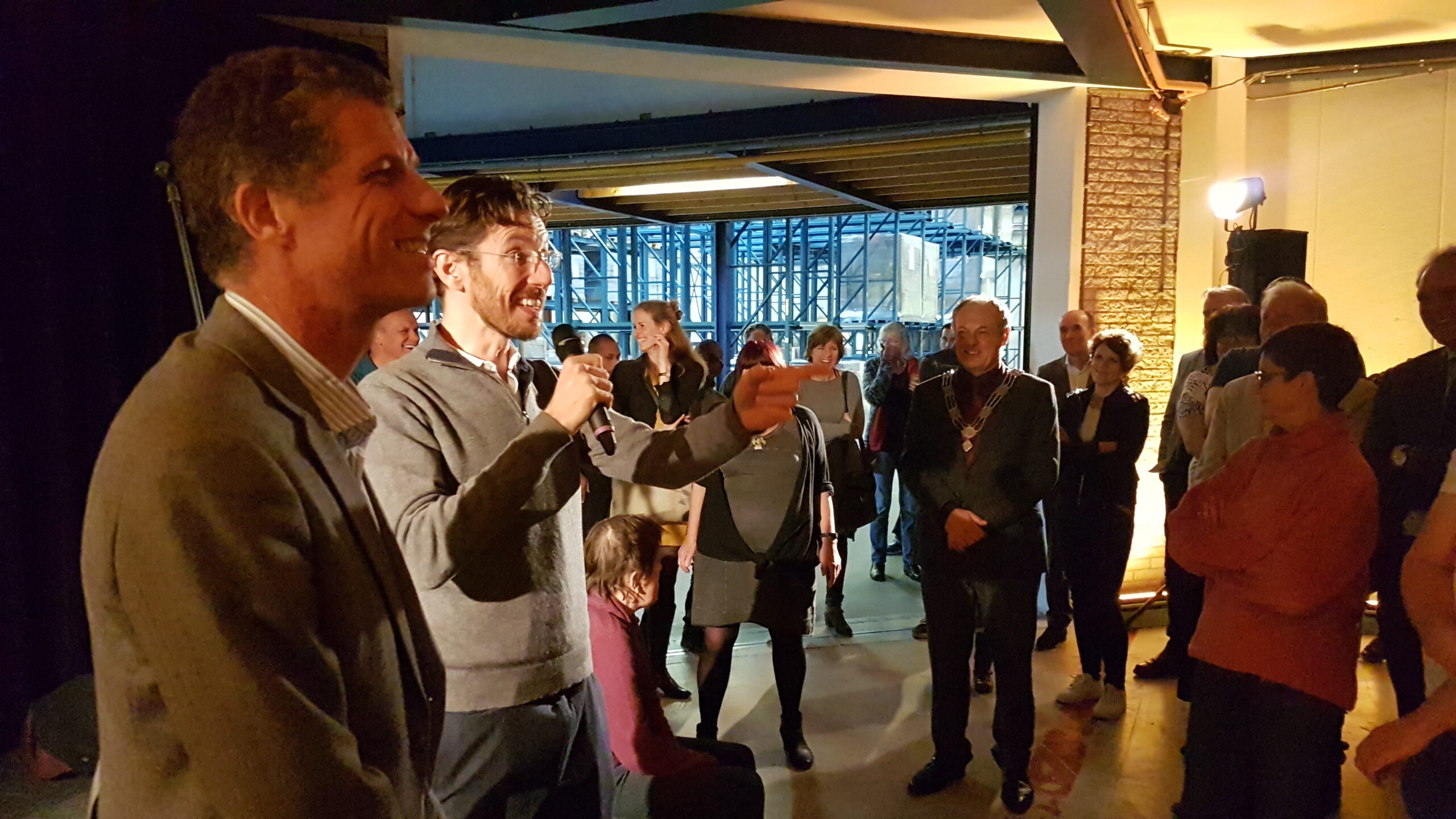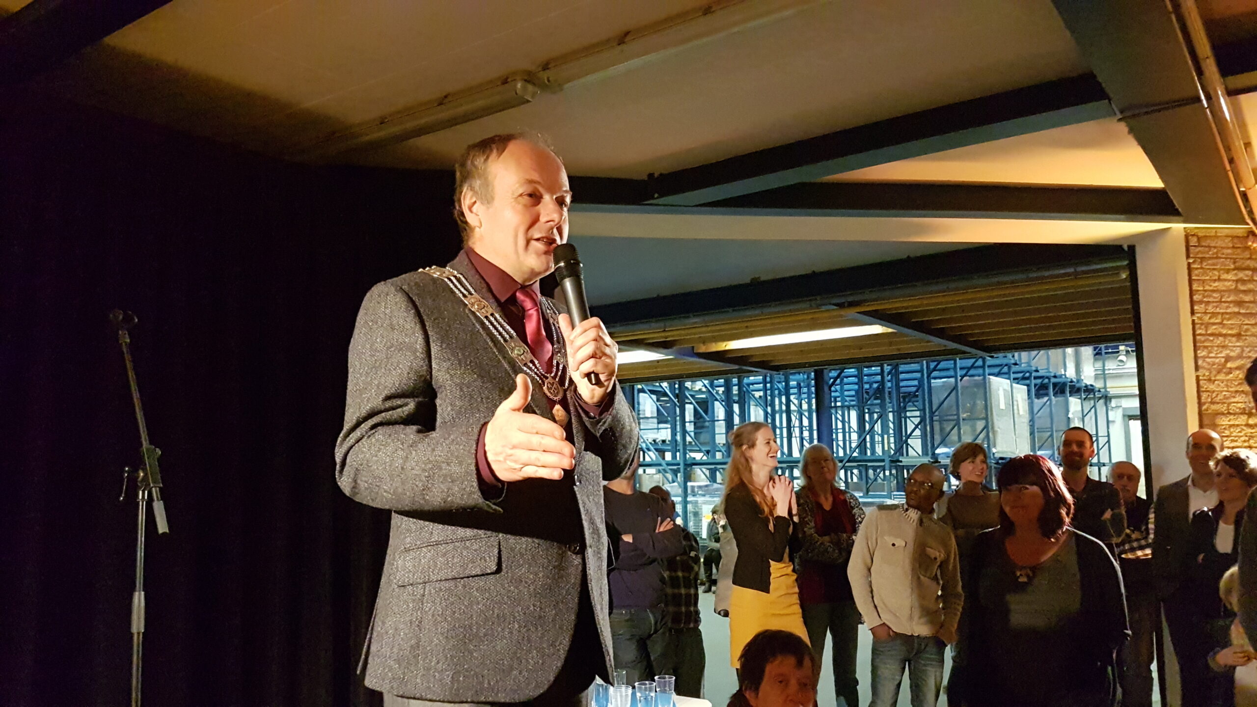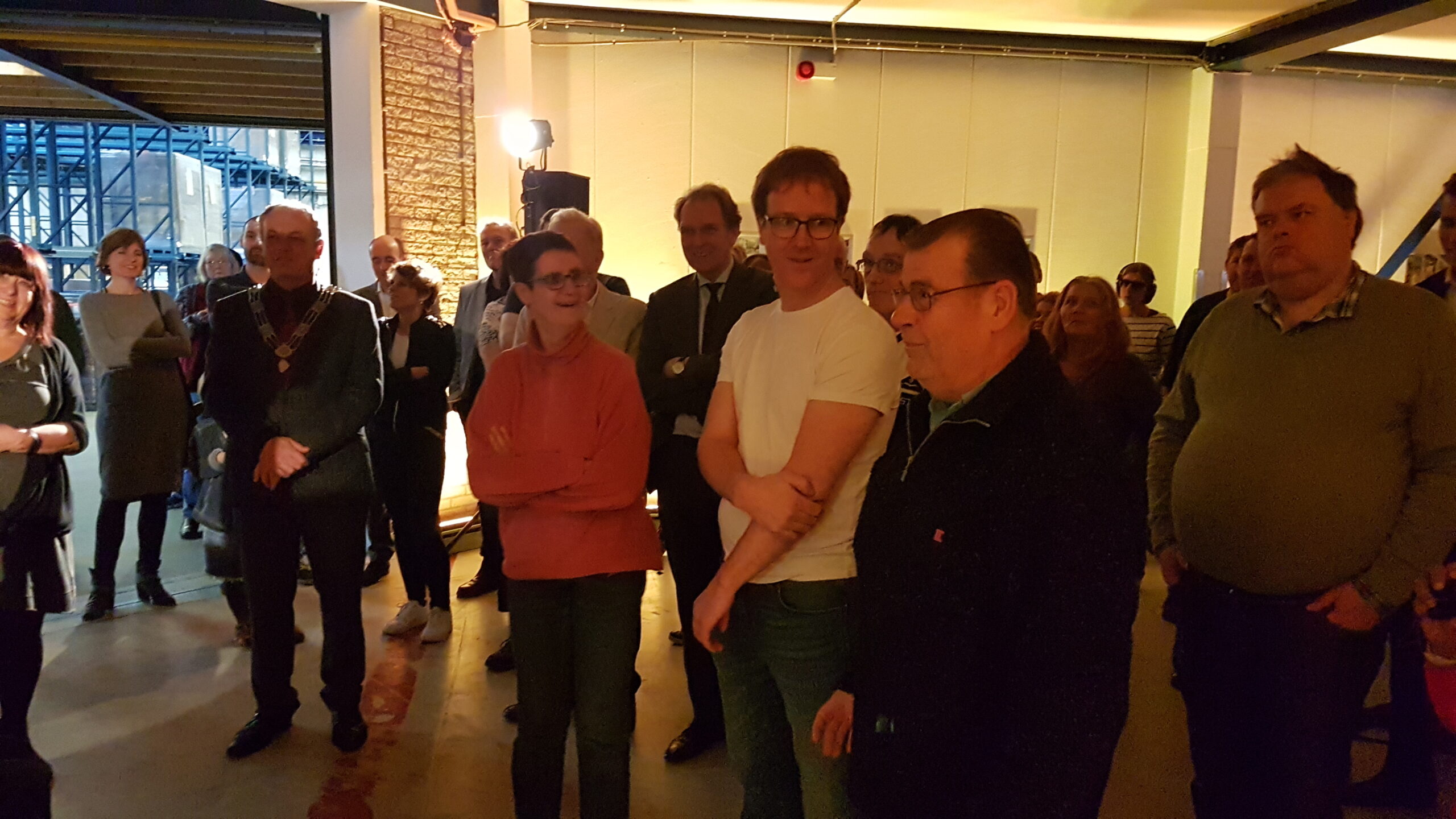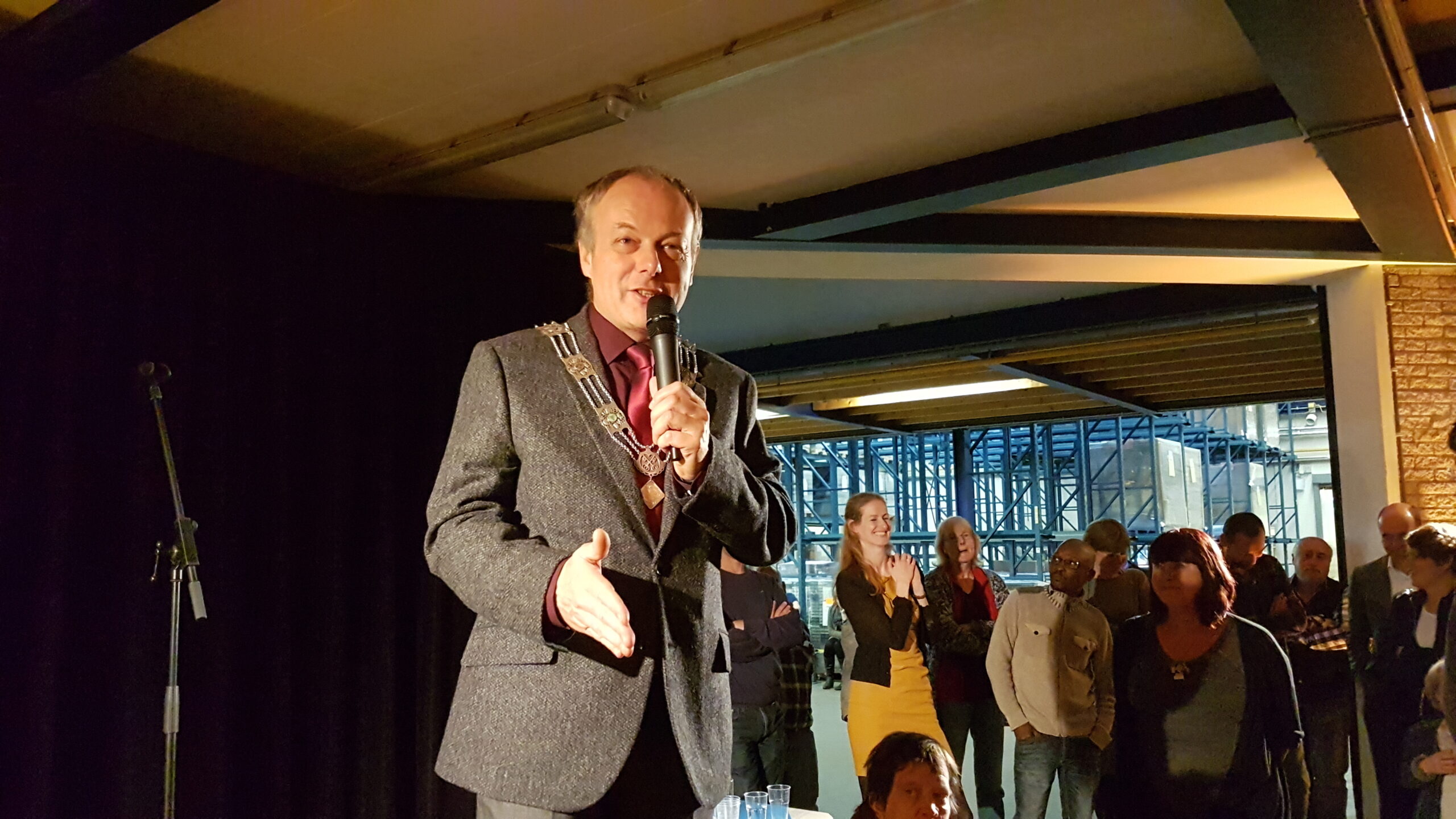 Chris de Waard ging even langs bij het jubileumfeest van de chocolade-afdeling van DZB en sprak er achtereenvolgens met directeur Bas van Drooge, wethouder Marleen Damen, burgemeester Lenferink en werknemer Martino.