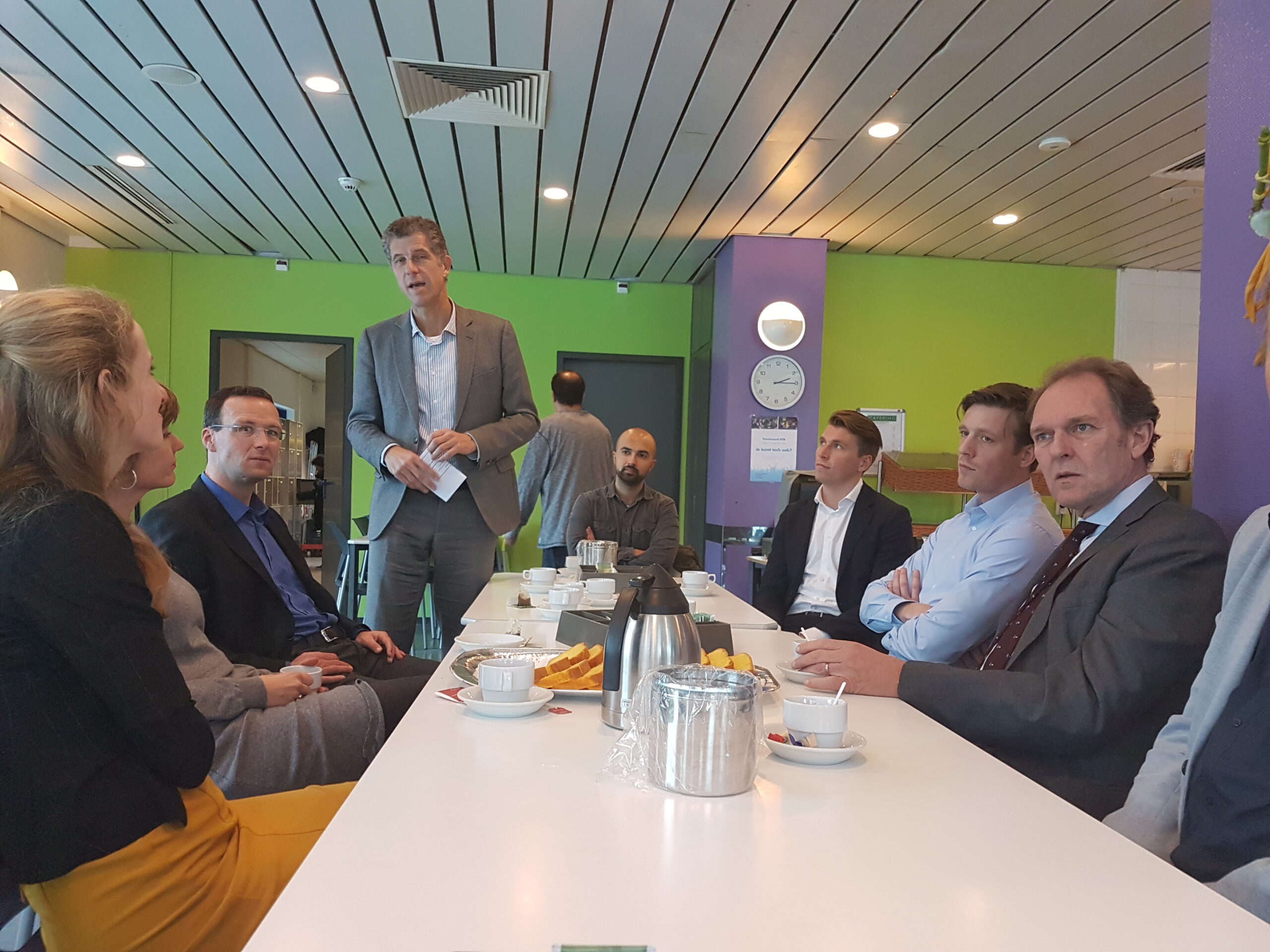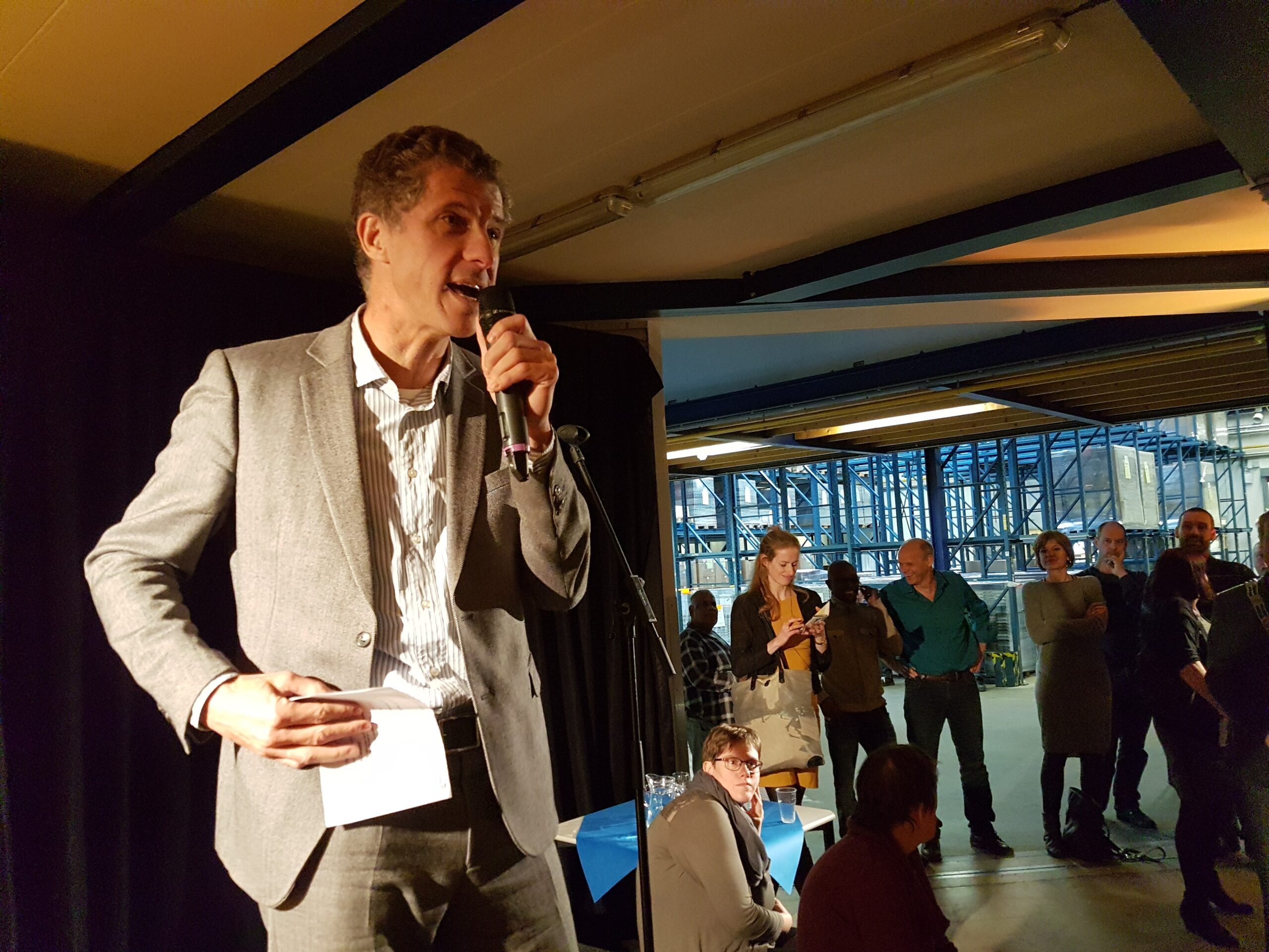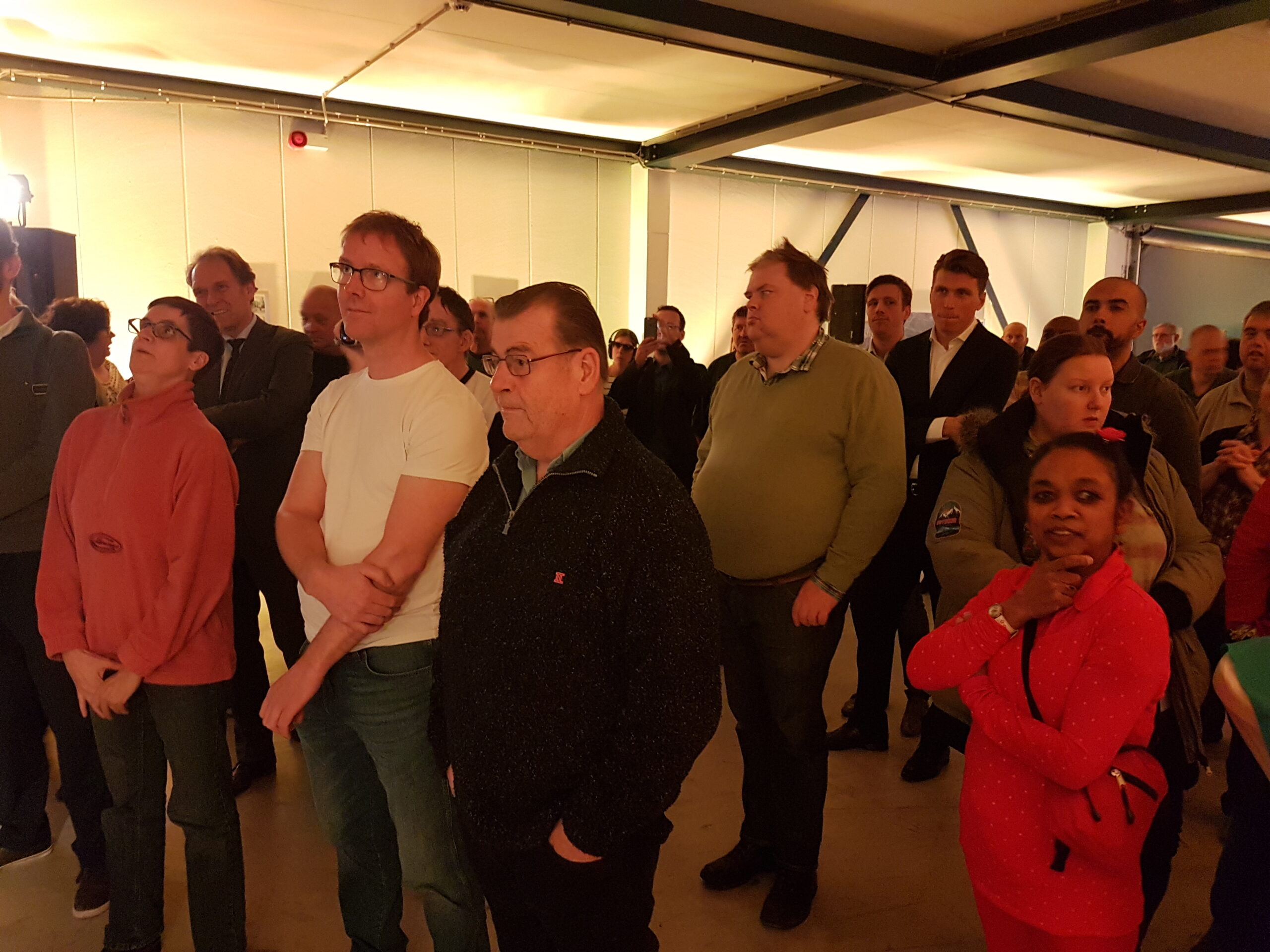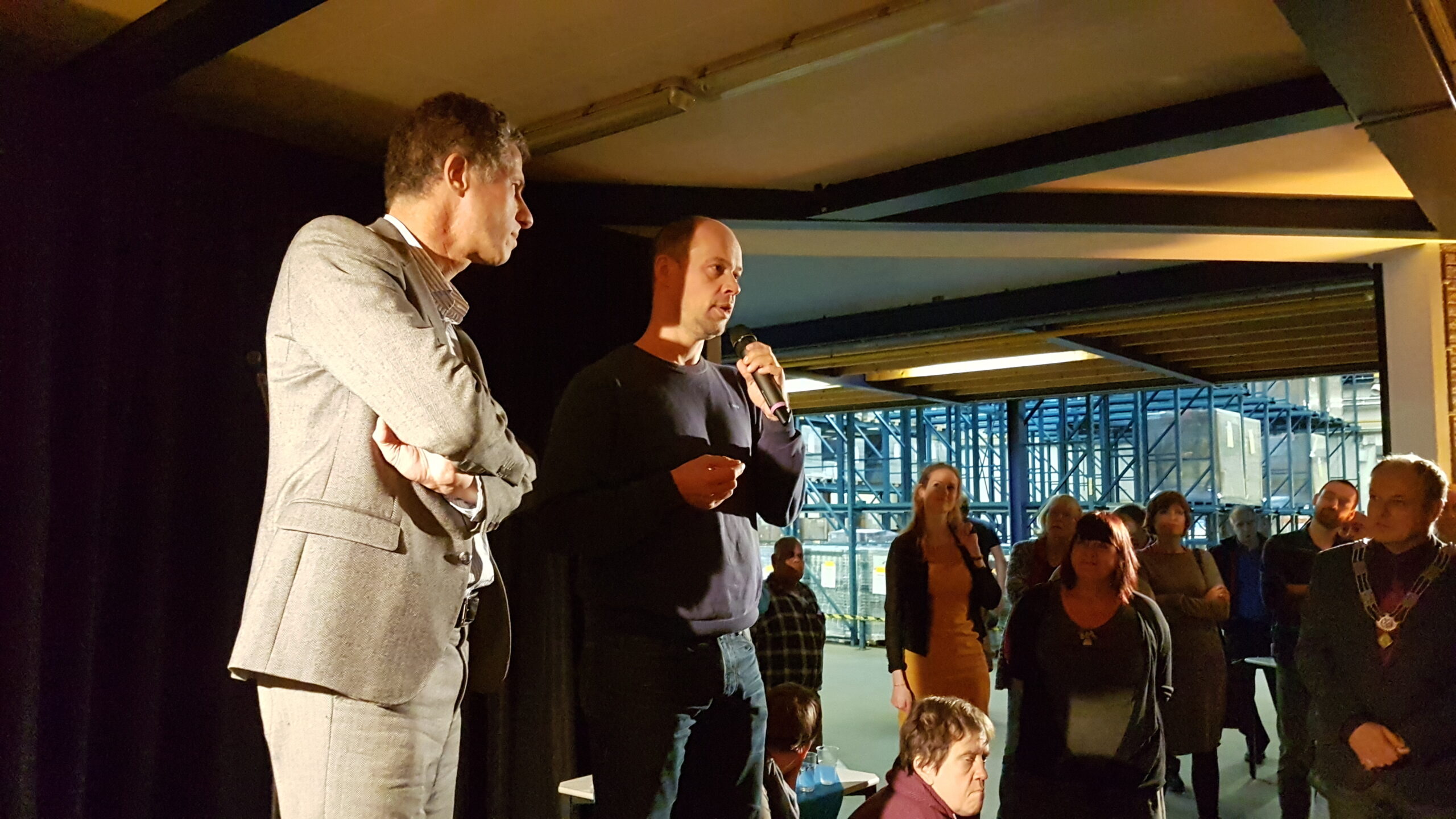 Chris de Waard ging even langs bij het jubileumfeest van de chocolade-afdeling van DZB en sprak er achtereenvolgens met directeur Bas van Drooge, wethouder Marleen Damen, burgemeester Lenferink en werknemer Martino.