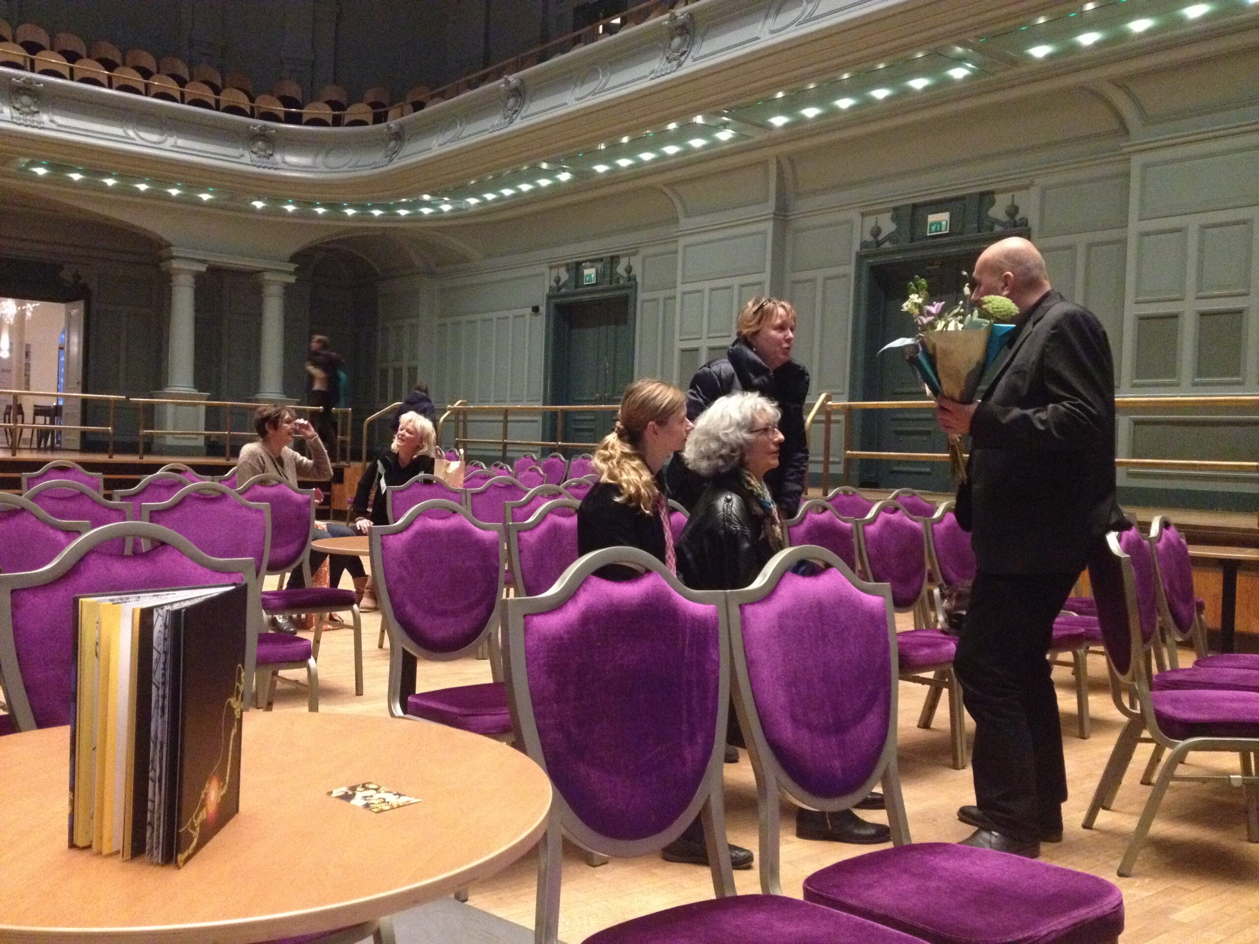 Misschien dat de vleugel waarop Van Veen aan het eind een stuk van Philip Glass speelde nog wel naar de foyer had kunnen worden gerold, maar voor Beernaerts performance was de foyer ongeschikt. En dus week Podium Pitch uit naar de grote zaal van de Stadsgehoorzaal in Leiden. Die is veel groter dan de foyer, en eigenlijk ook veel te groot voor de hoeveelheid bezoekers van Podium Pitch. Maar door de stoelopstelling vlak voor het podium en het feit dat je in het algemeen naar vóren kijkt, bleek dat geen enkel probleem. Het gaf Beernaerts dan wel de ruimte voor haar dans; het publiek moest over de interviewopstelling op het voortoneel heen kijken om haar te kunnen zien.