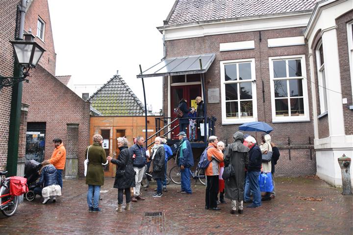 Wethouder Paul Laudy legt uit in welke fase het project verkeert. Ook ontving hij nog een ‘cadeau’ van het actiecomité. Een prent van zichzelf met daaronder de tekst ‘Laudy wil indikken’.