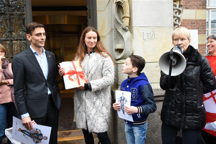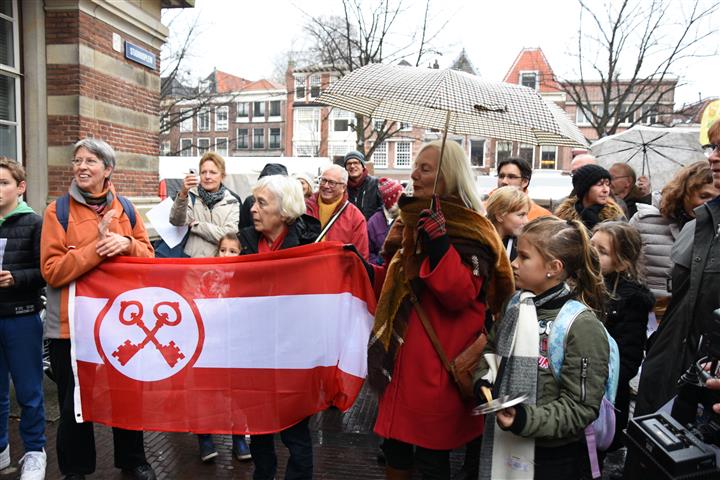 Met een toeters en bellen liep het Actiecomité Oostprofessorenwijk woensdag met een ‘feestelijke optocht’ van De Burcht naar het stadhuis. Daar stond een aantal raadsleden klaar om het comité te ontvangen. D66-raadslid Fleur Spijker nam namens de gemeenteraad de 822 handtekeningen in ontvangst. “We gaan hier goed naar kijken”, zegt Spijker over de enorme stapel handtekeningen. “Het is heel belangrijk dat er goed geluisterd wordt naar de burger.”