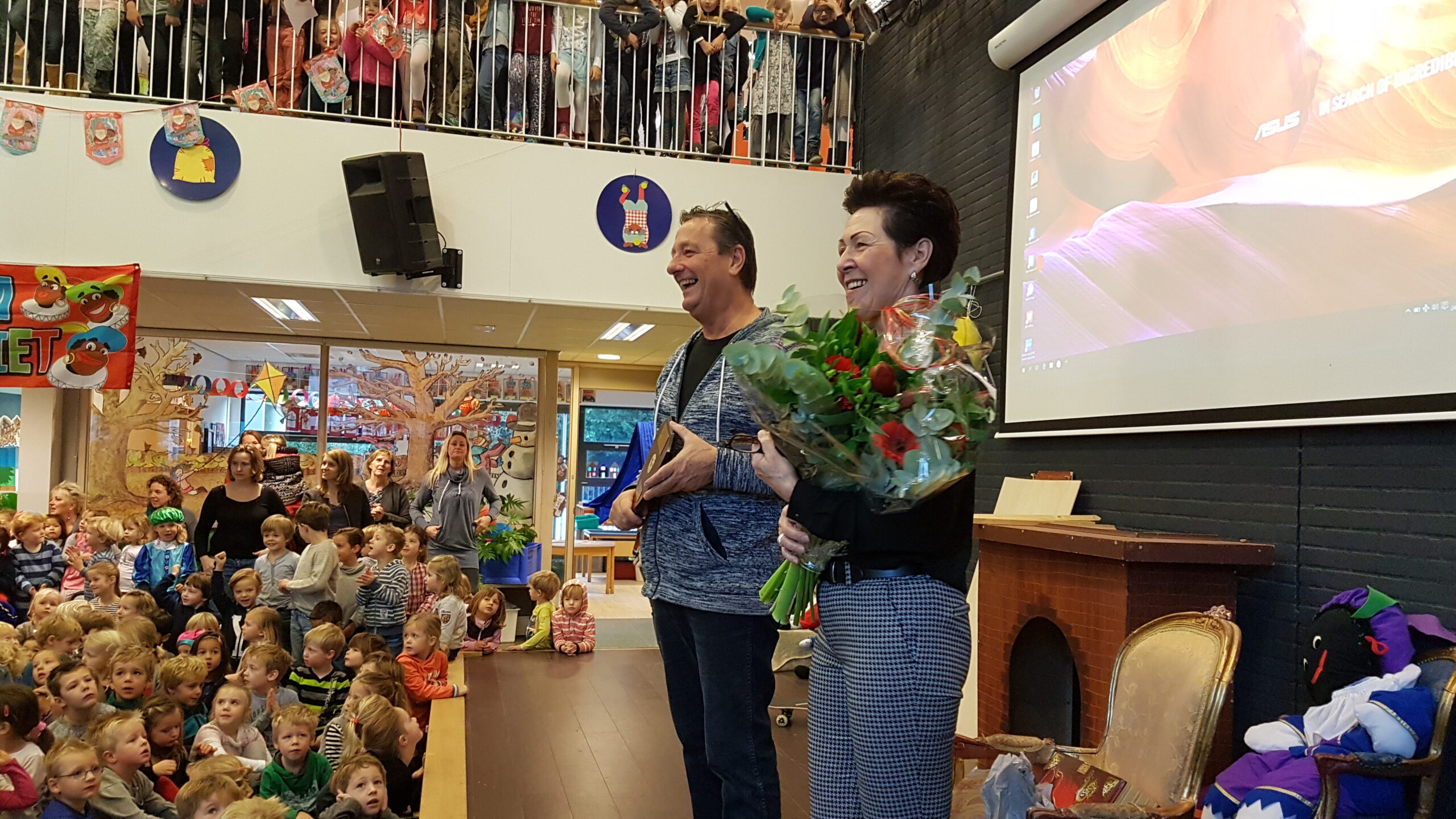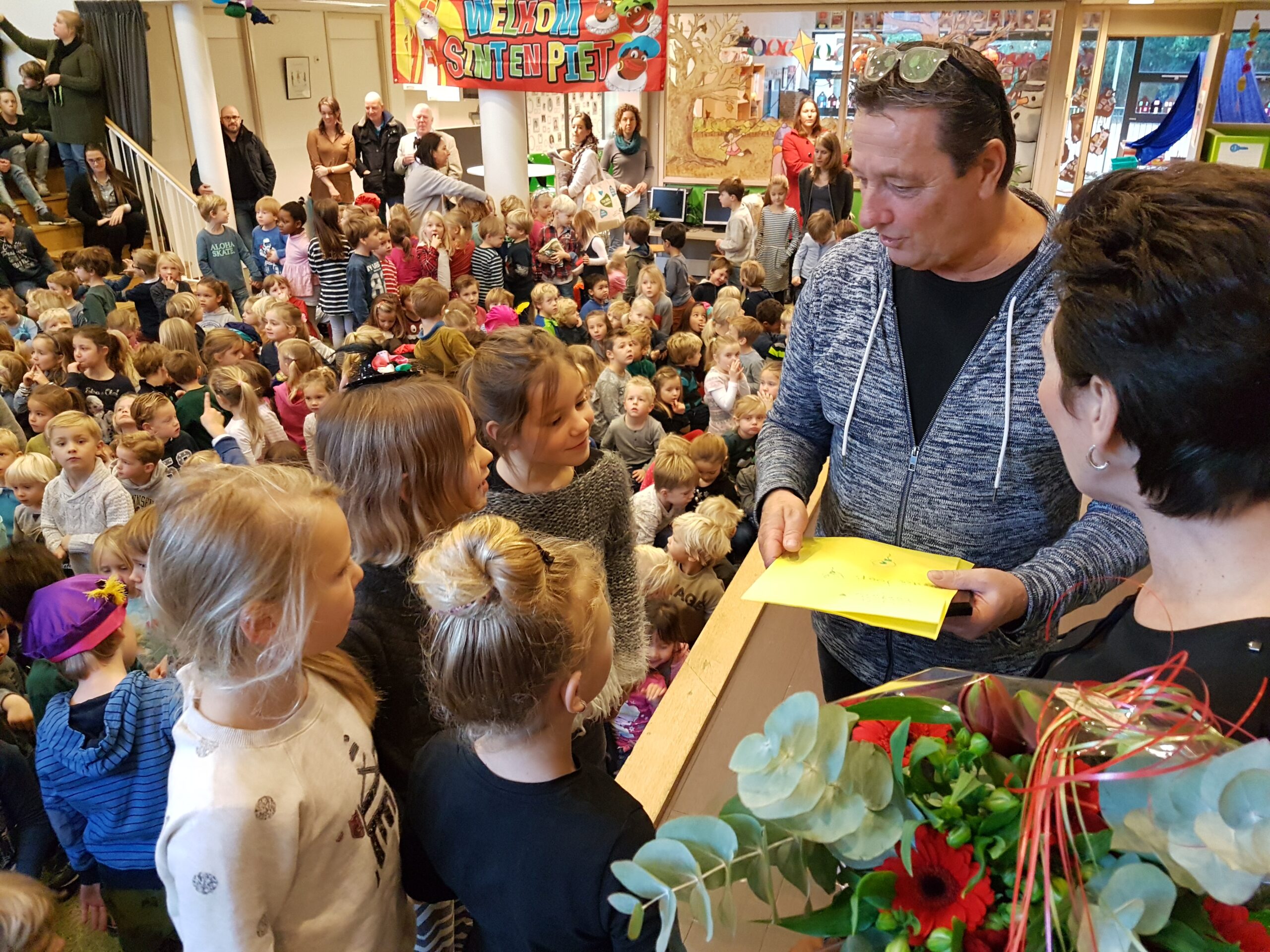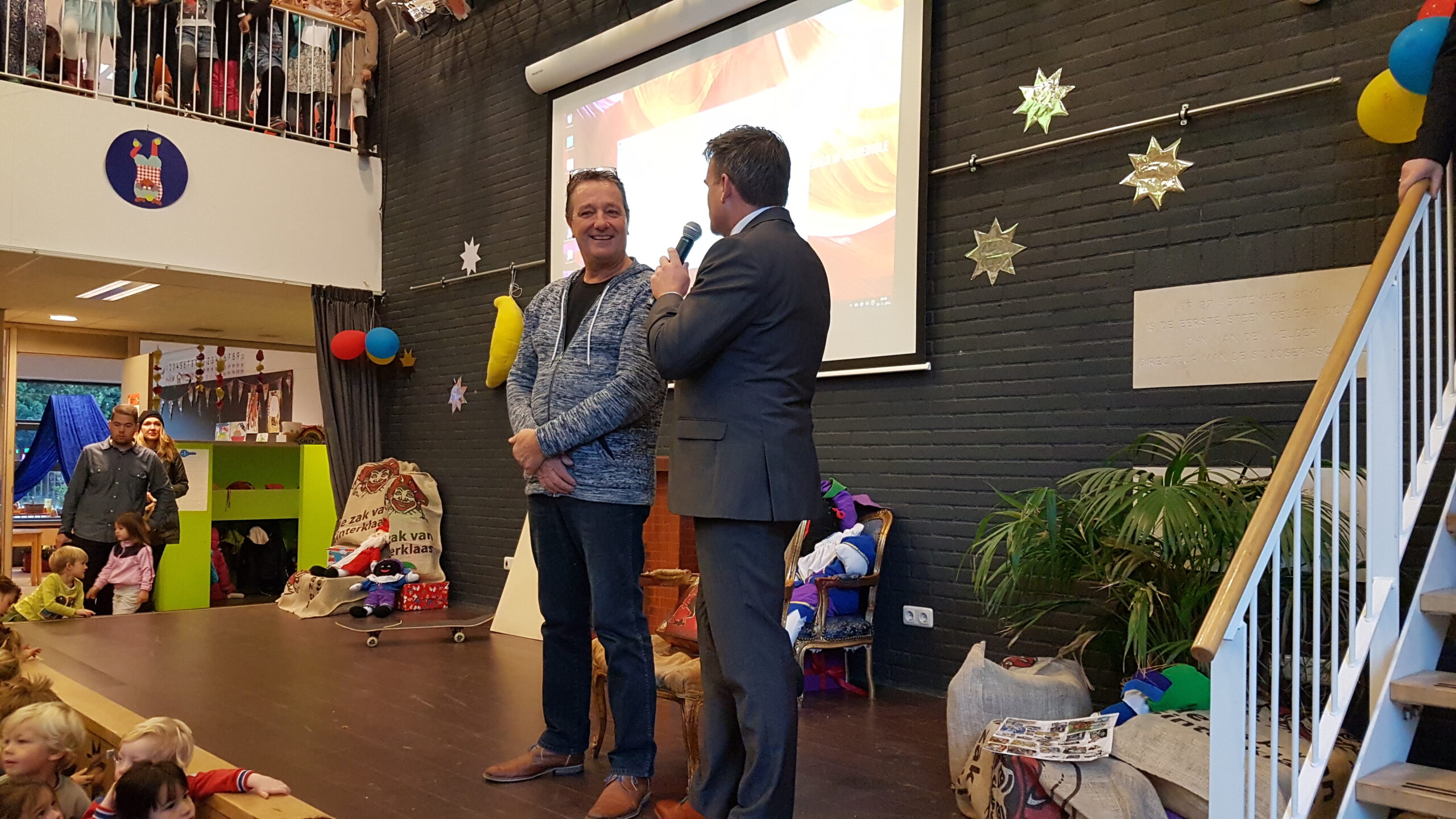 Chris de Waard ging vanmorgen gewapend met microfoon naar de uitreiking in de St. Josephschool en sprak met Joop, zijn vrouw Carla, directeur Monica, wethouder Paul Dirkse en natuurlijk met enkele leerlingen van de school.
