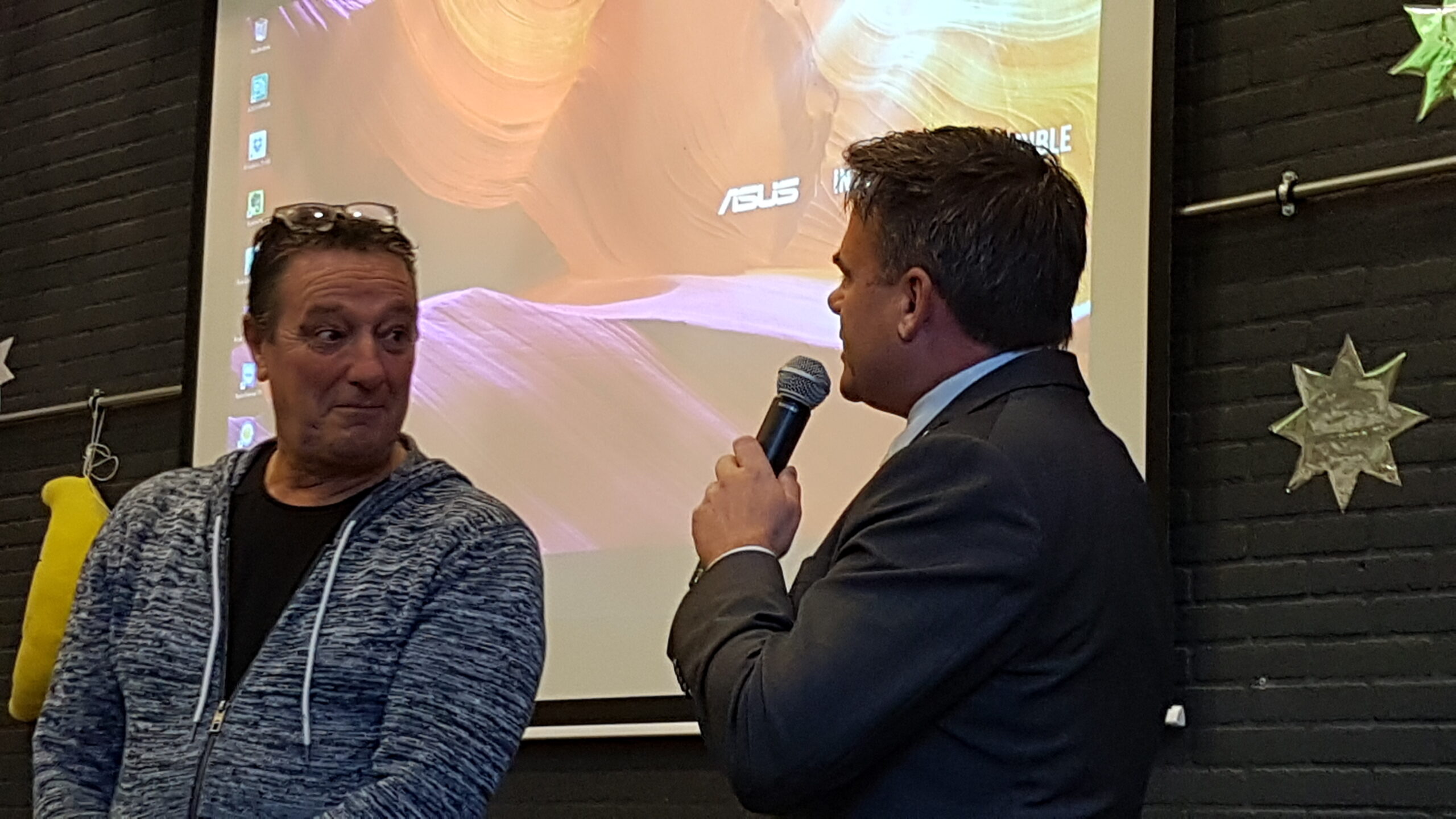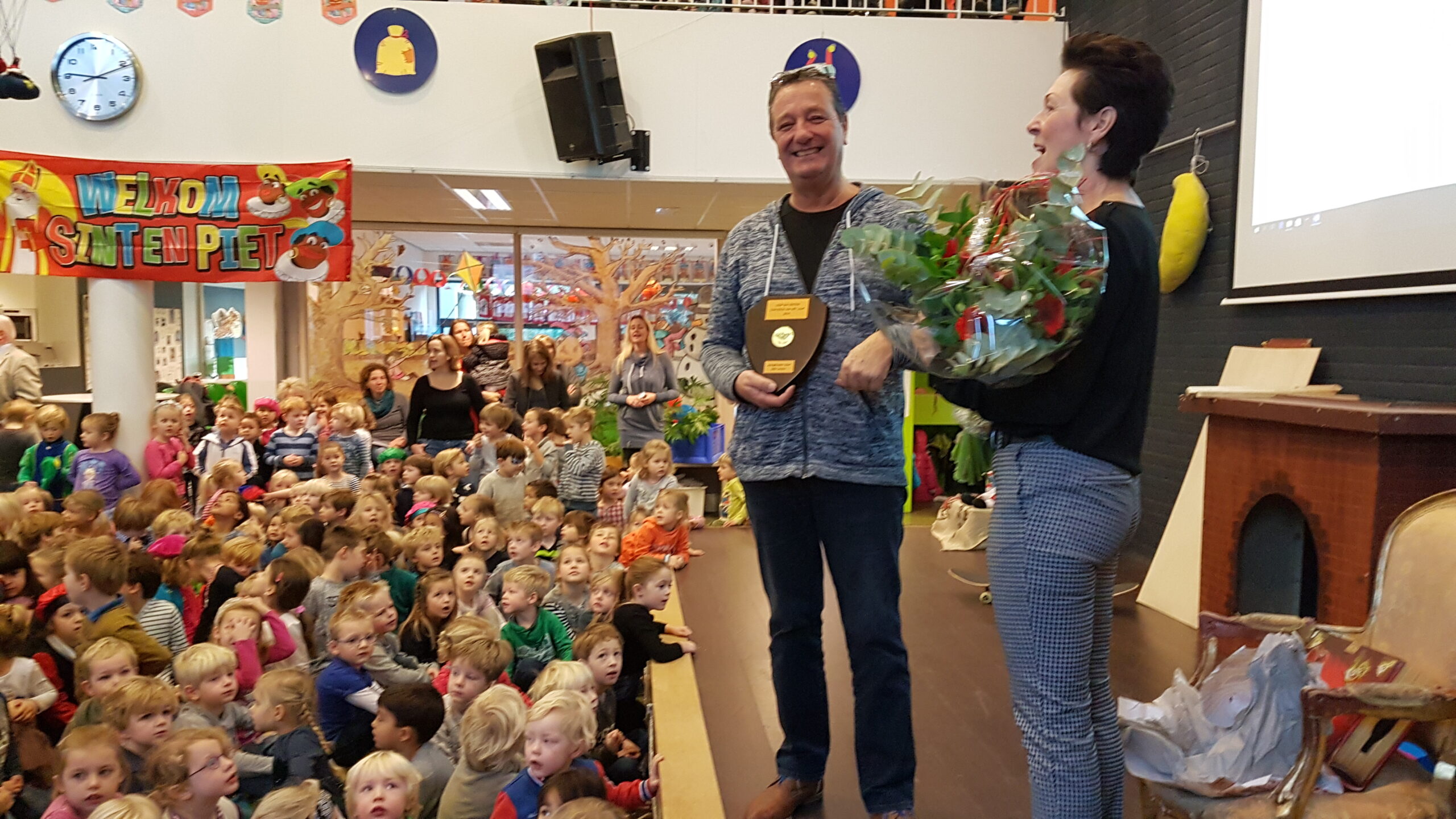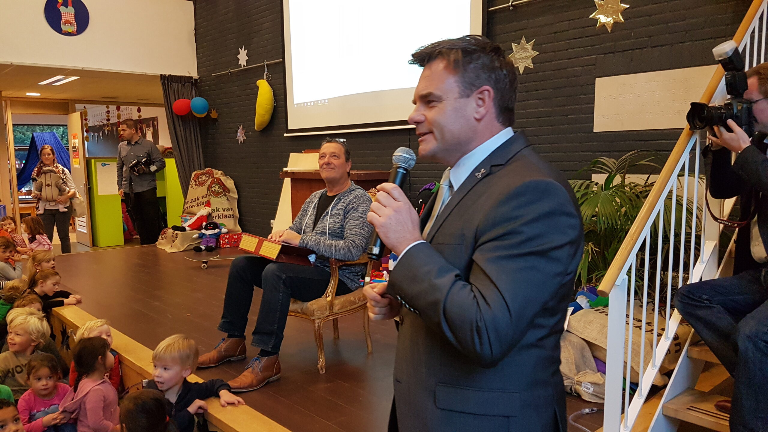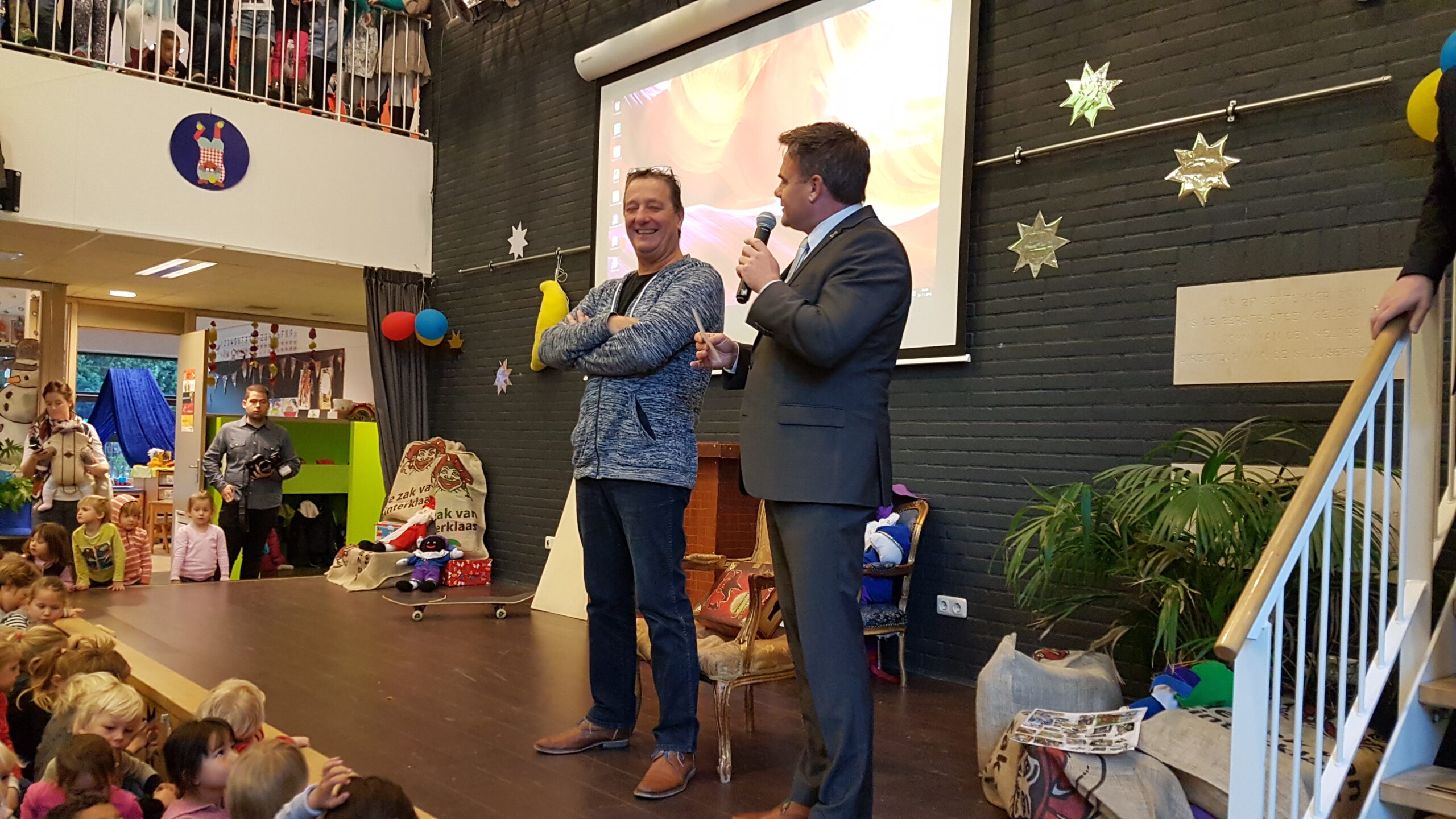 Chris de Waard ging vanmorgen gewapend met microfoon naar de uitreiking in de St. Josephschool en sprak met Joop, zijn vrouw Carla, directeur Monica, wethouder Paul Dirkse en natuurlijk met enkele leerlingen van de school.