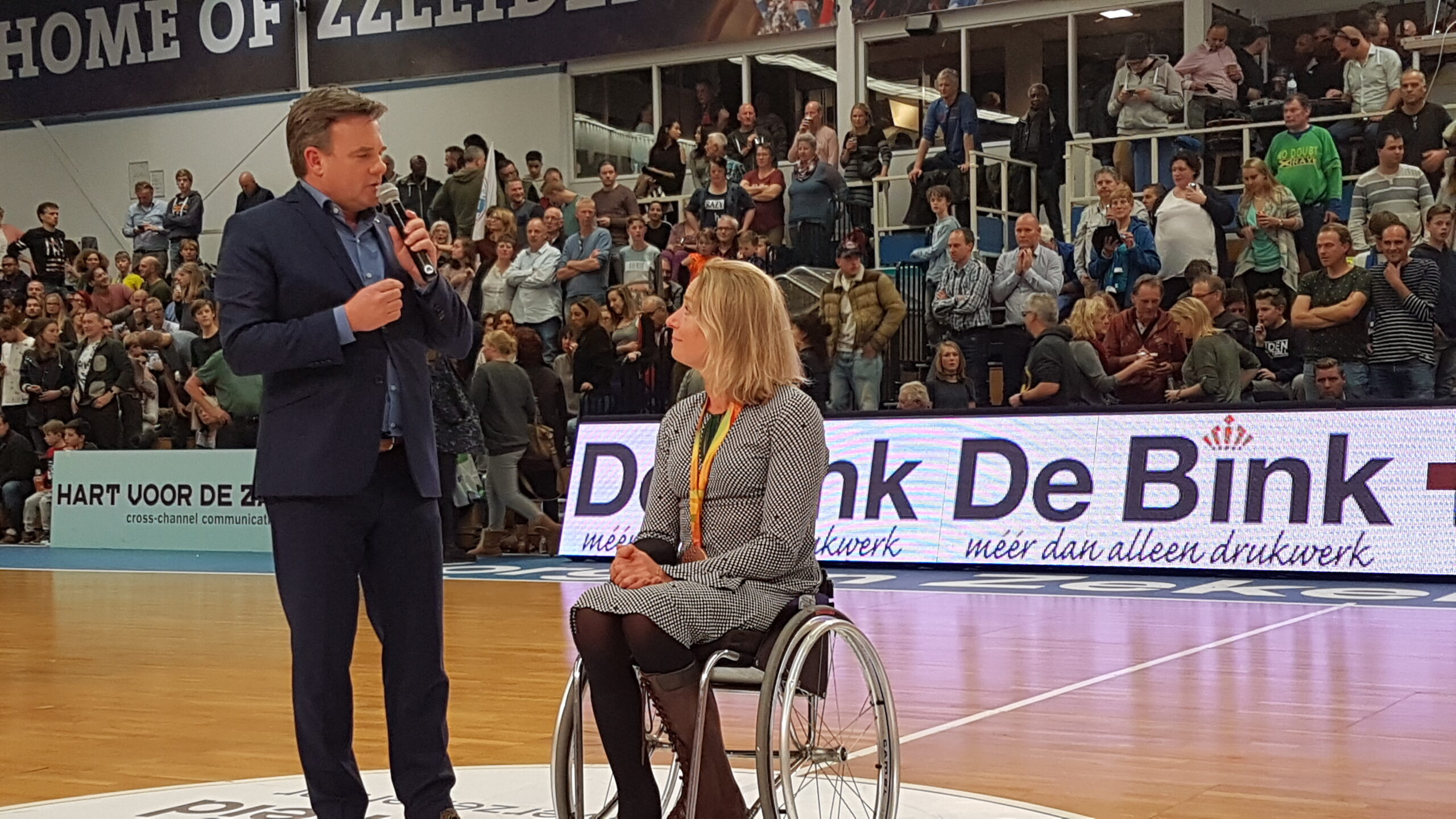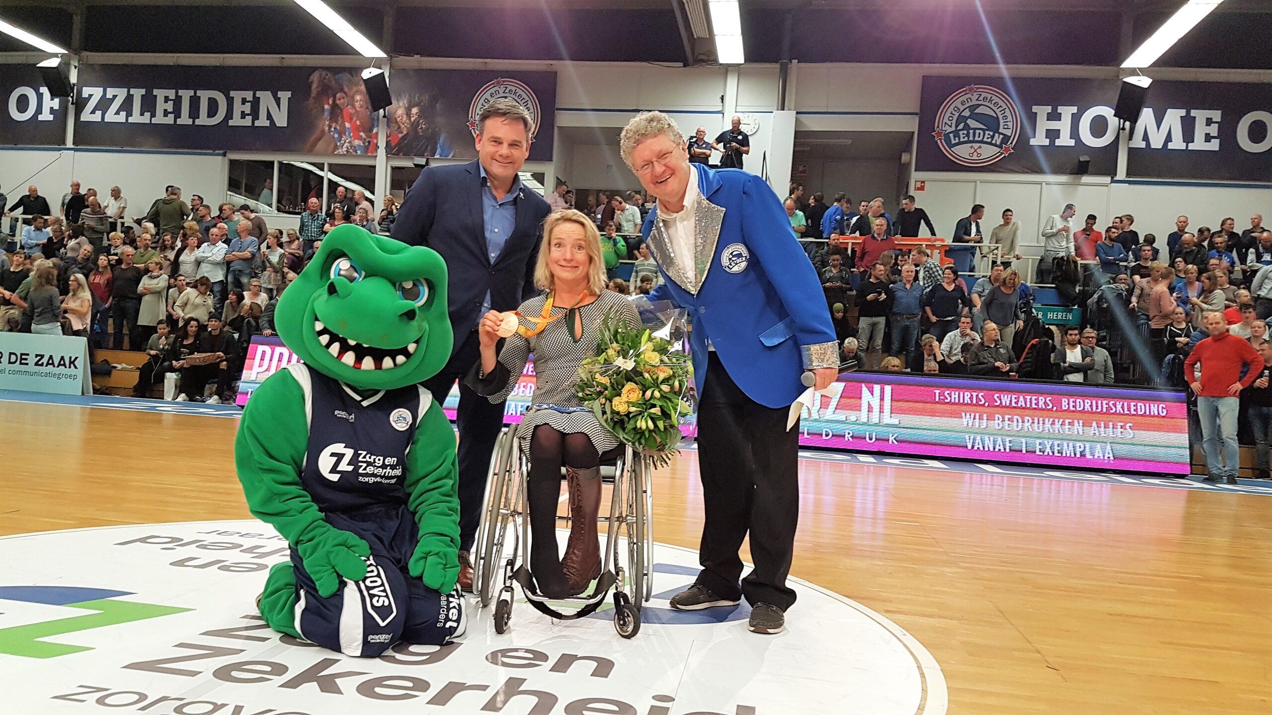 Zaterdagavond werd paralympisch rolstoelbasketbalster Evelyn van Leeuwen gehuldigd in de rust van de basketbalwedstrijd ZZ Leiden tegen Donar Groningen. Van Leeuwen miste de eerdere huldiging omdat ze met haar gezin een vakantie vastplakte aan het verblijf in Brazilië, maar nu werd ze alsnog in het zonnetje gezet door sportwethouder Dirkse.